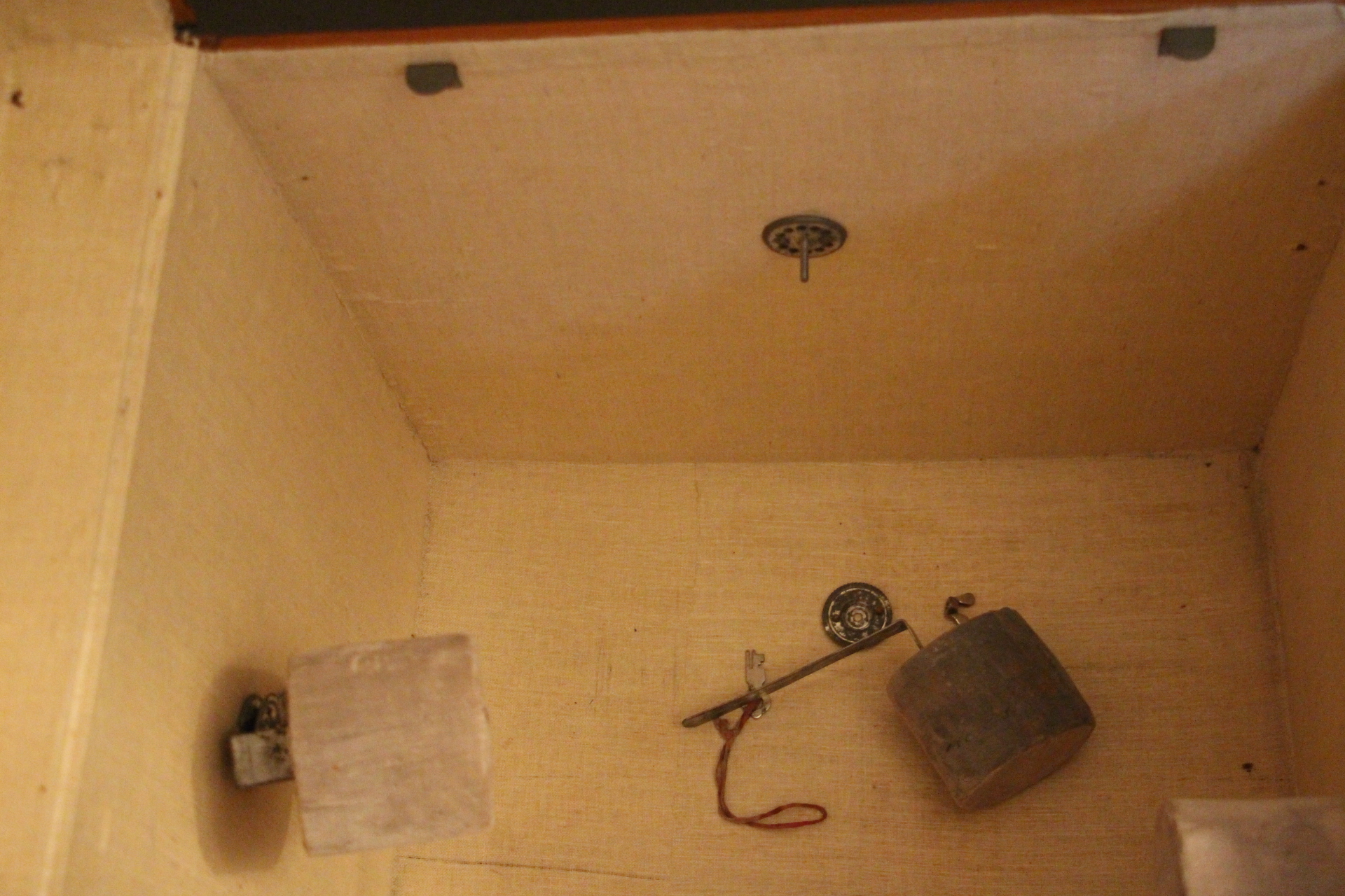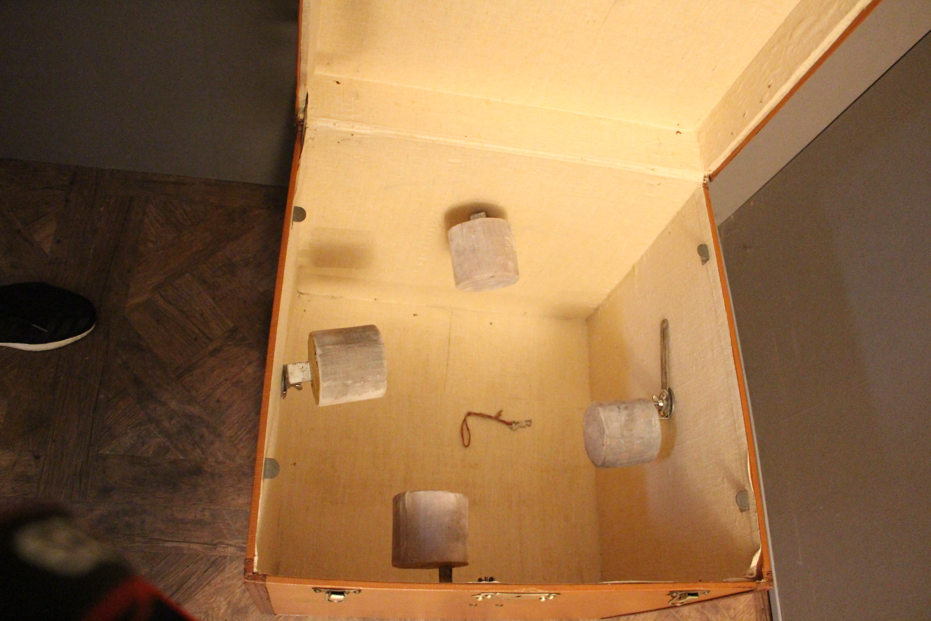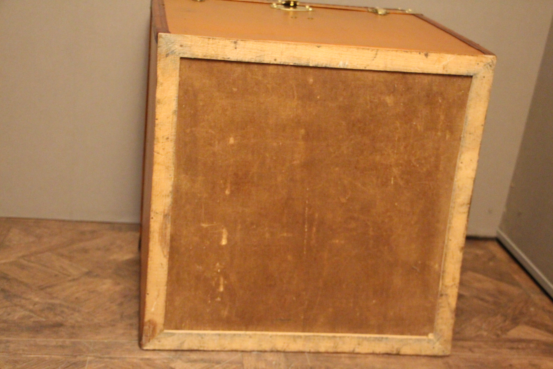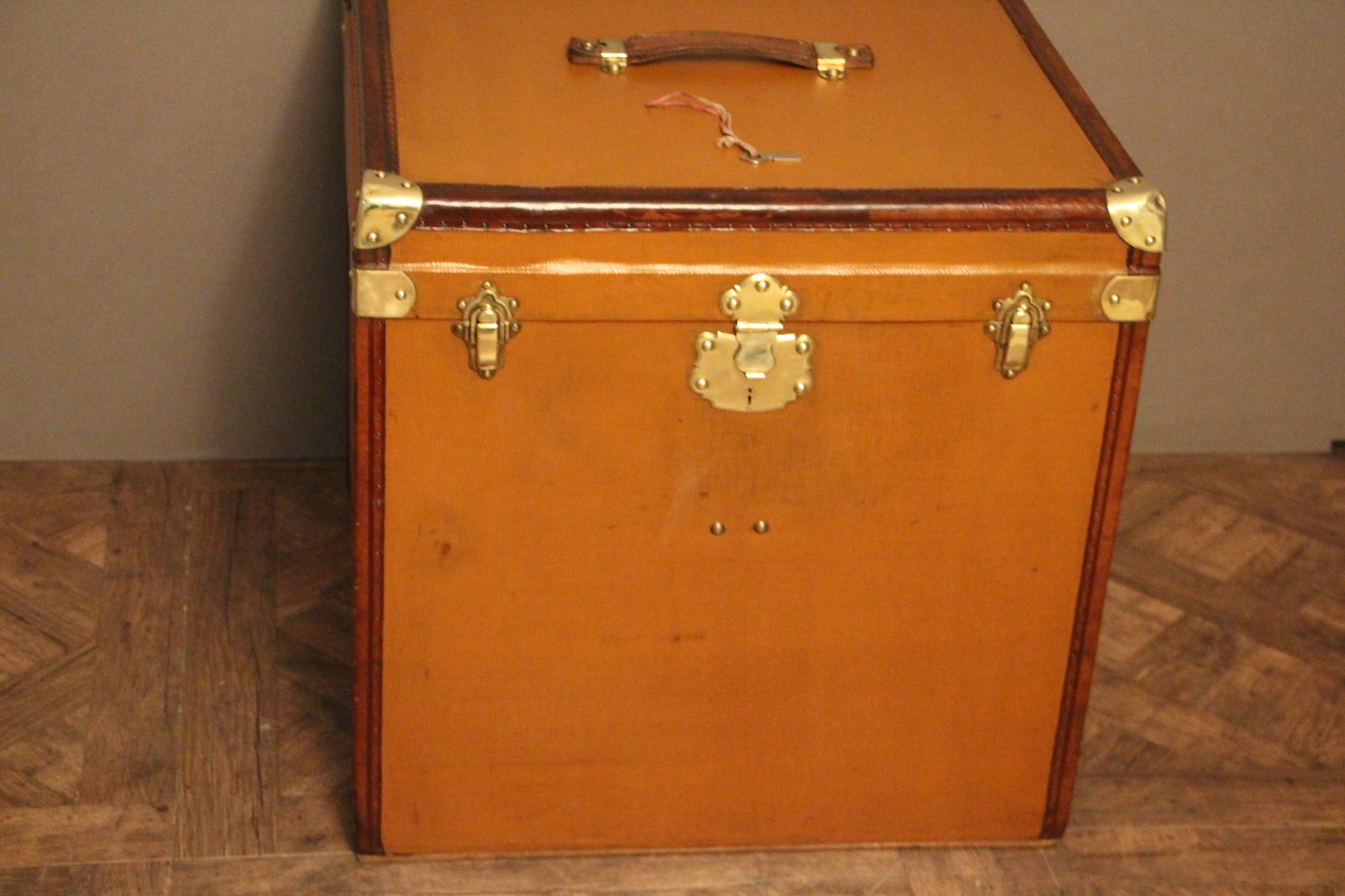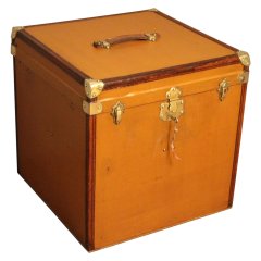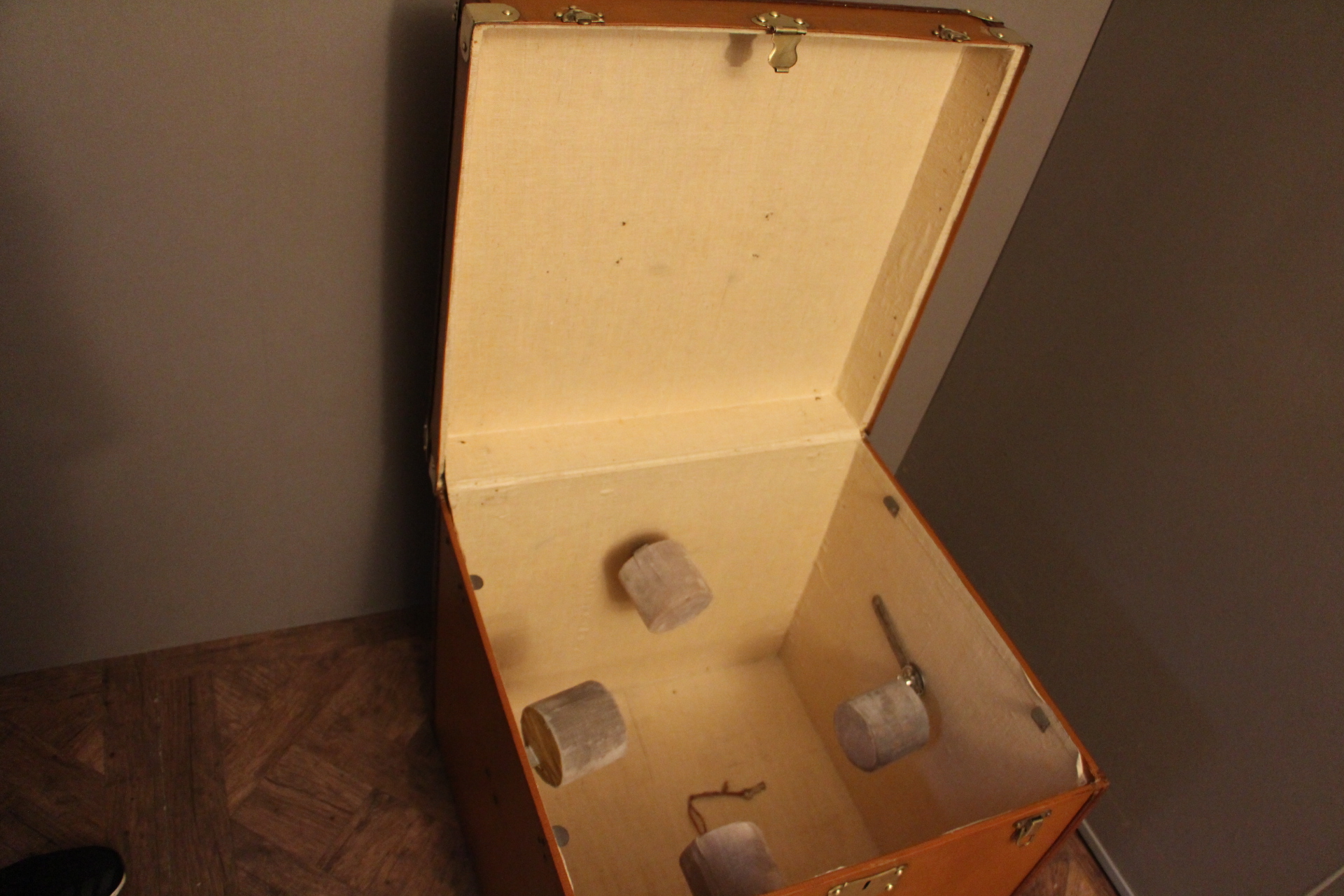 L’intérieur, entièrement d’origine, est équipé de quatre porte-chapeaux amovibles pour une organisation impeccable. La serrure et les clapets en laiton ajoutent une touche d’élégance à cette pièce unique, parfaite pour les collectionneurs d’objets de voyage.