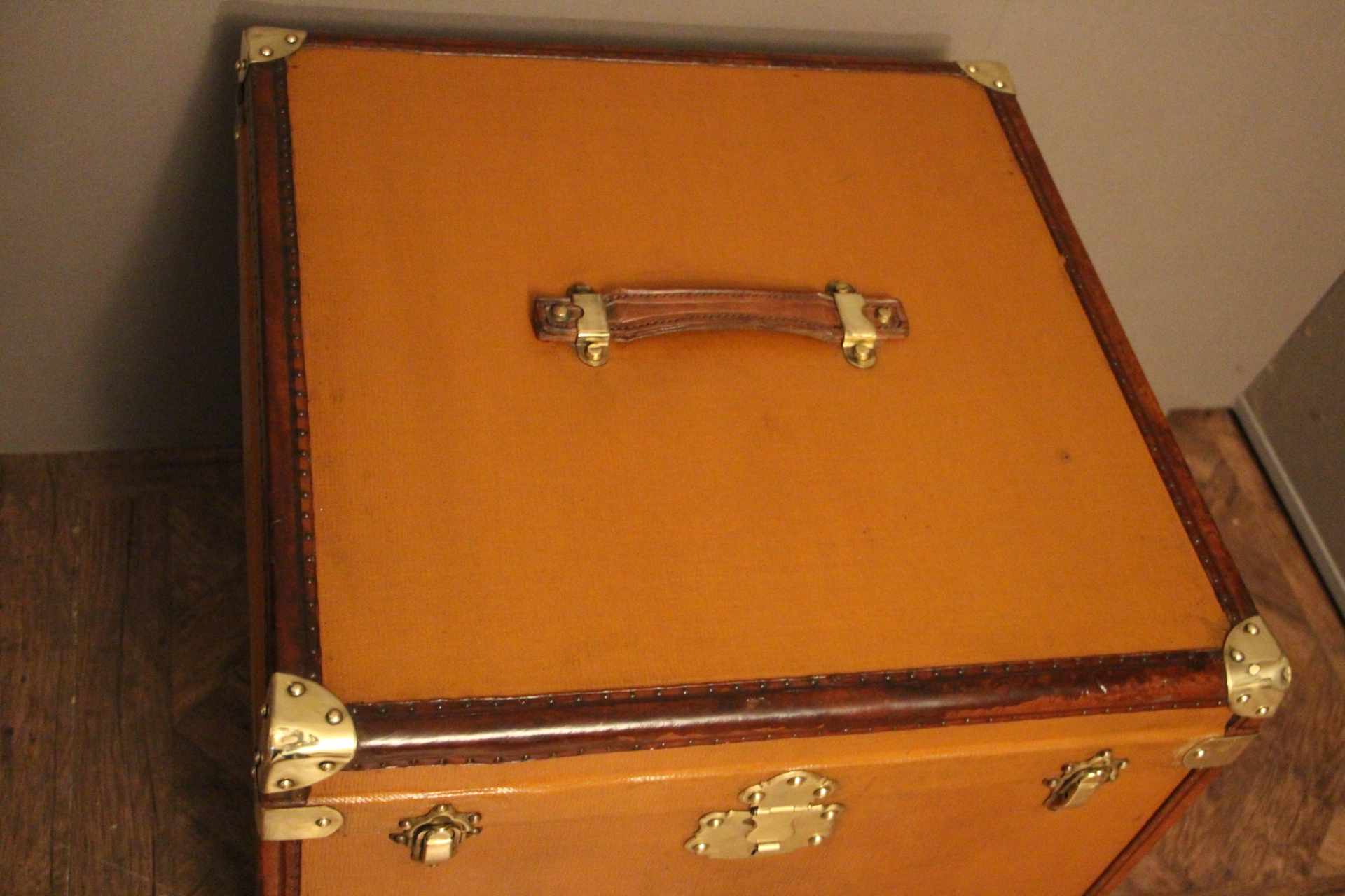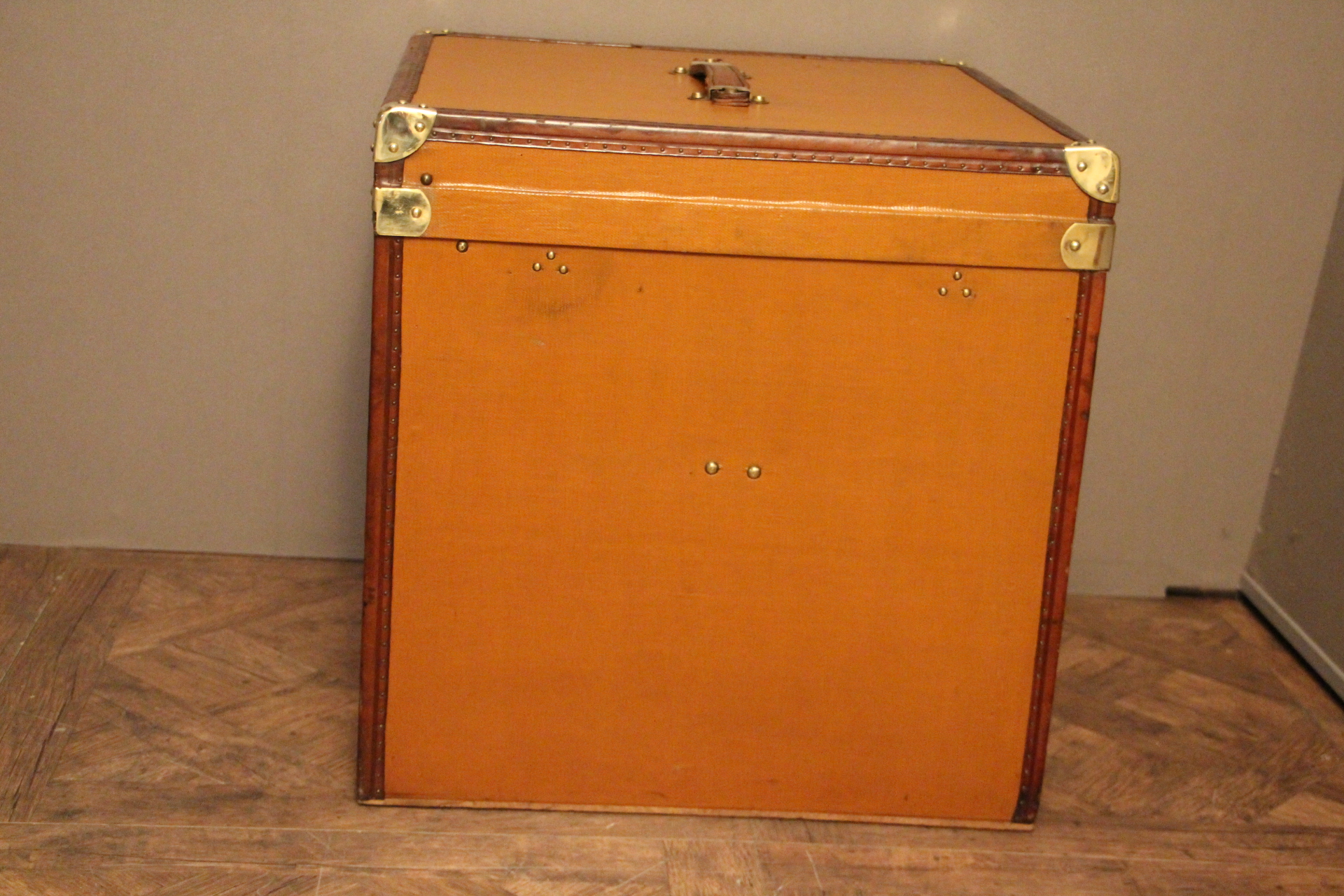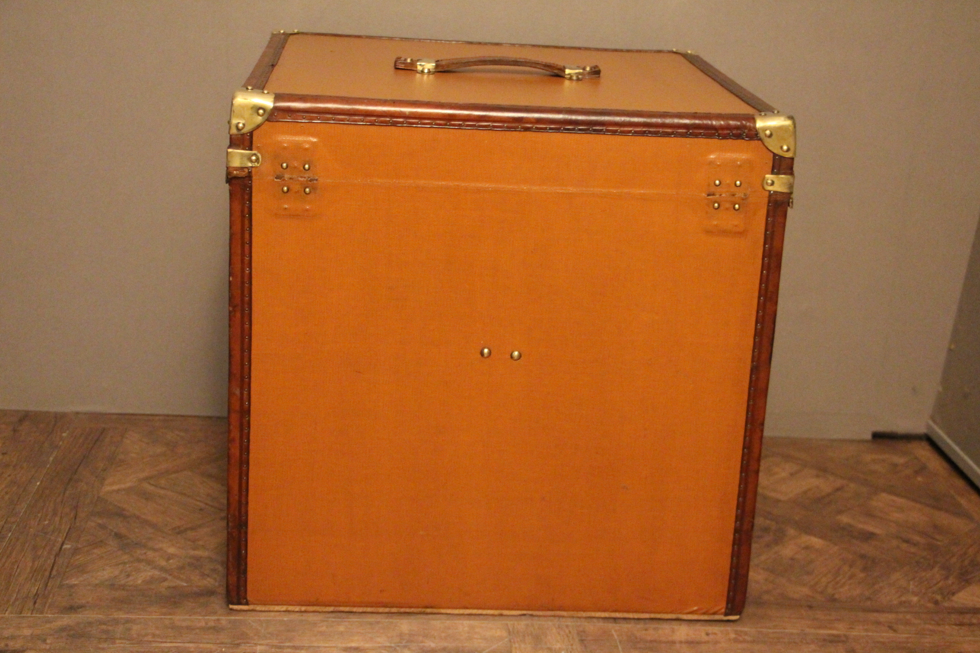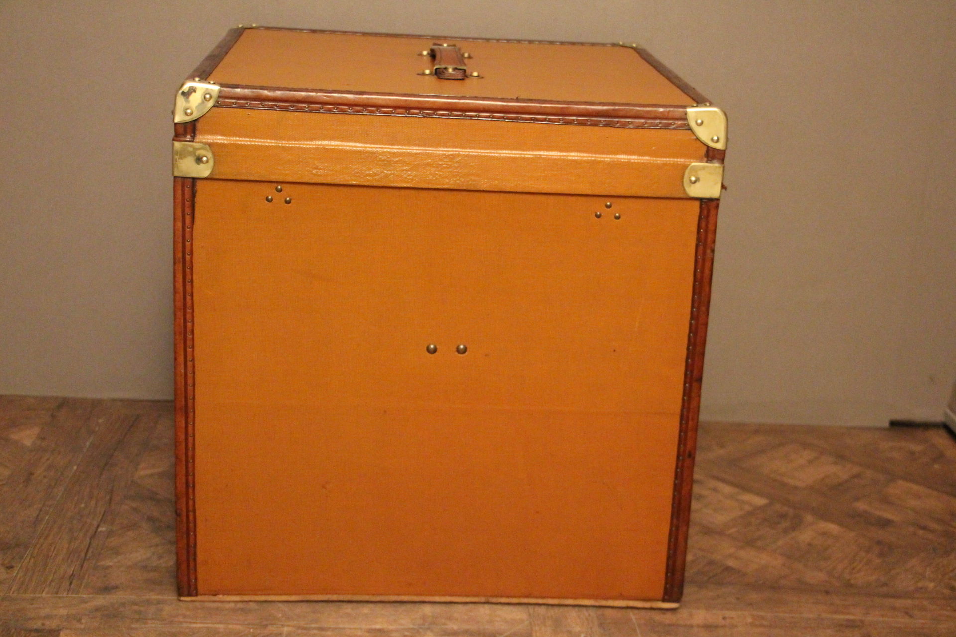 Magnifique malle à chapeaux des années 1930, un véritable écrin pour vos couvre-chefs. Réalisée en toile marron orangé clair, elle arbore des finitions raffinées avec ses bordures en cuir, sa poignée en cuir et ses coins en laiton massif.