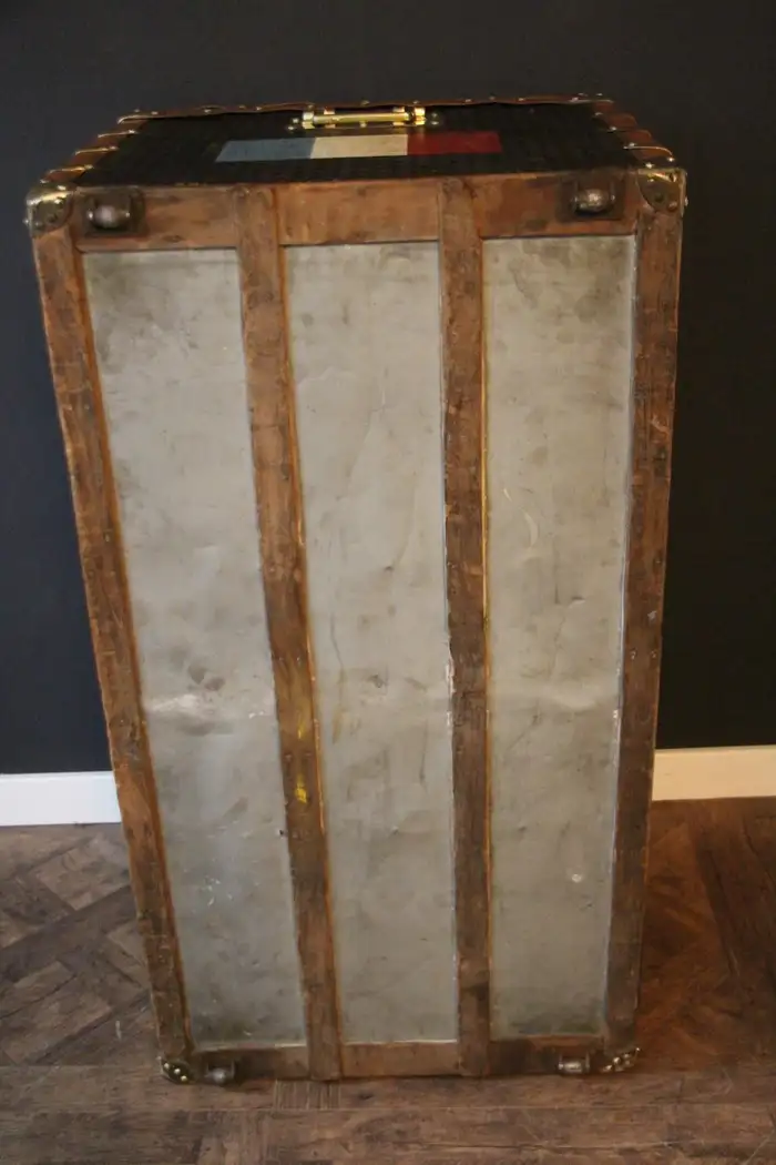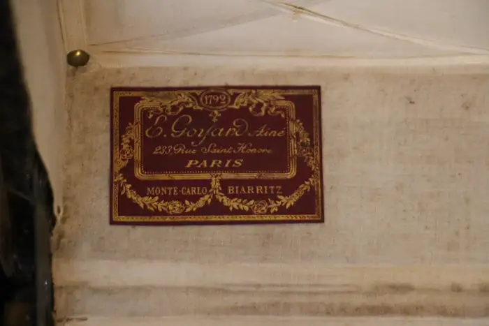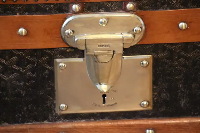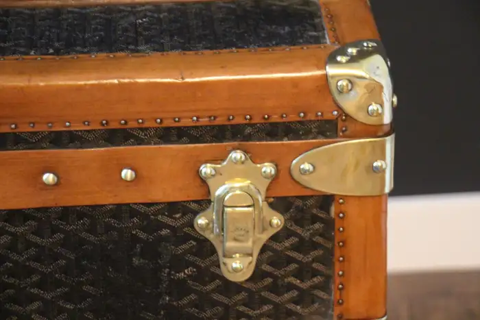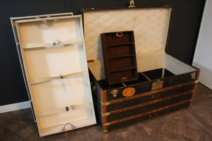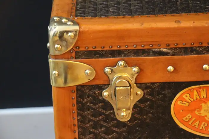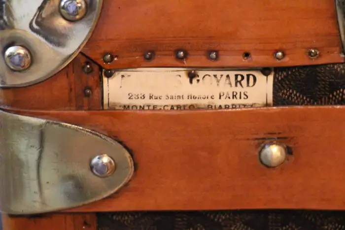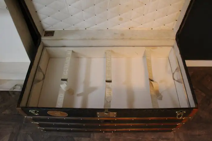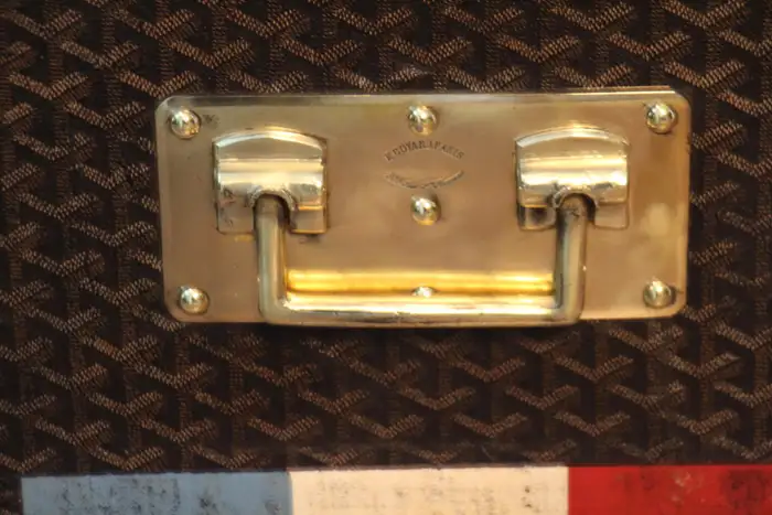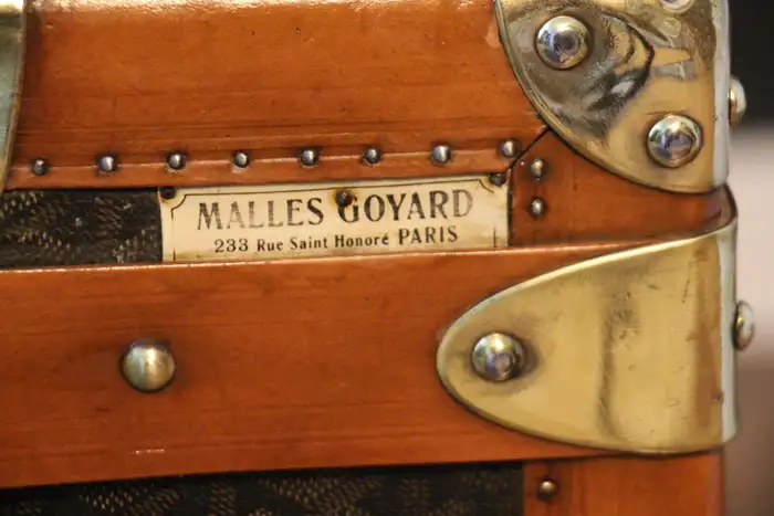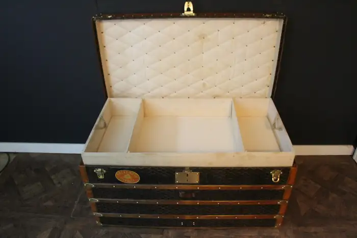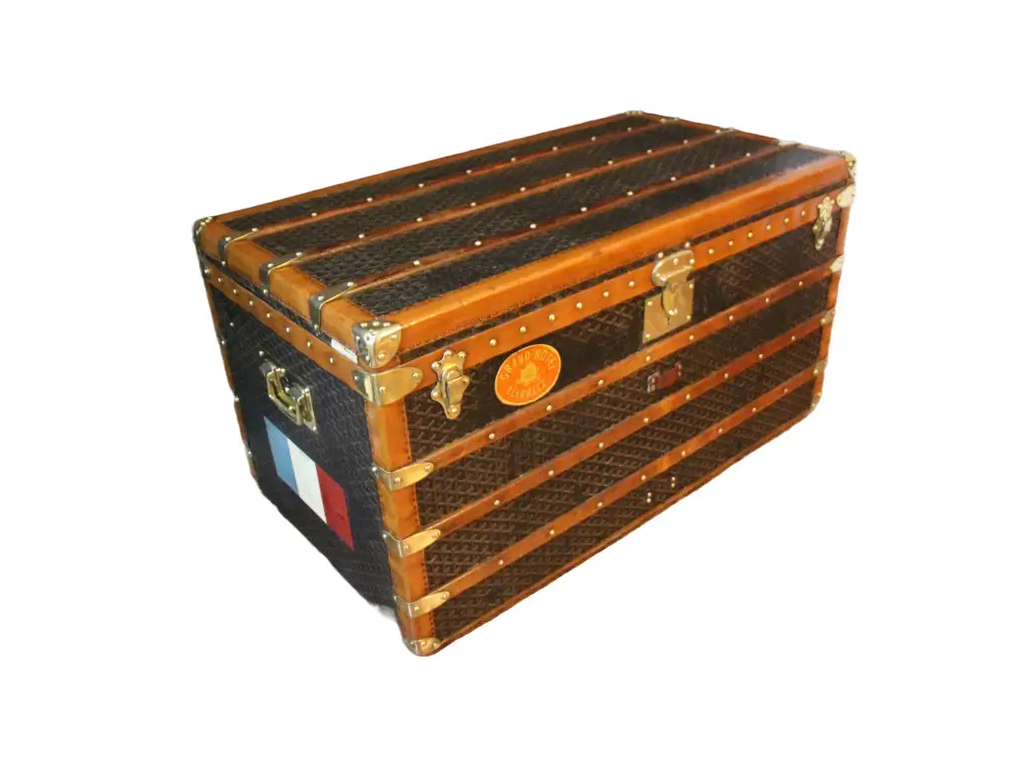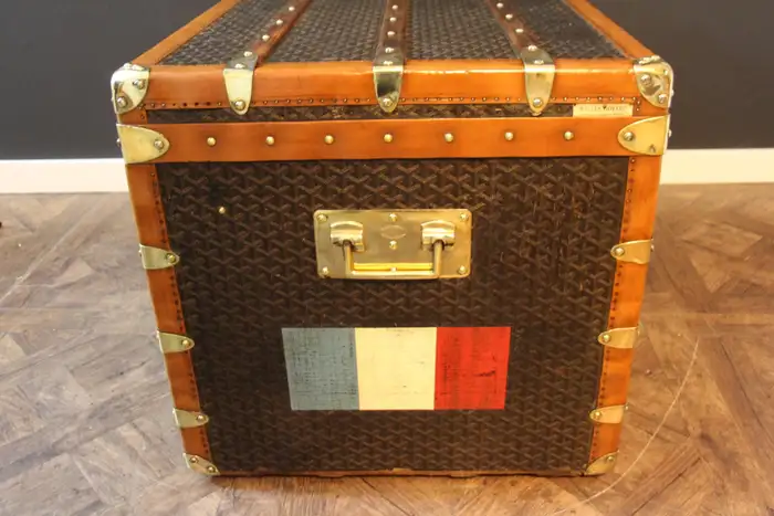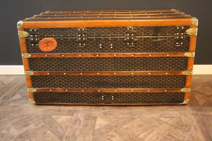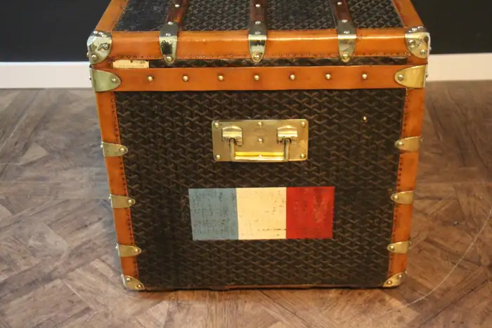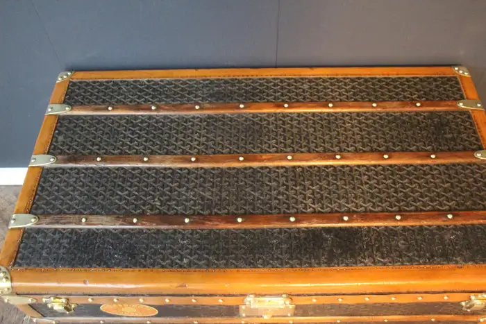 Cette malle courrier de Goyard présente de très belles proportions ainsi qu’une patine belle et chaleureuse. Elle présente sa célèbre toile à chevrons, sa serrure d’origine en laiton massif estampillée Goyard, ses fermoirs en laiton massif estampillés et les poignées en laiton massif estampillées. Son intérieur est également d’origine et en très bel état, avec ses 2 plateaux amovibles . Elle a conservé son étiquette rouge Goyard d’origine. Au fond de la malle, se trouvent 2 compartiments en feutre marron et un compartiment à chaussures amovible d’origine assorti. En dessous, cette belle malle courrier Goyard années 1920 a conservé son fond en zinc et ses lattes de bois d’origine. Cette magnifique malle pourrait facilement être placée comme table basse ou comme bout de lit.