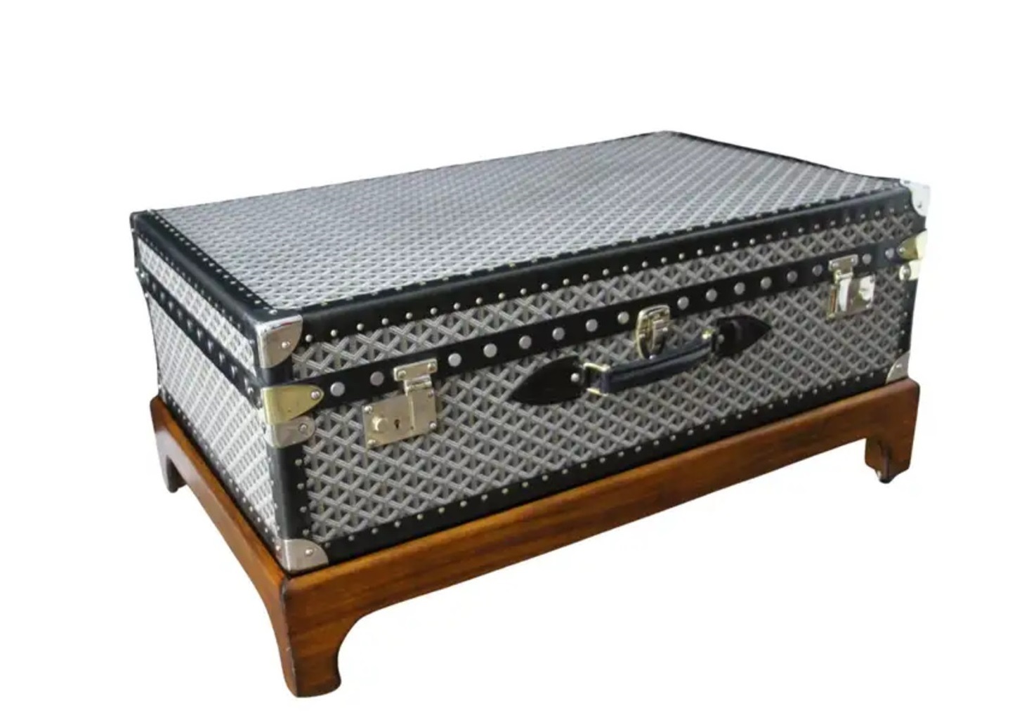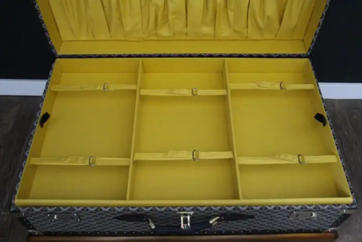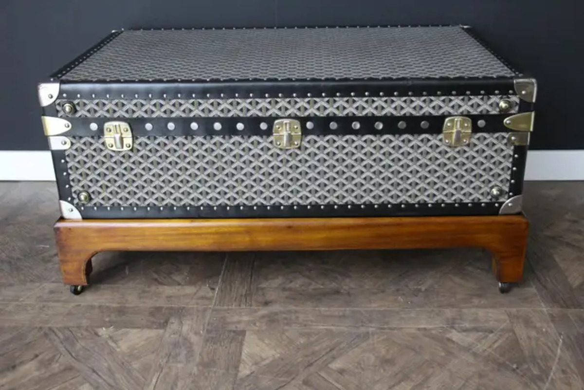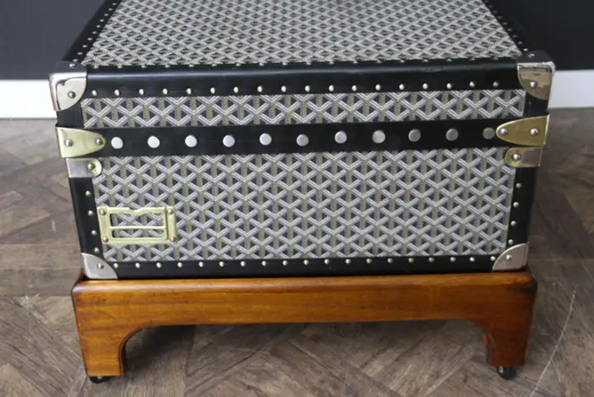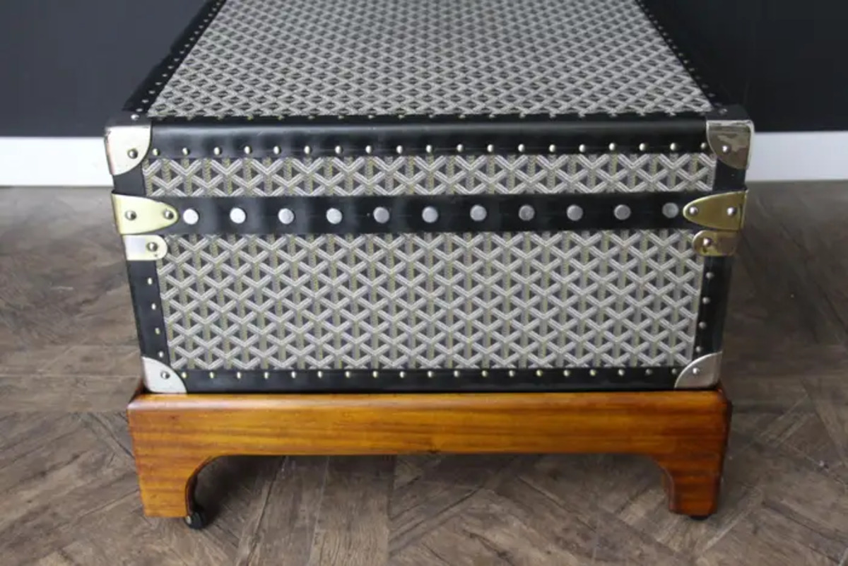 Il est donc parfait pour le rangement. Cette malle Goyard, à elle seule, ne mesure que 26 cm de haut. A noter que son support en bois amovible a été réalisé sur mesure afin de porter sa hauteur totale de 26 cm à 40 cm, soit la hauteur parfaite pour une utilisation en table basse ou en bout d’un lit.