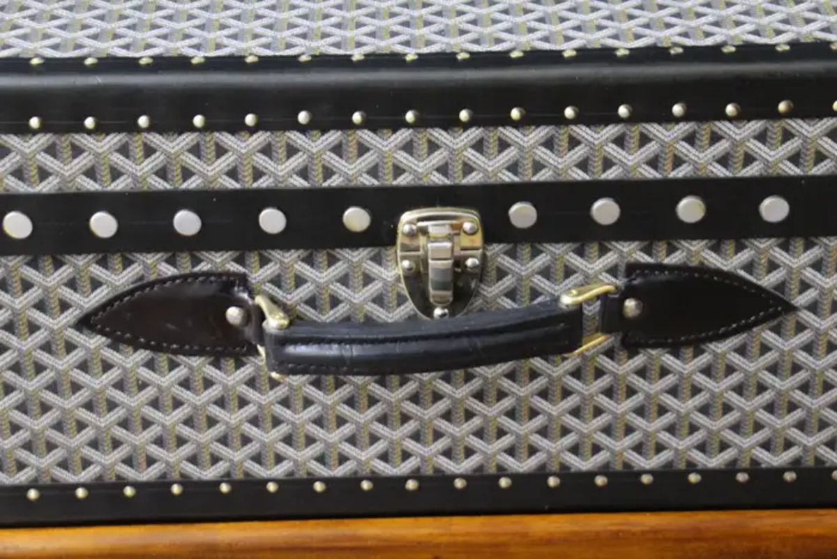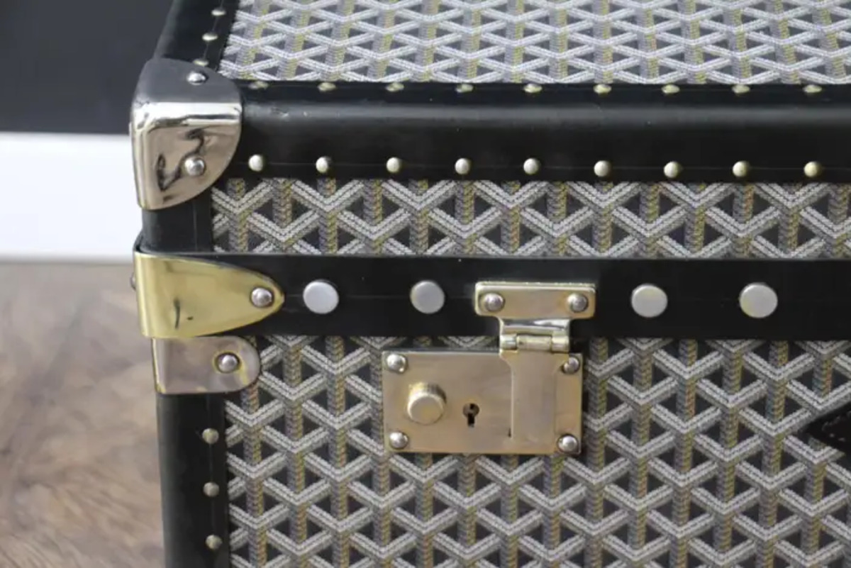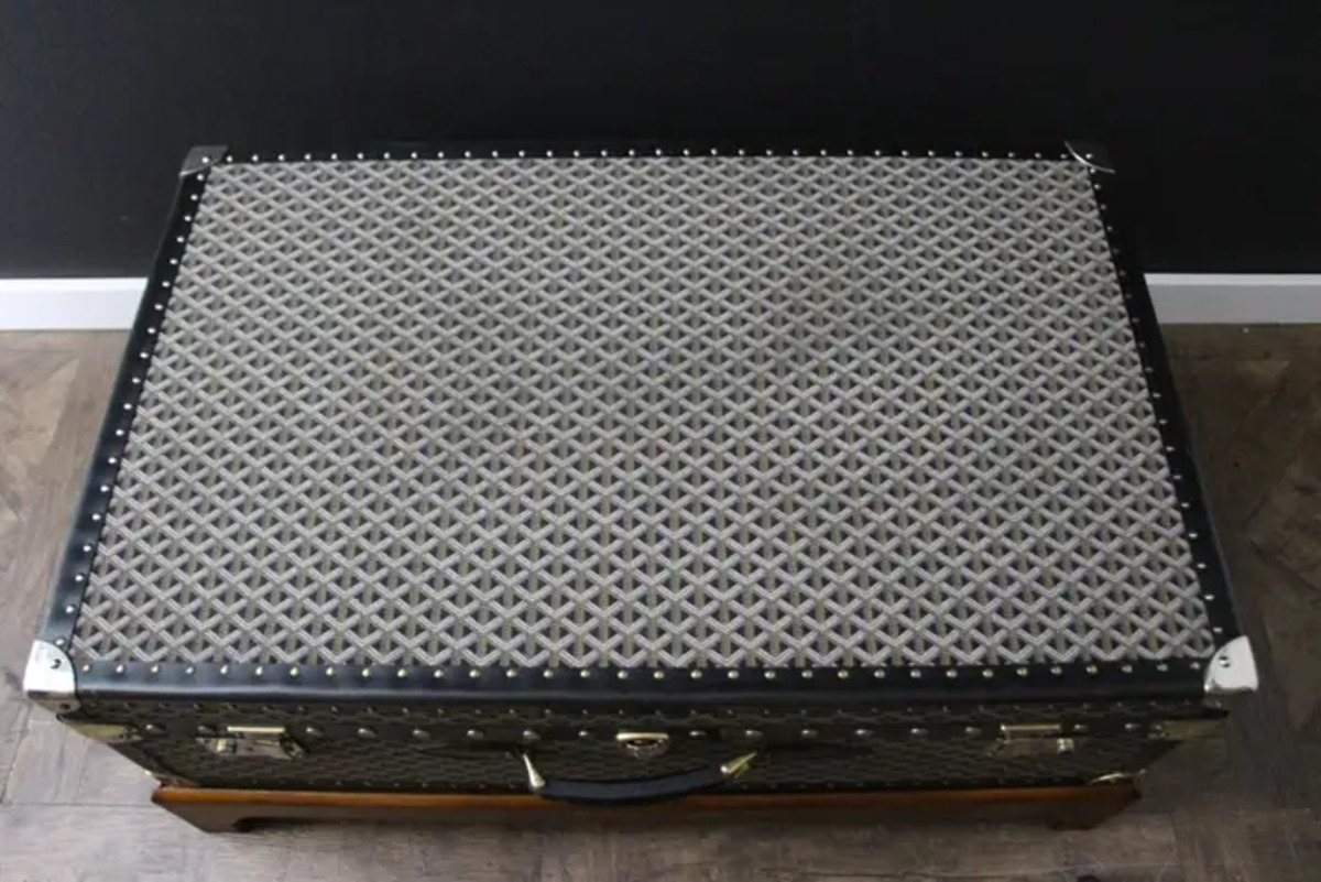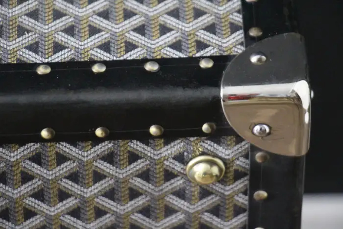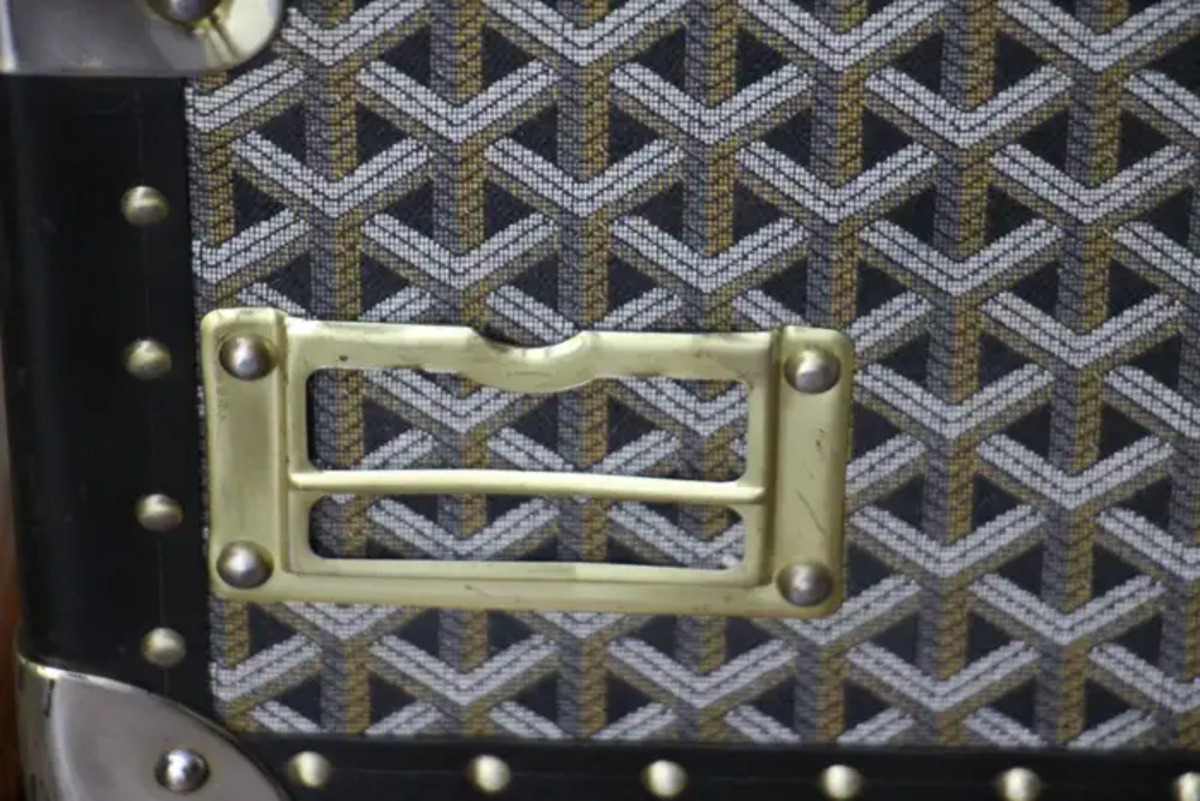 Cette superbe malle Goyard présente la très recherchée toile à chevrons tissés ainsi que toutes les ferrures en laiton massif et en plaladium. Elle est dotée d’une grande poignée en cuir noir et d’une bordure en cuir noir.