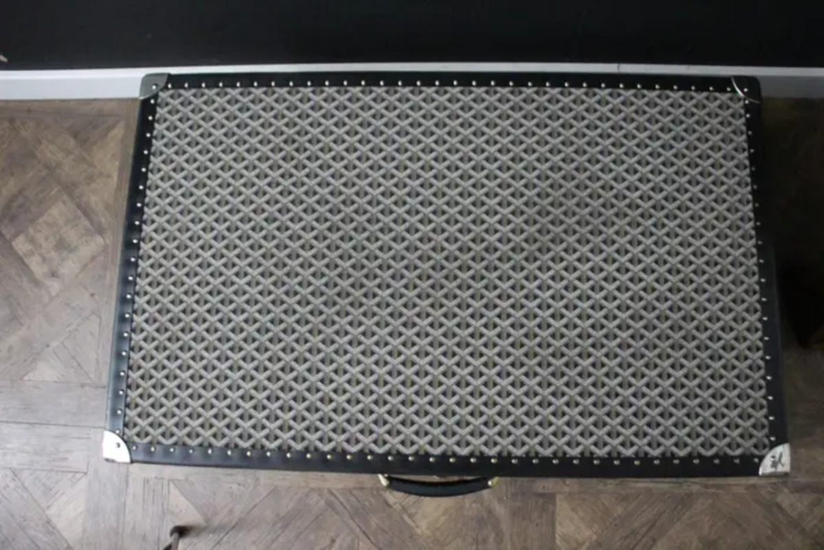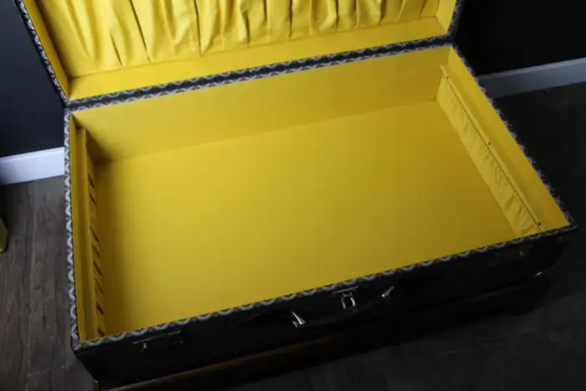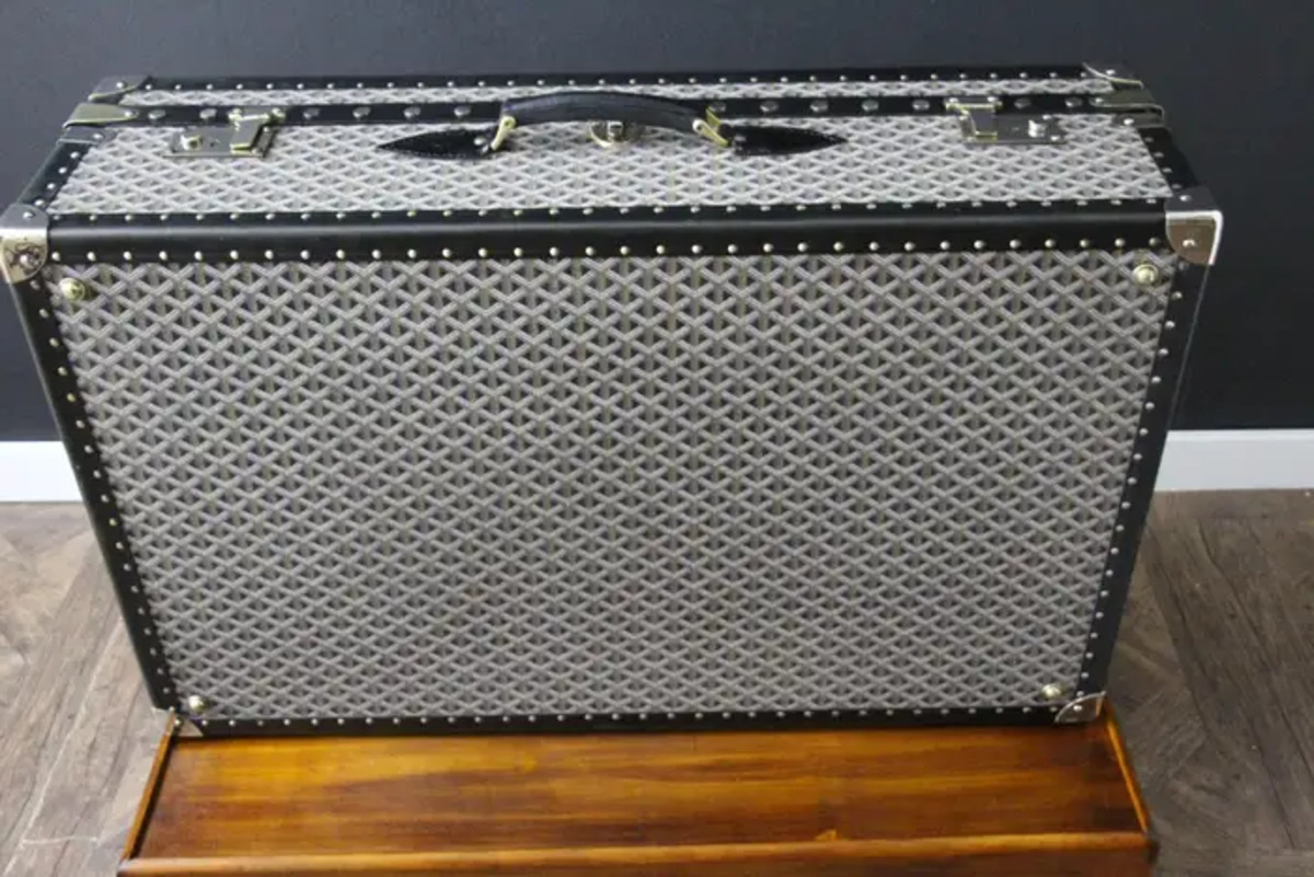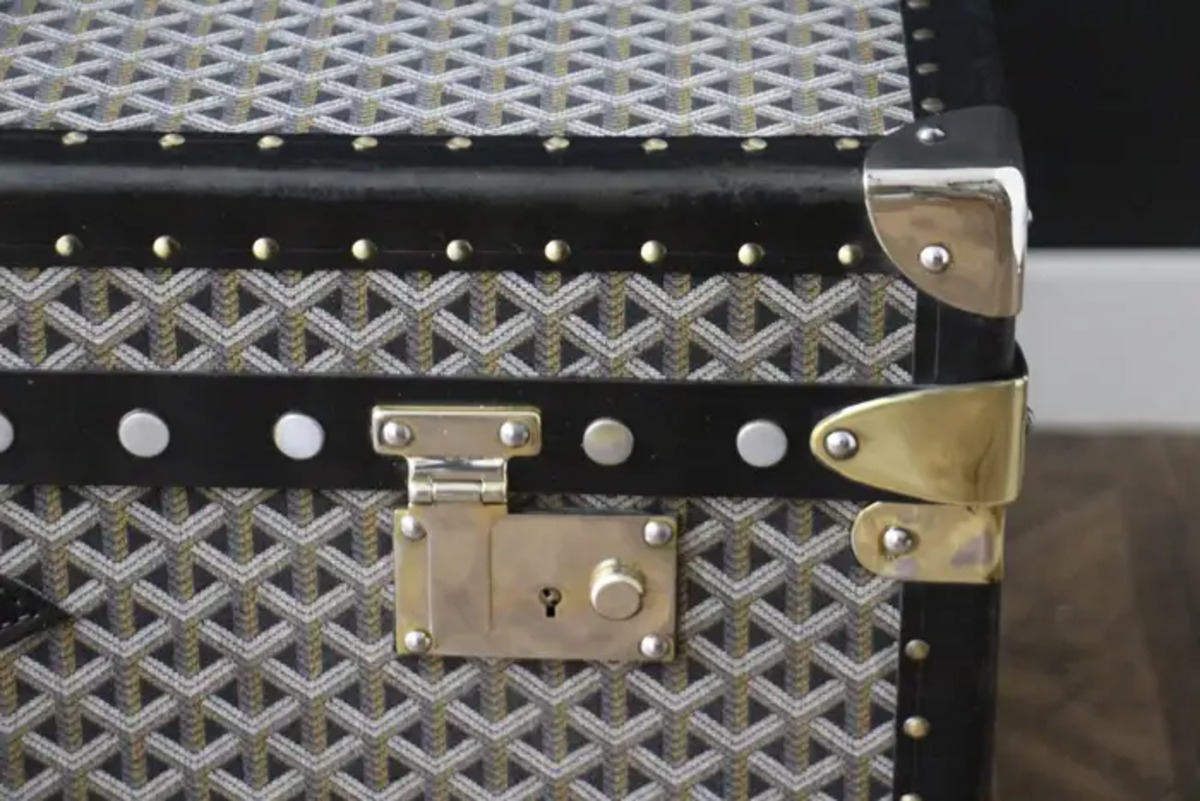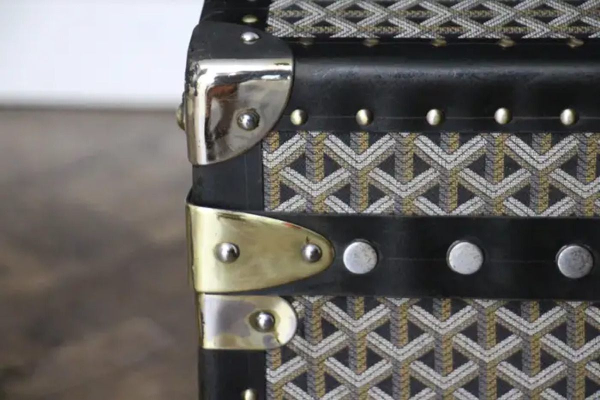 Cette superbe malle Goyard présente la très recherchée toile à chevrons tissés ainsi que toutes les ferrures en laiton massif et en plaladium. Elle est dotée d’une grande poignée en cuir noir et d’une bordure en cuir noir.