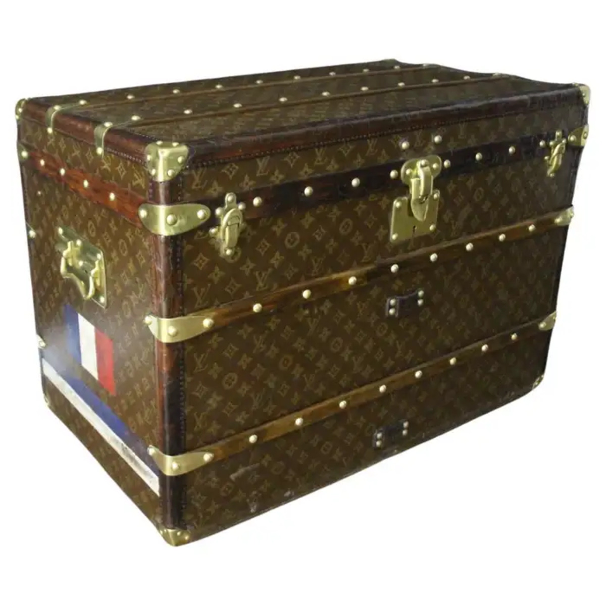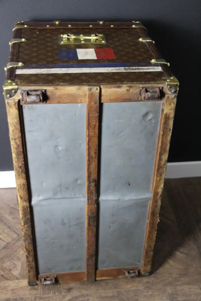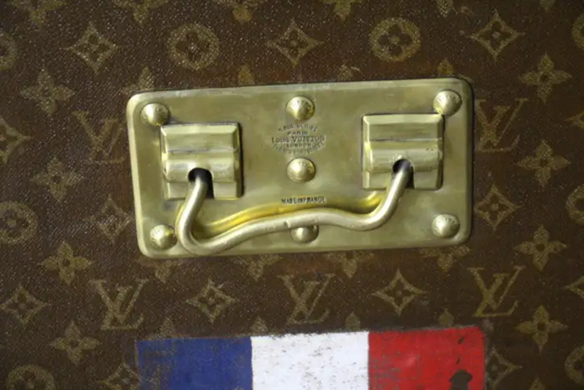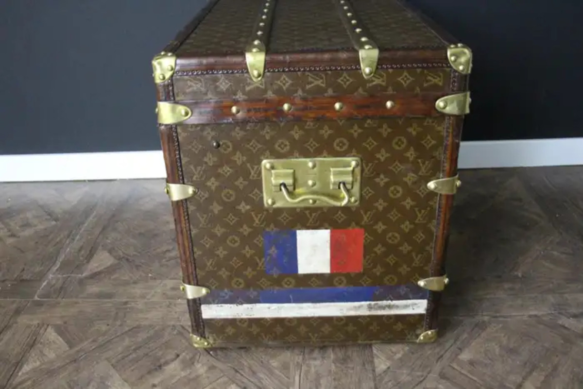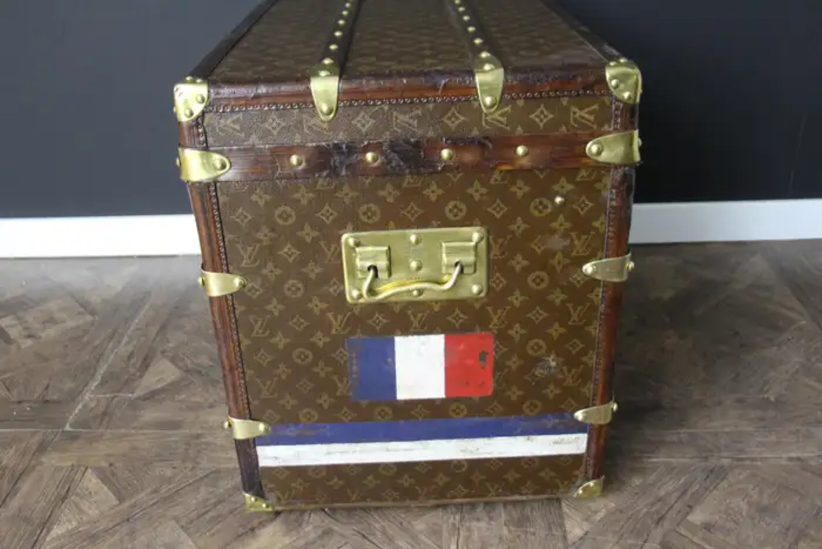 Superbe malle Louis Vuitton avec toile peinte au pochoir, bordures en cuir couleur chocolat profond, fermoirs, serrure et clous en laiton massif estampillés Louis Vuitton, coins en laiton massif et poignées latérales en laiton massif estampillées LV. Mesure : 76 cm Drapeau français peint personnalisé et bandes sur les côtés. Veuillez noter que ses poignées en laiton massif sur les côtés sont un peu tordues, comme le montrent les photos. Cette malle a conservé son intérieur d’origine et n’a jamais été regarnie, elle a également conservé son capiton d’origine sous son capot. Cette malle à chapeau Vuitton 75 cm a également conservé son étiquette Louis Vuitton d’origine ainsi que son numéro de série. Le capiton est un peu déchiré en haut à droite, comme le montrent les photos, mais il est d’origine. En dessous, elle était faite de zinc pour la protéger de l’humidité lors des voyages. Cette malle Vuitton est en très bon état, comme il se doit compte tenu de son âge, environ 100 ans. Parfaite pour être utilisée comme table basse, malle en bout de lit ou table d’appoint.