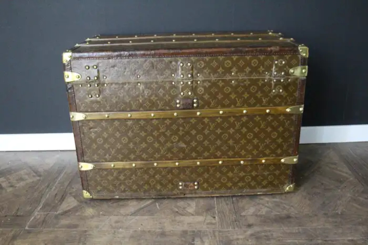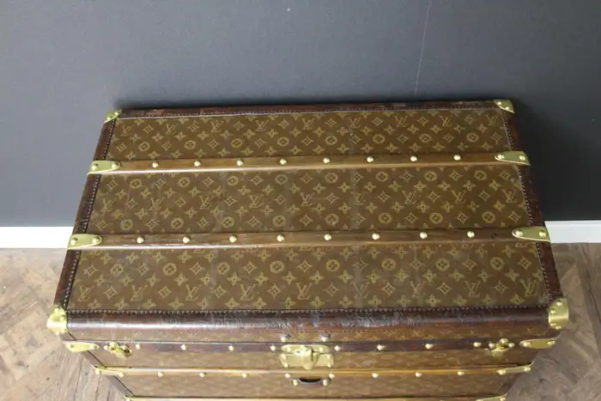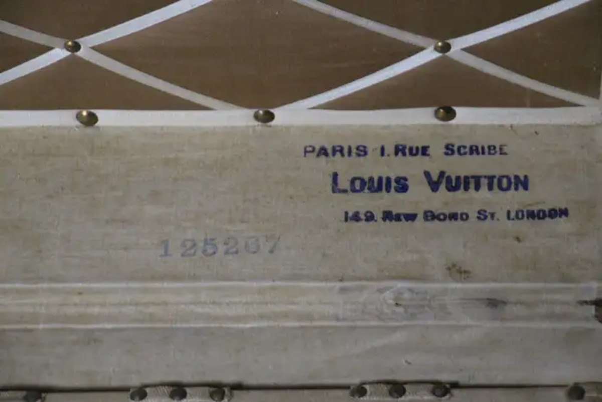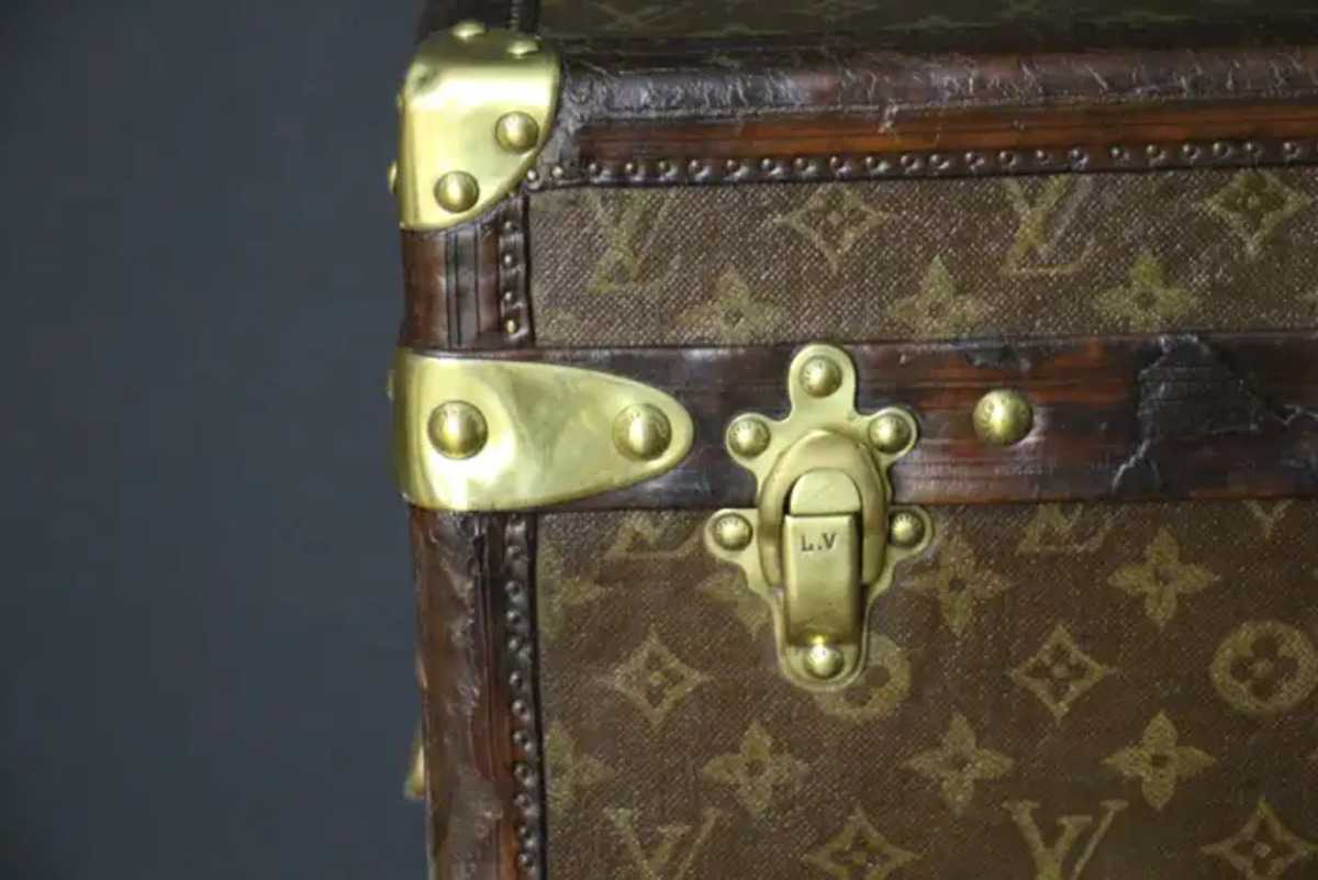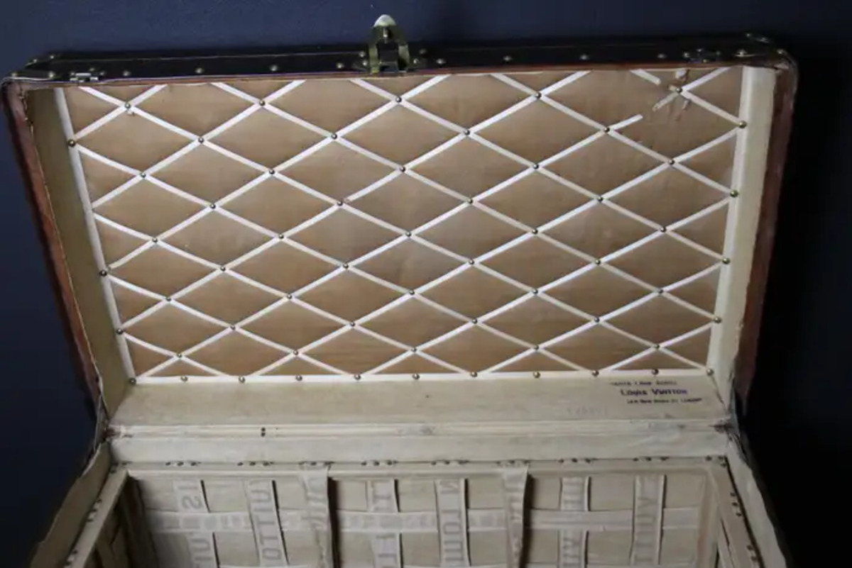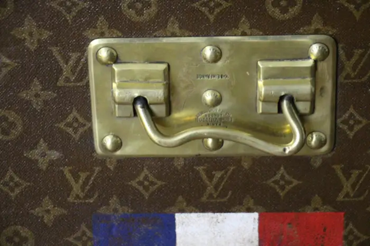 Superbe malle Louis Vuitton avec toile peinte au pochoir, bordures en cuir couleur chocolat profond, fermoirs, serrure et clous en laiton massif estampillés Louis Vuitton, coins en laiton massif et poignées latérales en laiton massif estampillées LV. Mesure : 76 cm Drapeau français peint personnalisé et bandes sur les côtés. Veuillez noter que ses poignées en laiton massif sur les côtés sont un peu tordues, comme le montrent les photos. Cette malle a conservé son intérieur d’origine et n’a jamais été regarnie, elle a également conservé son capiton d’origine sous son capot. Cette malle à chapeau Vuitton 75 cm a également conservé son étiquette Louis Vuitton d’origine ainsi que son numéro de série. Le capiton est un peu déchiré en haut à droite, comme le montrent les photos, mais il est d’origine. En dessous, elle était faite de zinc pour la protéger de l’humidité lors des voyages. Cette malle Vuitton est en très bon état, comme il se doit compte tenu de son âge, environ 100 ans. Parfaite pour être utilisée comme table basse, malle en bout de lit ou table d’appoint.