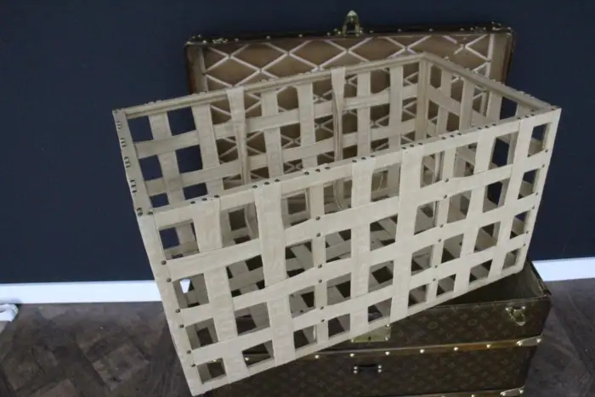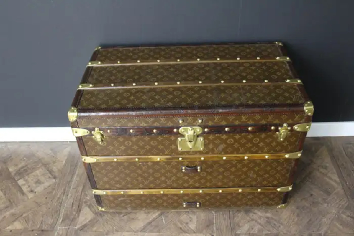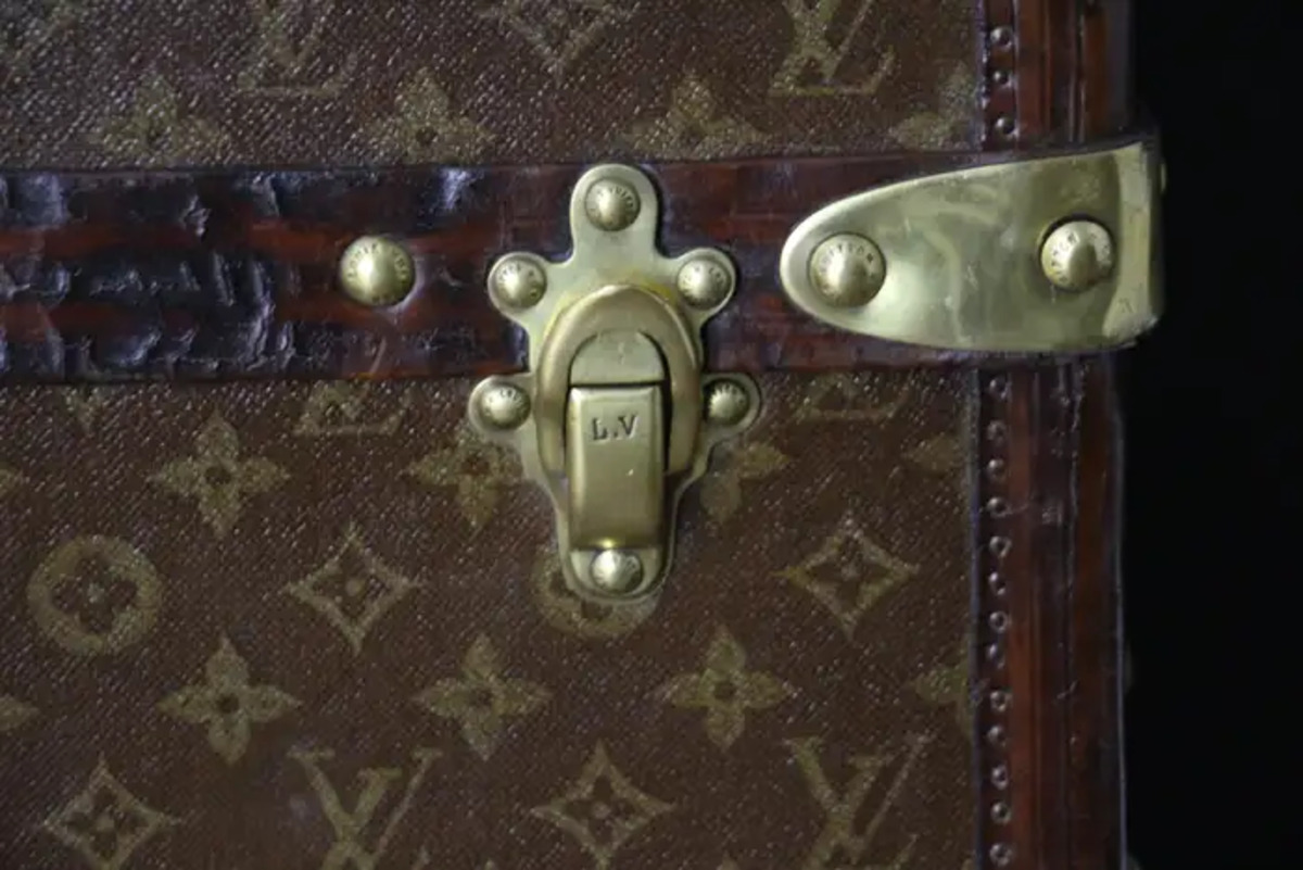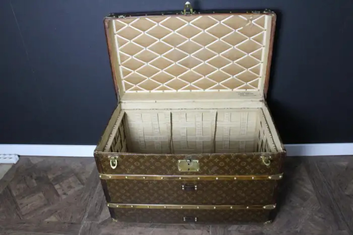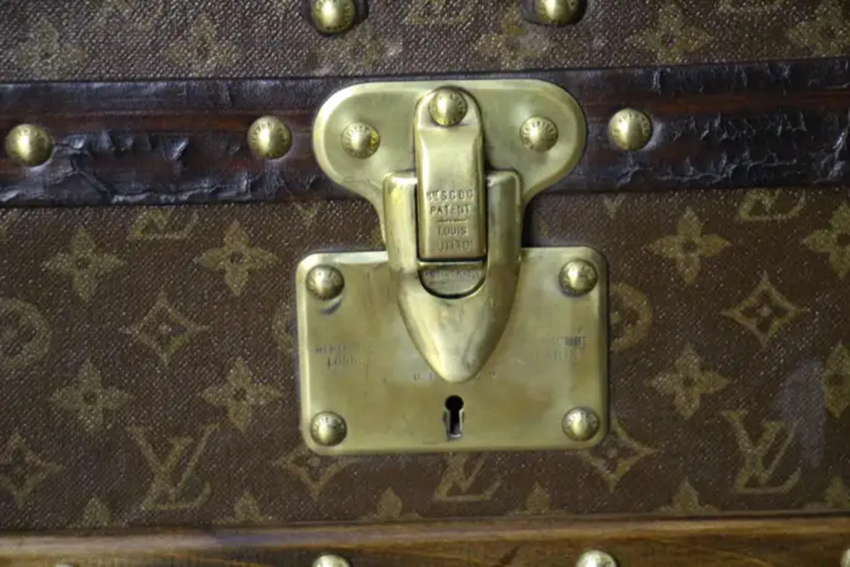 Superbe malle Louis Vuitton avec toile peinte au pochoir, bordures en cuir couleur chocolat profond, fermoirs, serrure et clous en laiton massif estampillés Louis Vuitton, coins en laiton massif et poignées latérales en laiton massif estampillées LV. Mesure : 76 cm Drapeau français peint personnalisé et bandes sur les côtés. Veuillez noter que ses poignées en laiton massif sur les côtés sont un peu tordues, comme le montrent les photos. Cette malle a conservé son intérieur d’origine et n’a jamais été regarnie, elle a également conservé son capiton d’origine sous son capot. Cette malle à chapeau Vuitton 75 cm a également conservé son étiquette Louis Vuitton d’origine ainsi que son numéro de série. Le capiton est un peu déchiré en haut à droite, comme le montrent les photos, mais il est d’origine. En dessous, elle était faite de zinc pour la protéger de l’humidité lors des voyages. Cette malle Vuitton est en très bon état, comme il se doit compte tenu de son âge, environ 100 ans. Parfaite pour être utilisée comme table basse, malle en bout de lit ou table d’appoint.