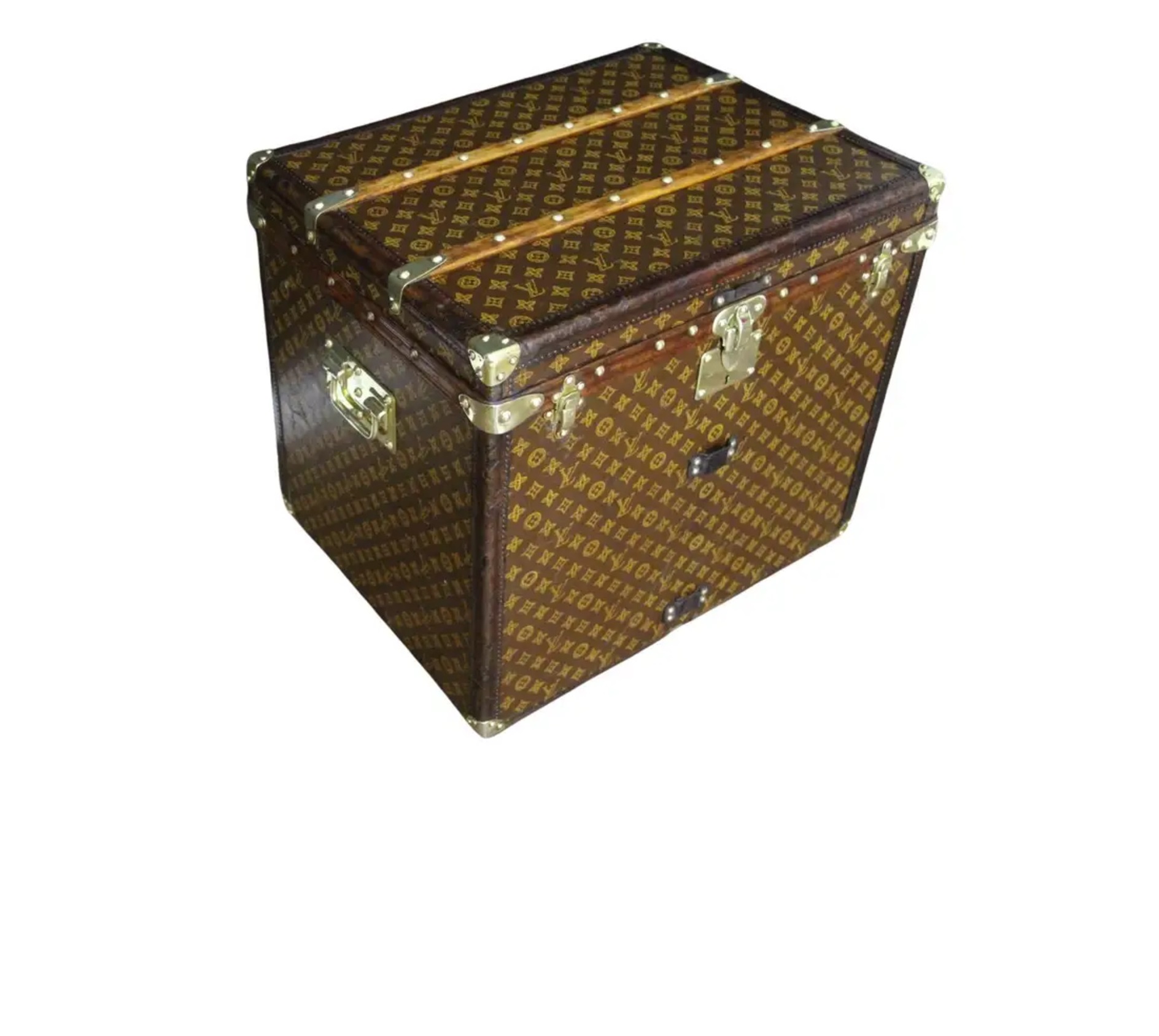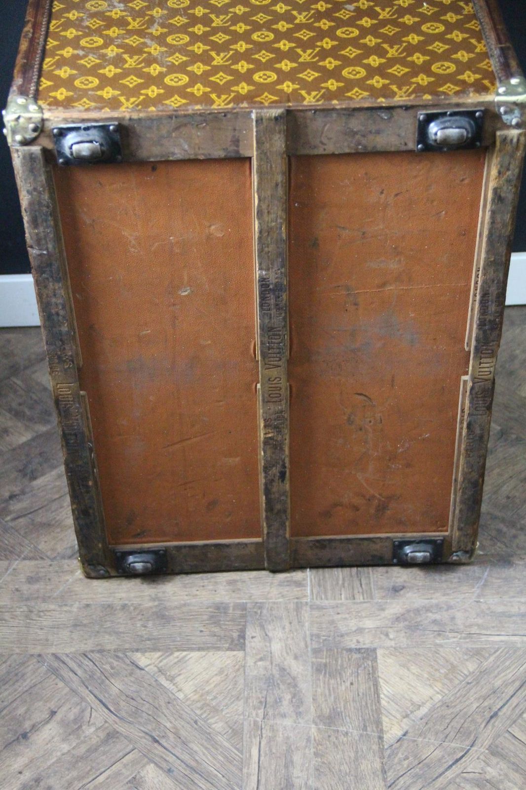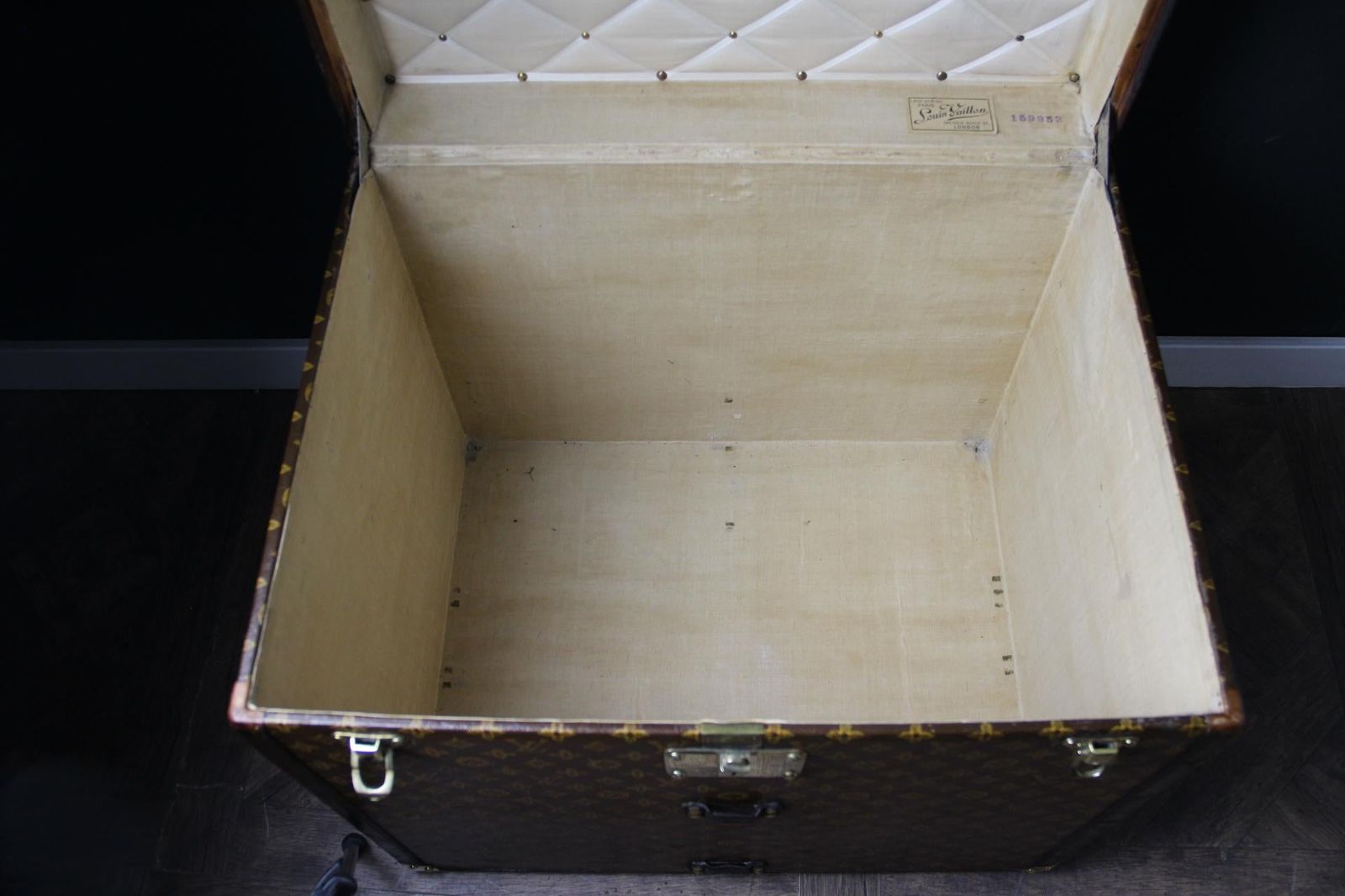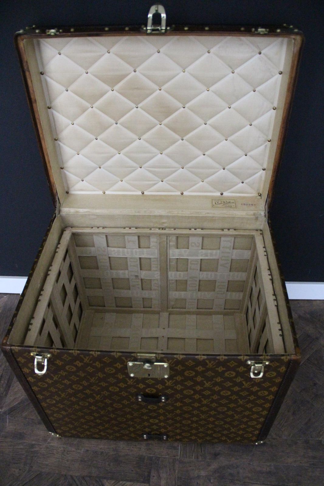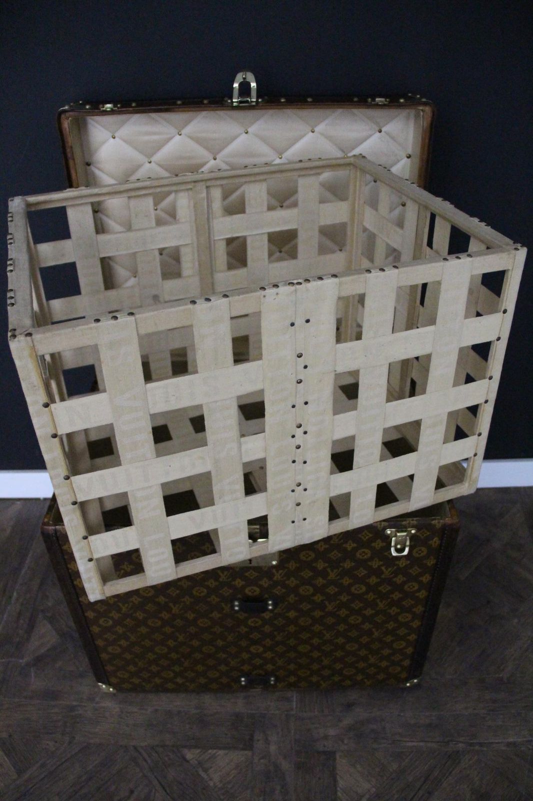Elle possède encore sa toile monogrammée et ses lattes en bois estampillées Louis Vuitton sous la malle. Cette rare malle à chapeaux Louis Vuitton a conservé son panier amovible en toile d’origine.