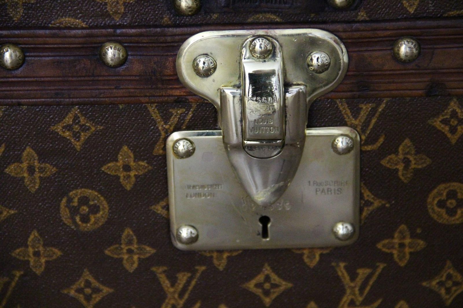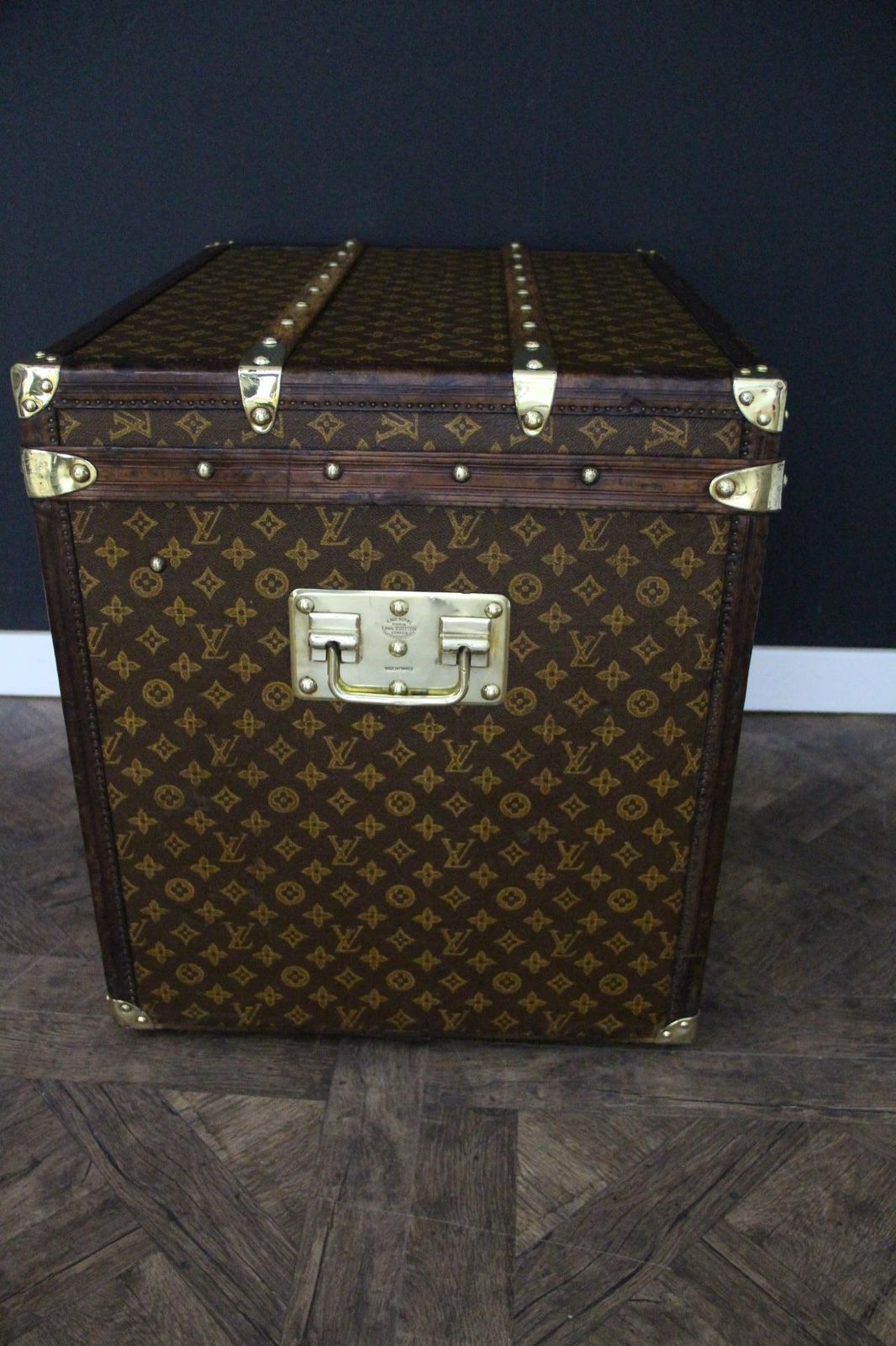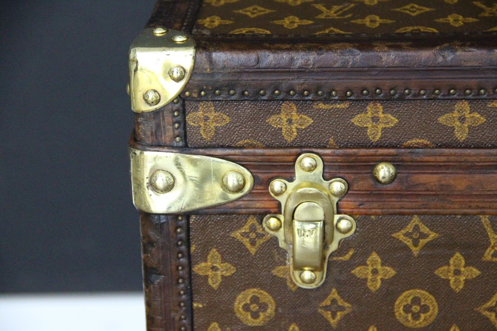Cette magnifique malle Louis Vuitton, très rare, présente ‘une toile monogramme peinte à la main au pochoir, des bordures en cuir couleur chocolat, de poignées latérales en laiton massif gravées LV, les clous en laiton Louis Vuitton estampillés, ainsi que sa serrure et ses fermoirs.