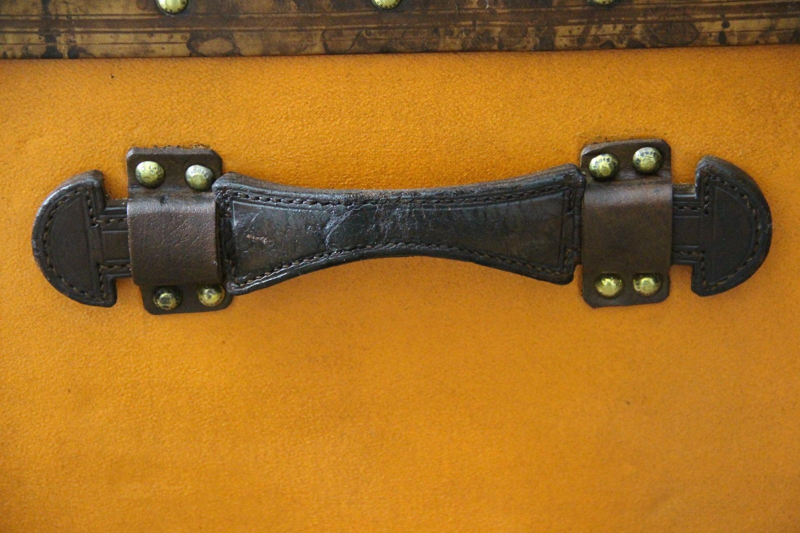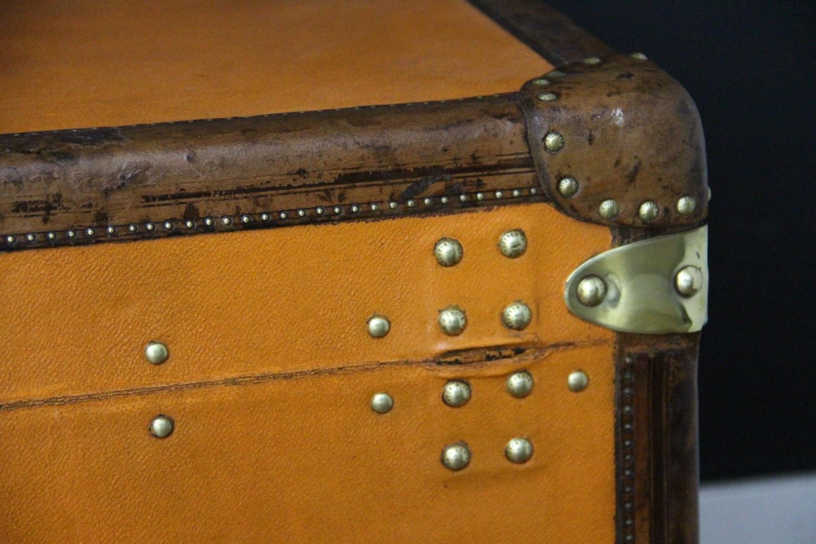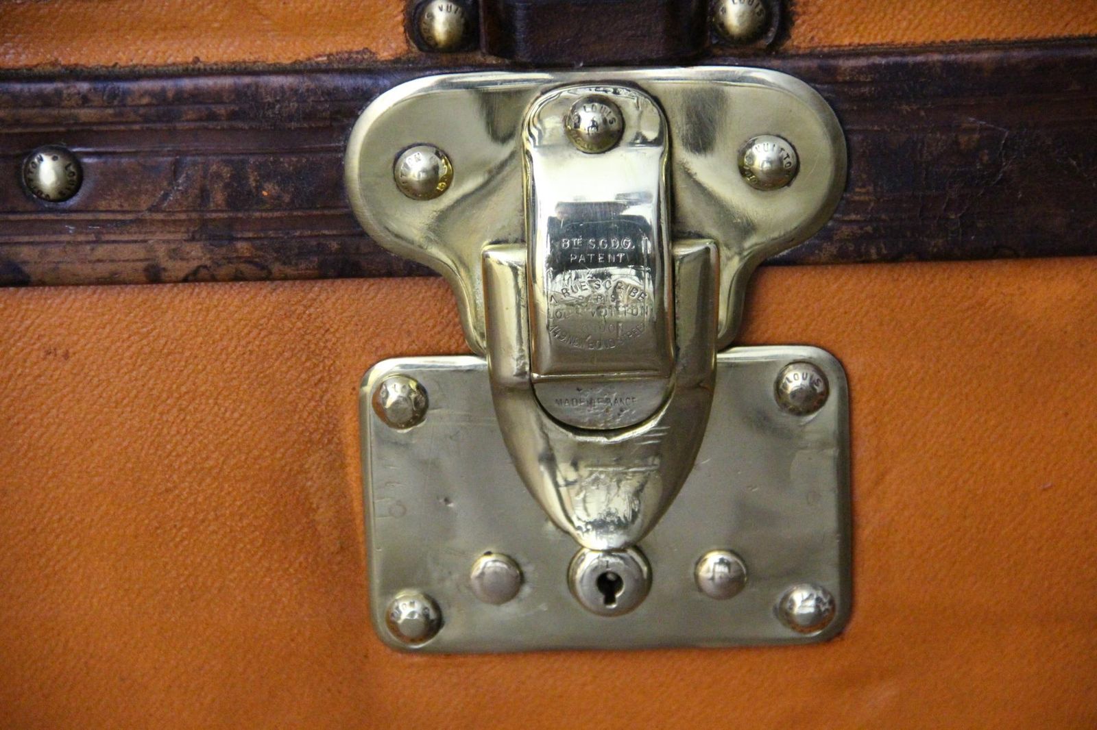 Cette malle Louis Vuitton inhabituelle est dotée d’une magnifique toile orange, de finitions en cuir couleur chocolat, de grandes poignées latérales en cuir, ainsi que d’une serrure, de fermoirs et de clous en laiton estampillés Louis Vuitton. Elle présente une très belle patine riche. De plus, sa taille est très rare, car sa largeur est de 120 cm.