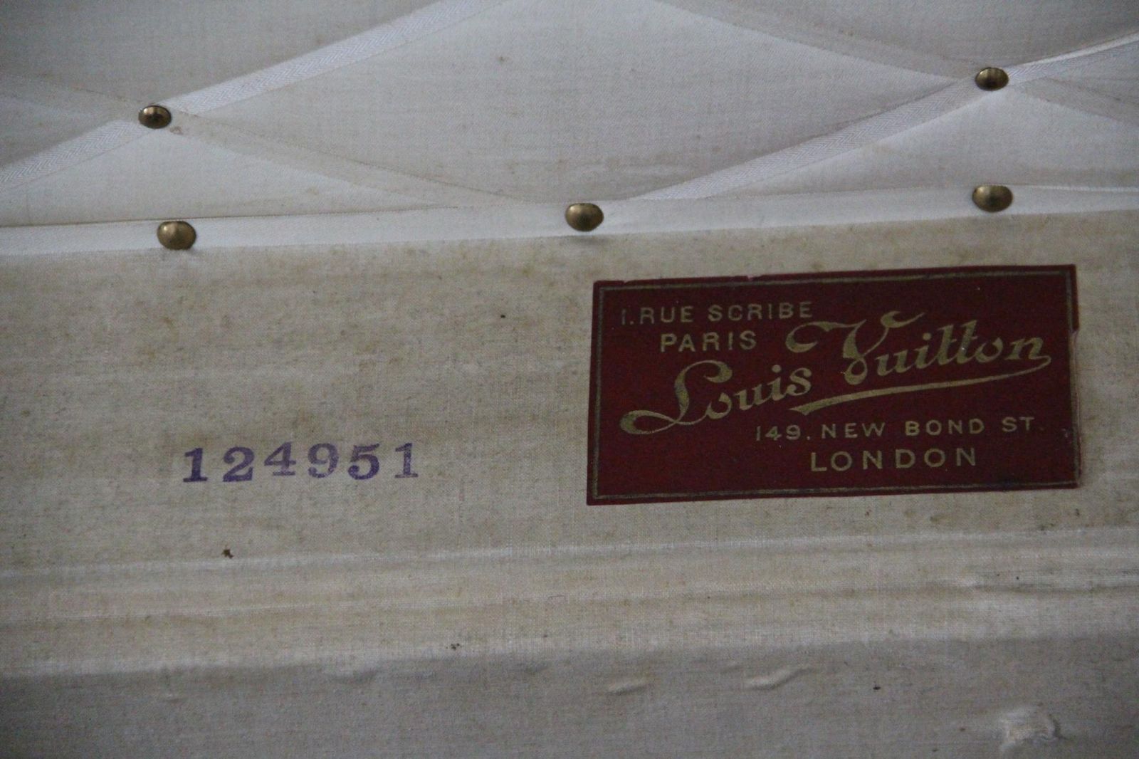 Son intérieur est entièrement en lin beige d’origine, avec son capiton d’origine sous le capot. Seul son fond a été refait en feutre marron foncé. Elle possède toujours son étiquette Louis Vuitton ainsi que son numéro de série. D’une manière générale, son intérieur est très propre si l’on tient compte du fait qu’elle a plus de 110 ans. Bien sûr, il n’est pas en parfait état, il y a quelques taches, mais elles font partie de son charme.