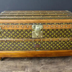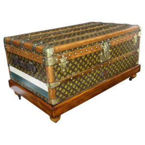 Un support en bois sur mesure a été fabriqué afin de la rehausser légèrement. Sans son support en bois, elle ne mesure que 40 cm de haut. Cette malle Louis Vuitton peut être utilisée comme table basse ou coffre à couvertures dans tous les intérieurs chics.