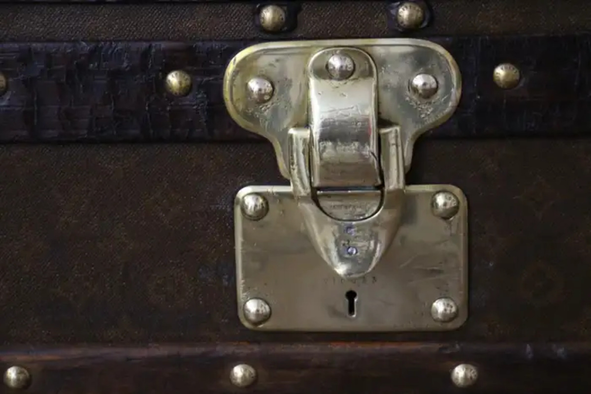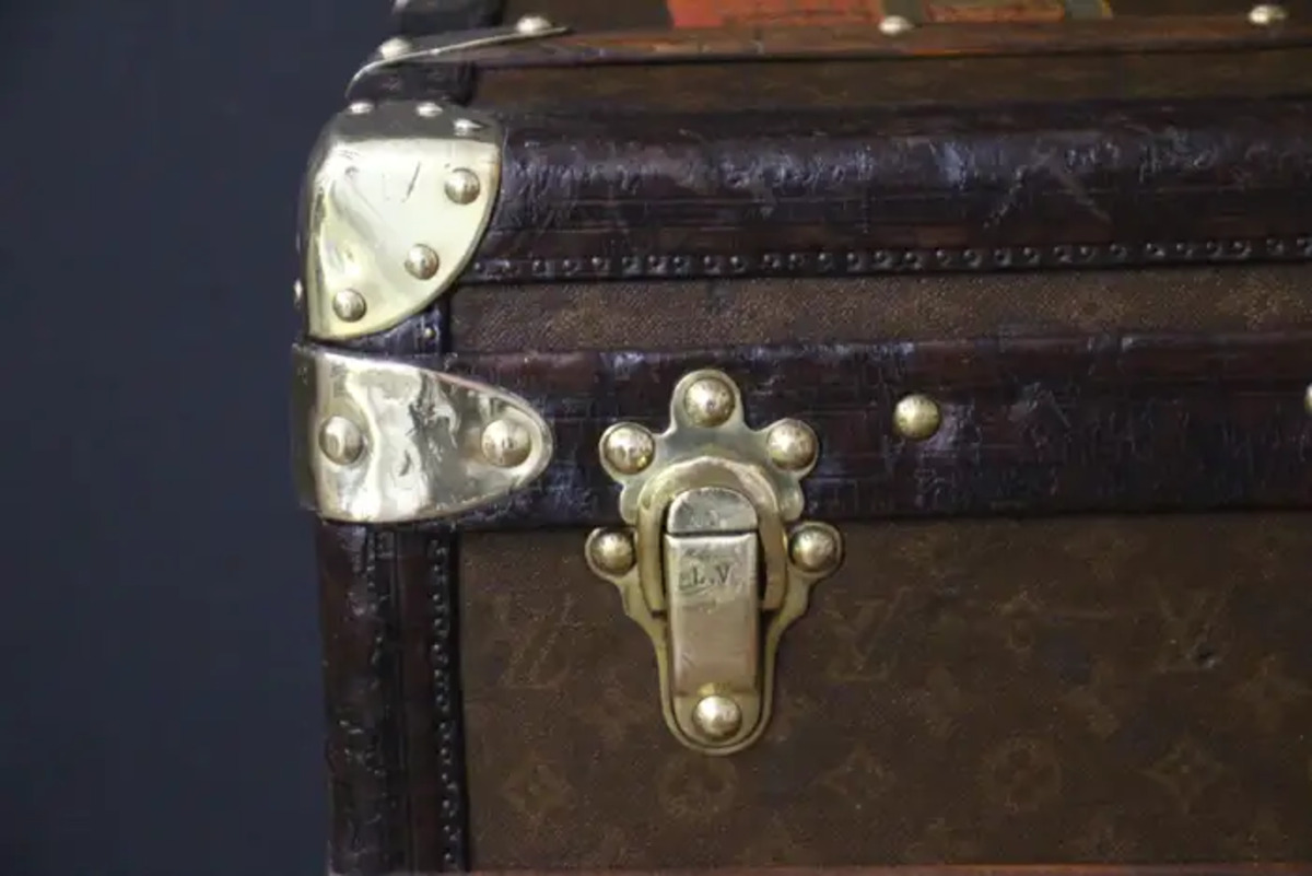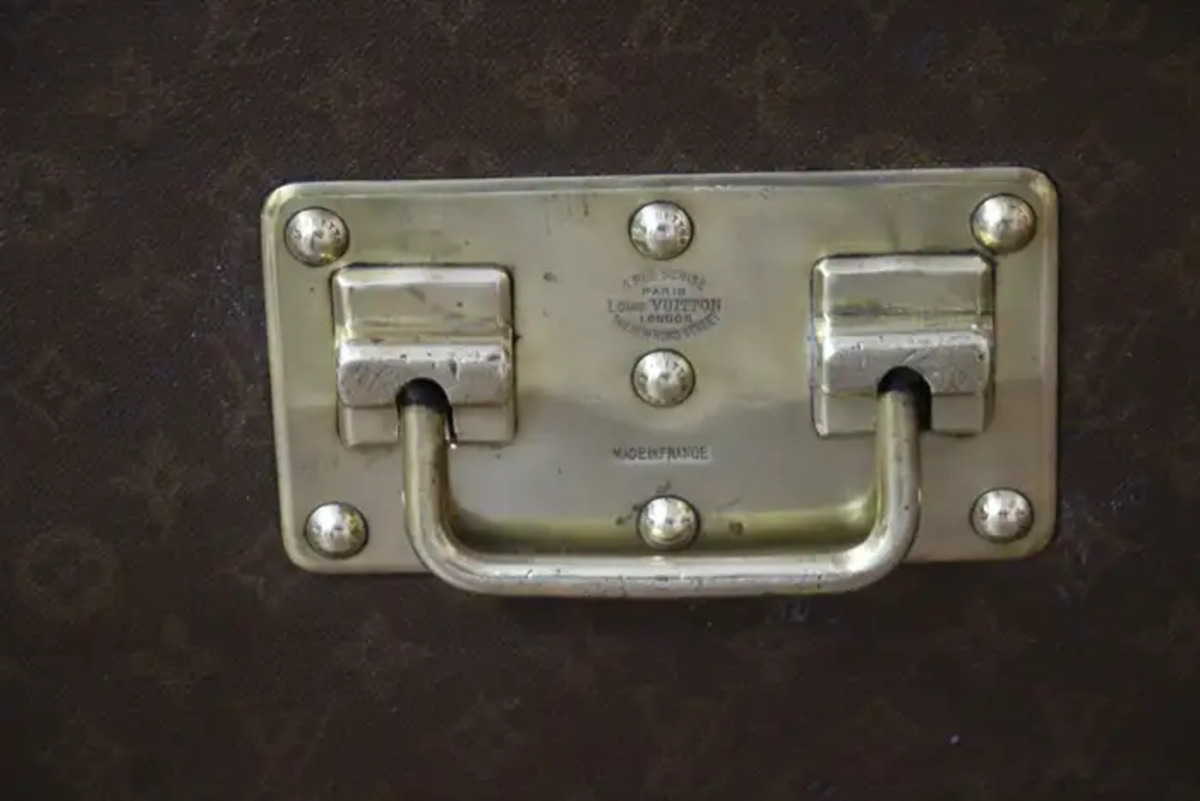 Cette superbe malle Louis Vuitton courrier ancienne date des années 1920’s . Elle est ornée de toile monogramme peinte à la main, au pochoir et dispose de bordures en cuir couleur chocolat foncé, de serrures et de clous en laiton massif estampillés LV ainsi que de poignées latérales et de coins en laiton massif.