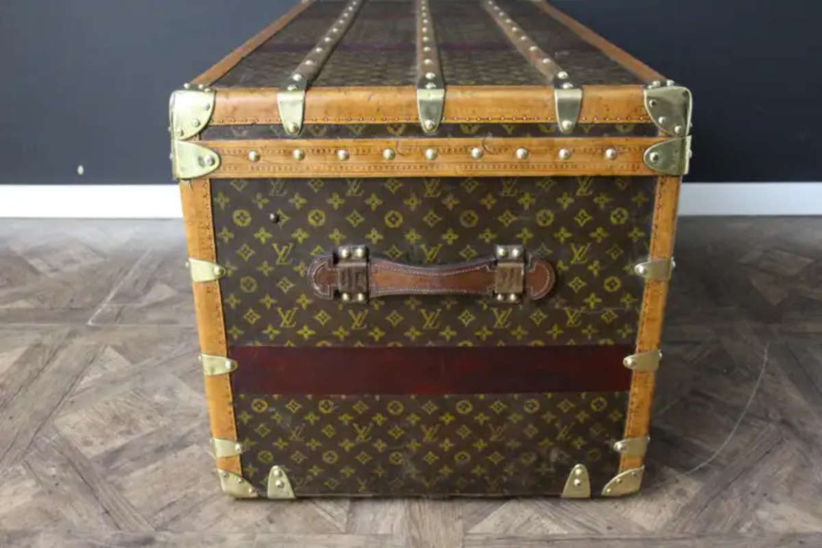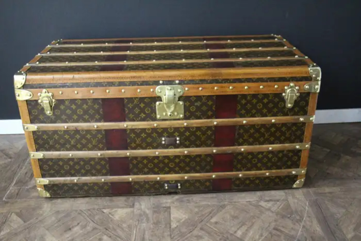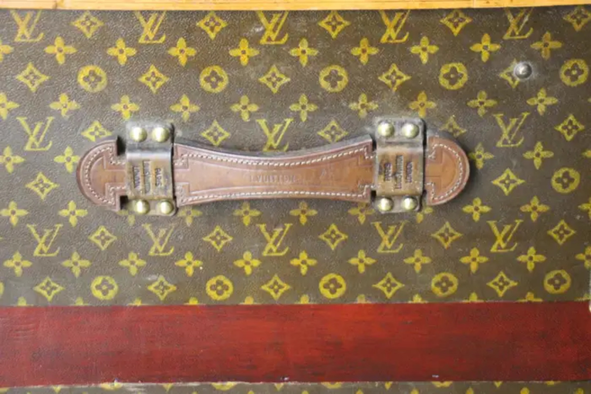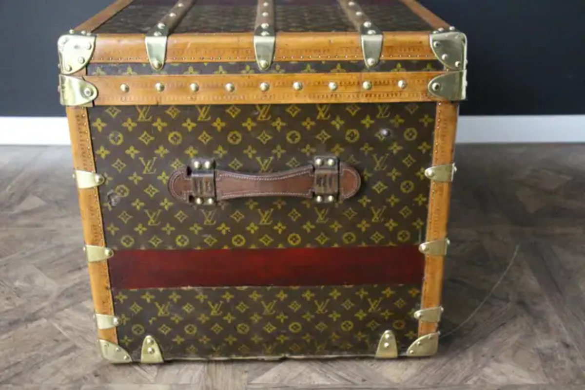 Cette superbe malle Louis Vuitton présente une toile monogrammée au pochoir, peint à la main, des bordures en lozine couleur miel, les serrures et les clous en laiton massif estampillés LV ainsi que des poignées latérales en cuir et des coins en laiton. Ses bandes peintes en rouge foncé personnalisées ajoutent une touche de personnalité.