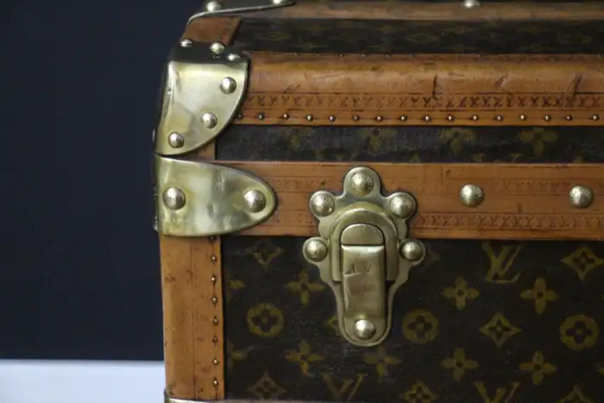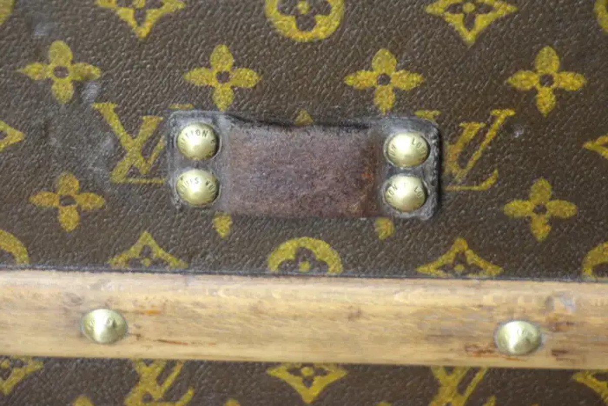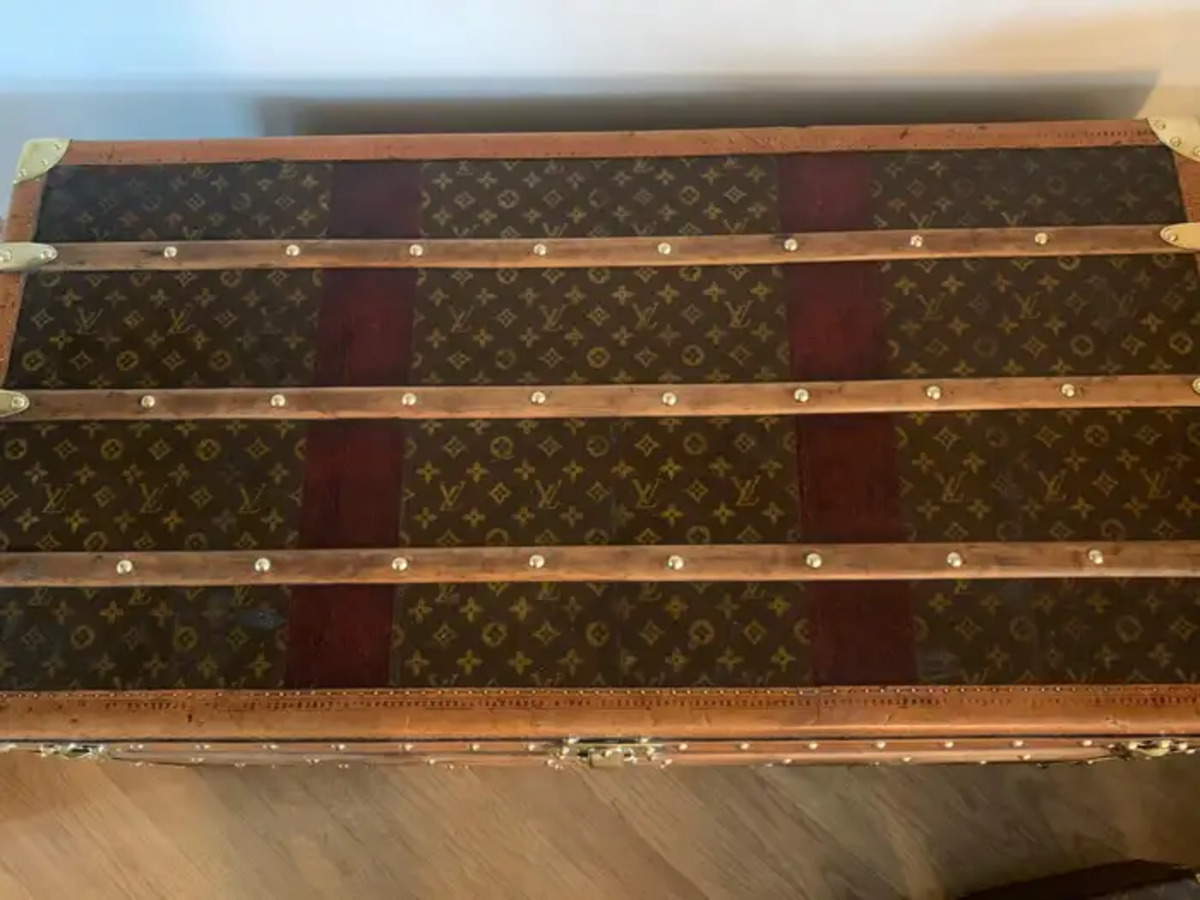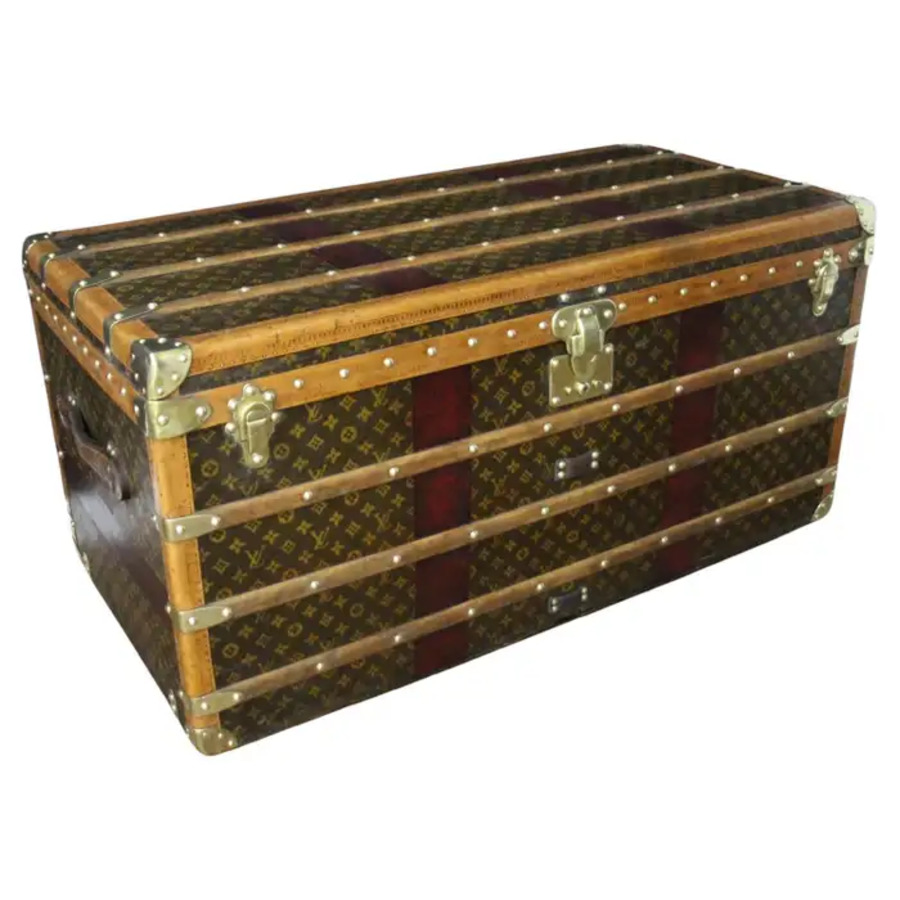 Cette superbe malle Louis Vuitton présente une toile monogrammée au pochoir, peint à la main, des bordures en lozine couleur miel, les serrures et les clous en laiton massif estampillés LV ainsi que des poignées latérales en cuir et des coins en laiton. Ses bandes peintes en rouge foncé personnalisées ajoutent une touche de personnalité.