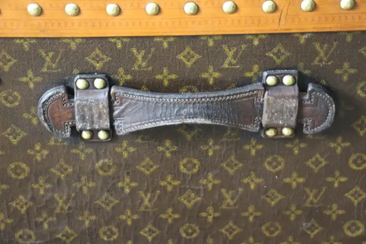 Cette malle Vuitton présente un monogramme peint à la main au pochoir , une bordure en lozine couleur miel clair, des serrures et fermoirs en laiton massif estampillés Louis Vuitton, des clous estampillés Louis Vuitton ainsi que de grandes poignées latérales en cuir. Sa patine est chaleureuse et élégante.