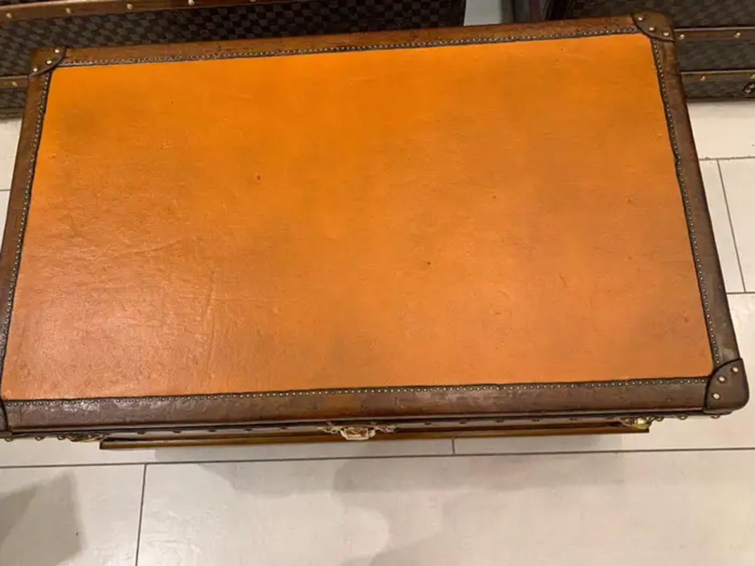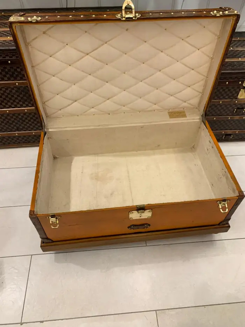 Elle offre une très belle et riche patine. Son intérieur est entièrement tapissé en toile beige d’origine avec son capiton d’origine sous le capot. Le ruban du capiton est brodé Louis Vuitton sur toute la longueur.