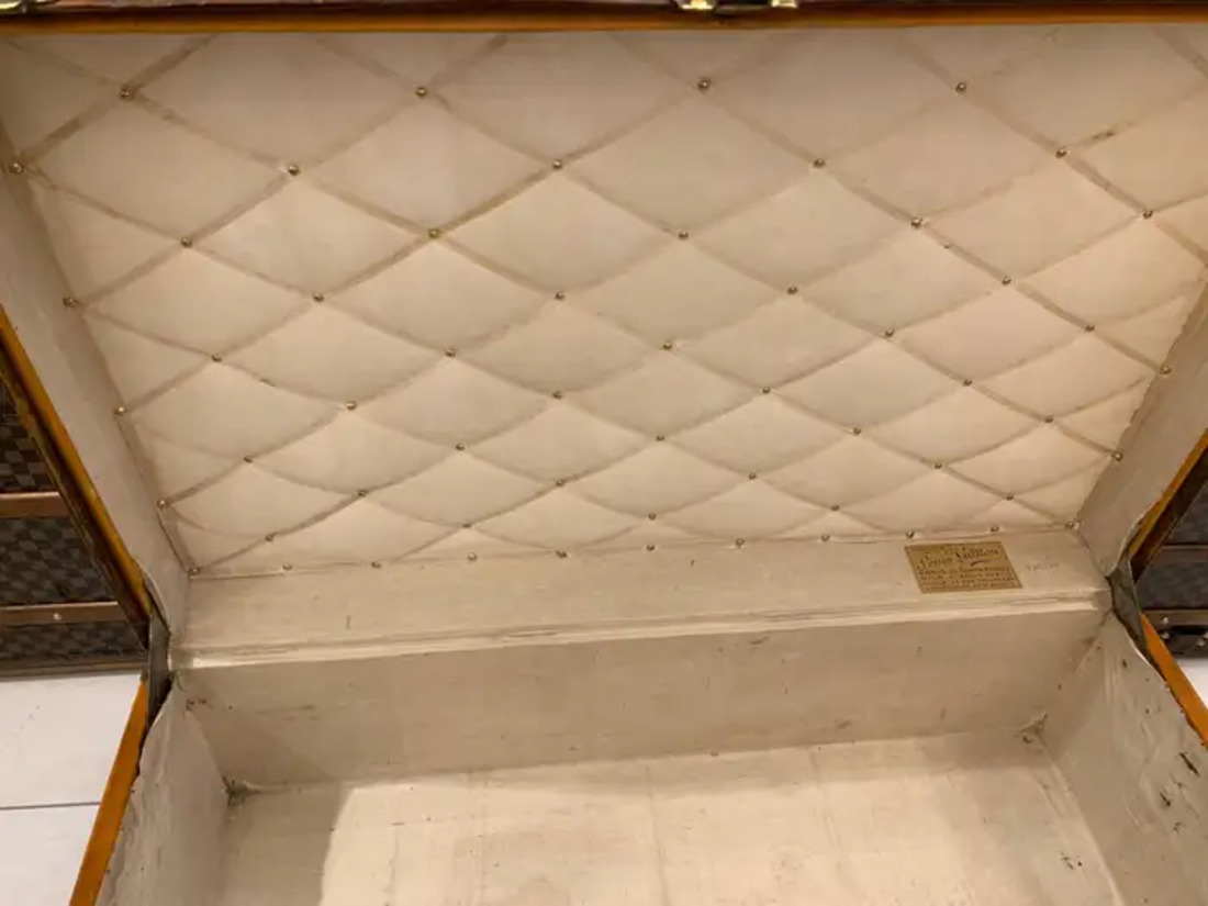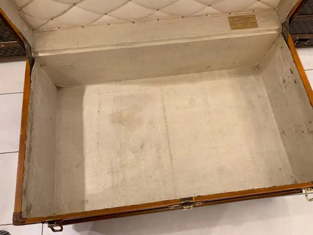 Elle possède toujours son étiquette Louis Vuitton ainsi que son numéro de série. Il est agréable et frais, sans odeur. D’une manière générale, son intérieur est plutôt propre si l’on garde à l’esprit que cette malle a plus de 110 ans. Alors, naturellement, il n’est pas en parfait état, il y a quelques taches mais elles font partie de son charme.