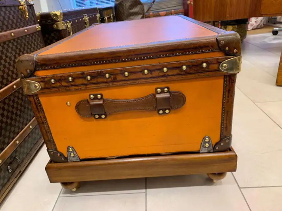 En dessous, elle a conservé sa toile d’origine et ses lattes de bois. Un support en bois a été construit sur mesure pour que ce coffre soit un peu plus haut. Sans son support en bois, il ne mesure que 33 cm de haut. Cette rare malle Louis Vuitton orange peut être utilisée comme table basse ou comme malle à couvertures dans tous les intérieurs chics.