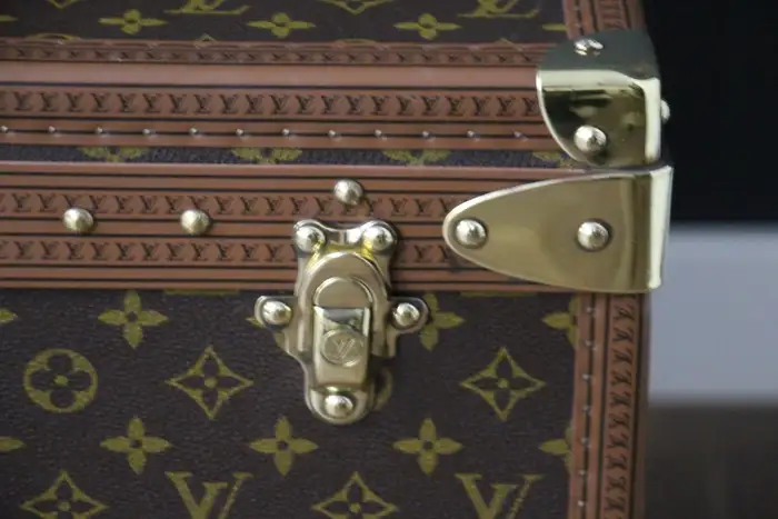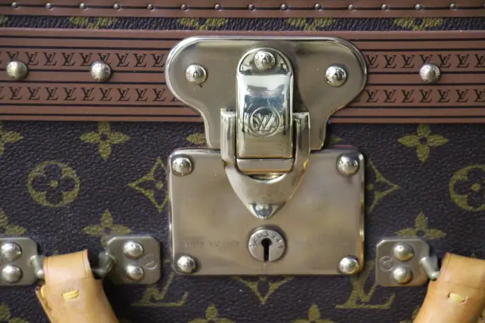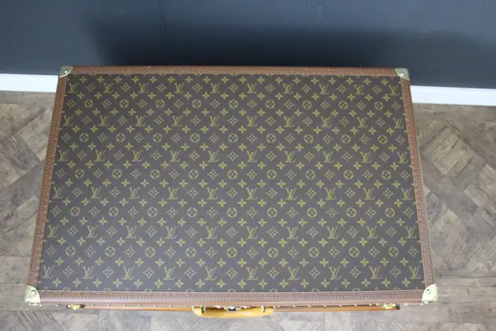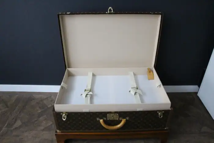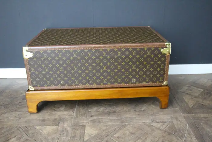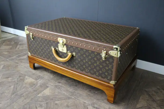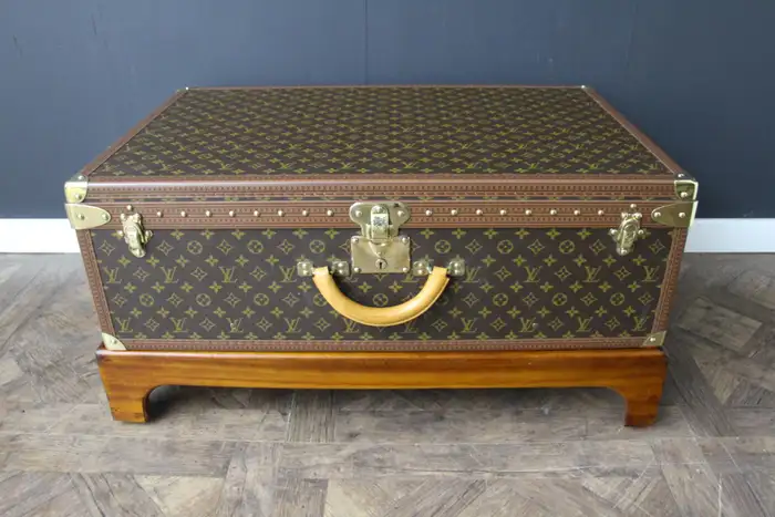 Ce bagage est une magnifique valise Louis Vuitton Alzer monogramme. Cette valise Vuitton de 80 cm est la plus grande et la plus luxueuse des valises Louis Vuitton. Elle est dotée de tous les accessoires en laiton massif estampillés Louis Vuitton : serrures, fermoirs et clous. Très bel intérieur, frais et propre, pas d’odeur, tout est d’origine avec son plateau amovible et son étiquette de numéro de série, elle a encore son étiquette porte nom en cuir d’origine. Dimensions : 80 cm x 52 cm et 26 cm de hauteur. Son support en bois a été fabriqué sur mesure pour permettre une utilisation en tant que table basse, atteignant 40 cm de haut. Cette Malle Vuitton pourrait aussi se transformer en une parfaite malle à couvertures ou bout de lit. Cette valise Louis Vuitton occasion serait un parfait sujet de conversation dans tous les intérieurs haut de gamme et pourrait s’accorder avec une décoration classique ou très moderne.