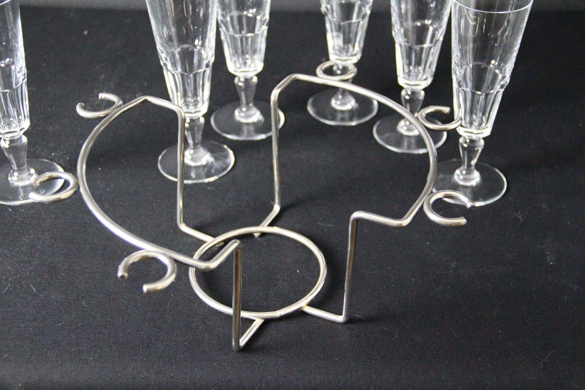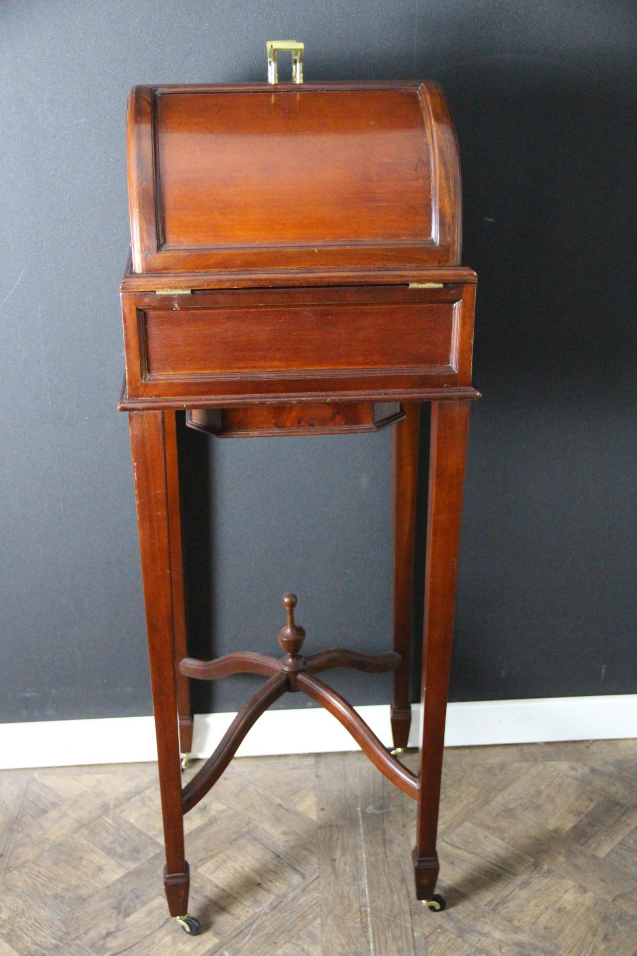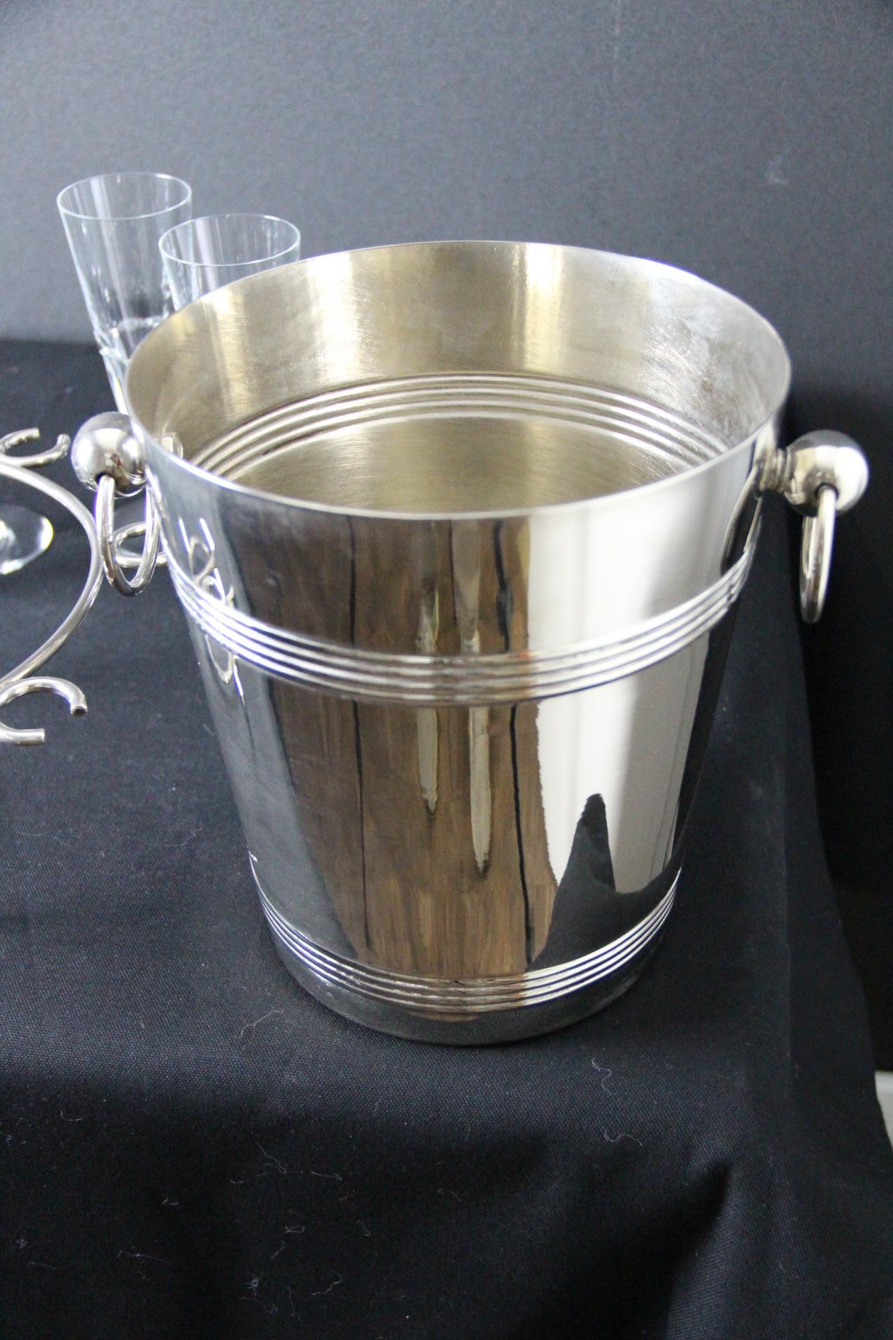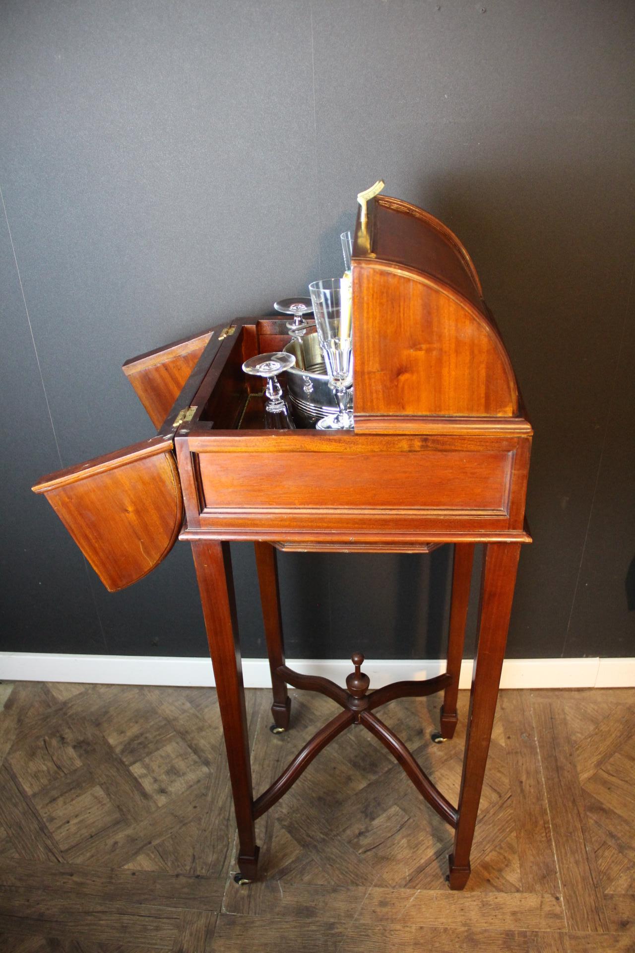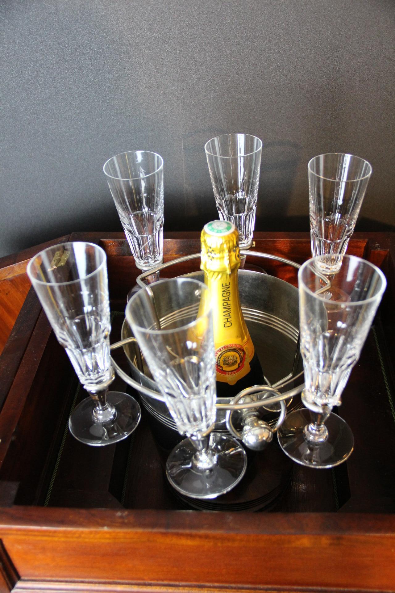 Ce bar d’appartement anglais est particulièrement inhabituel et élégant. Fabriqué en magnifique noyer de couleur marron, des années 1920, son dessus en forme d’arc s’ouvre grâce à 2 poignées en bronze massif pour révéler un intérieur époustouflant composé d’un ensemble complet de 6 verres à champagne Baccarat et d’un magnifique seau à glace en métal argenté. Tous ses verres sont estampillés Baccarat. Chaque verre est maintenu à l’intérieur grâce à un anneau ajusté ainsi que le seau à glace.