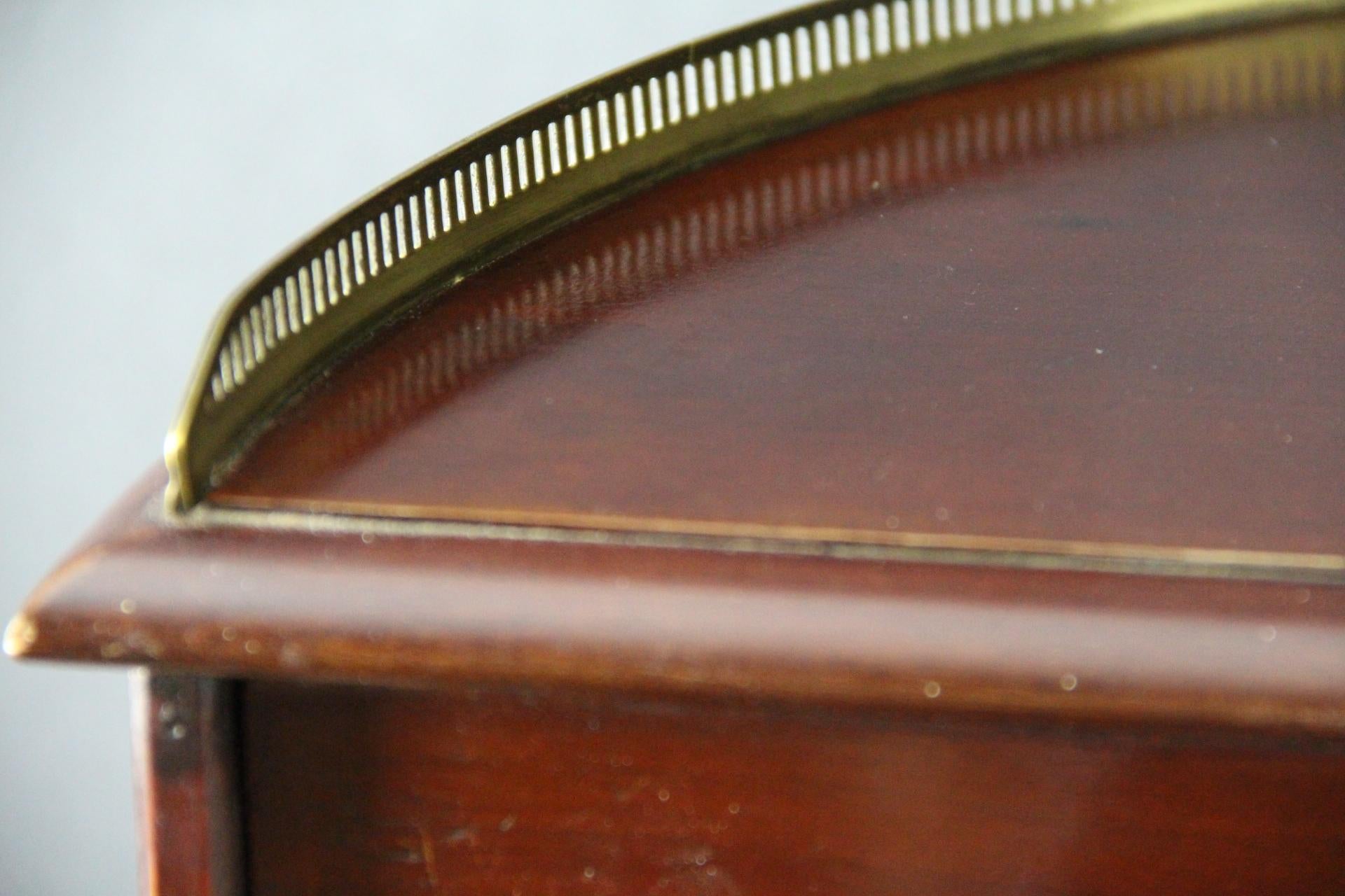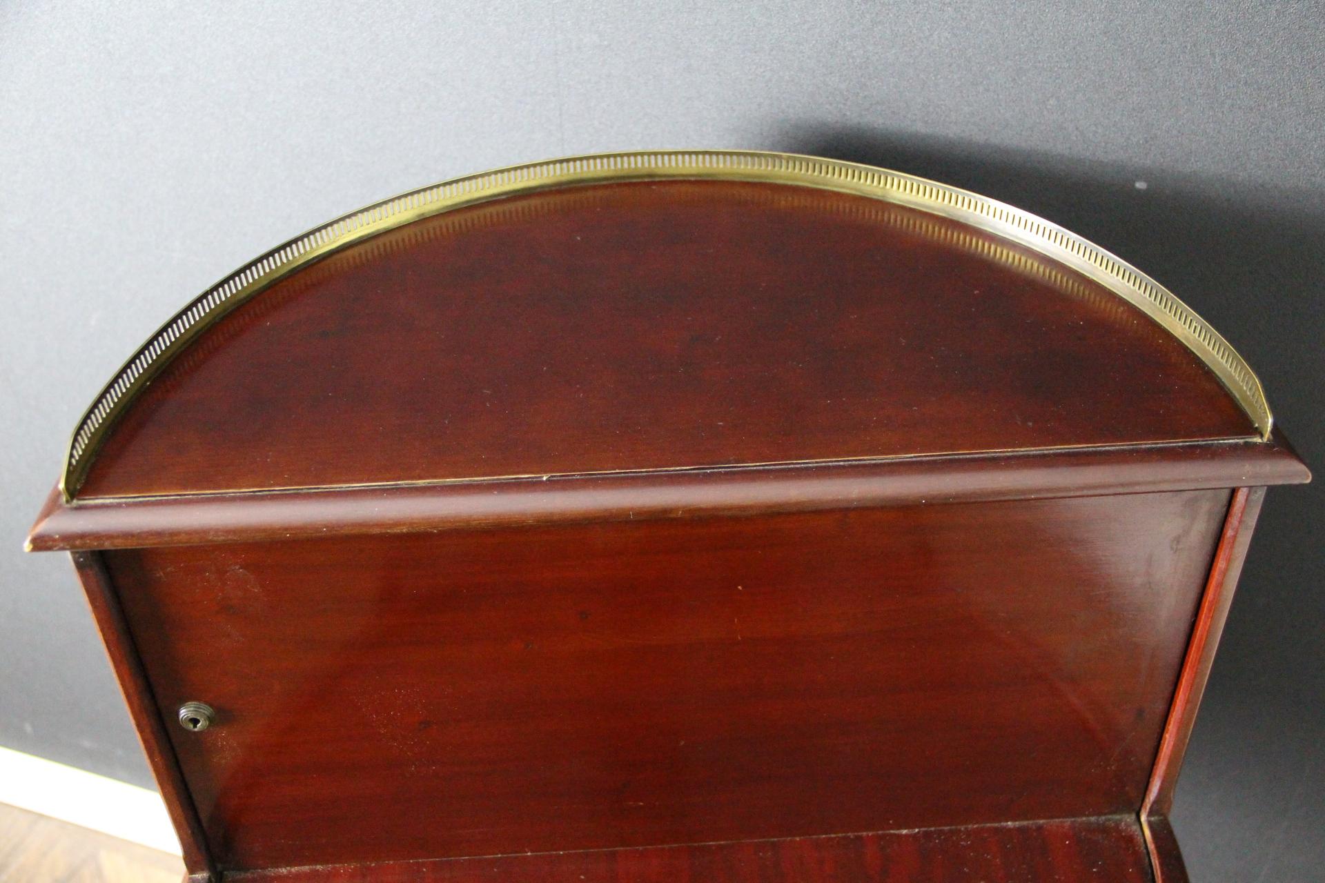 Derrière l’ensemble de pièces en cristal, le fond est en miroir biseauté pour ajouter de la profondeur et de l’élégance à tout son ensemble. Ce bar rappelle un bar de la période de la prohibition américaine, cachant son compartiment à boissons en un clin d’œil. Chaque verre est maintenu à l’intérieur grâce à un espace ajusté ainsi que les carafes. Son sommet est entouré d’une très belle galerie de laiton. Il repose sur quatre pieds coniques reliés par une tablette circulaire avec galerie tournée.