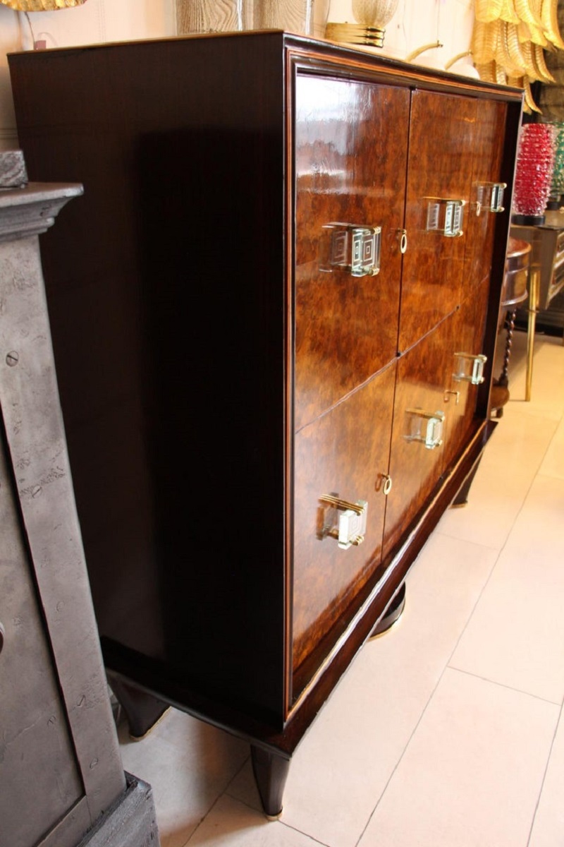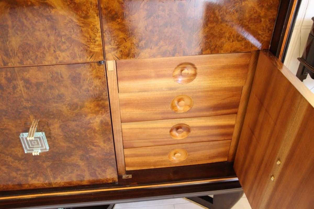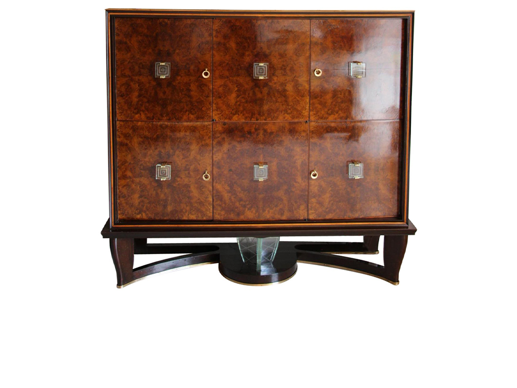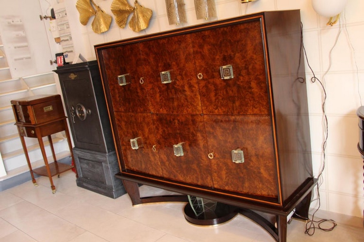 Ce spectaculaire et très rare meuble bar Art déco créé par Vittorio Dassi date des années 1940. Il comporte 6 portes s’ouvrant sur différents compartiments de rangement.