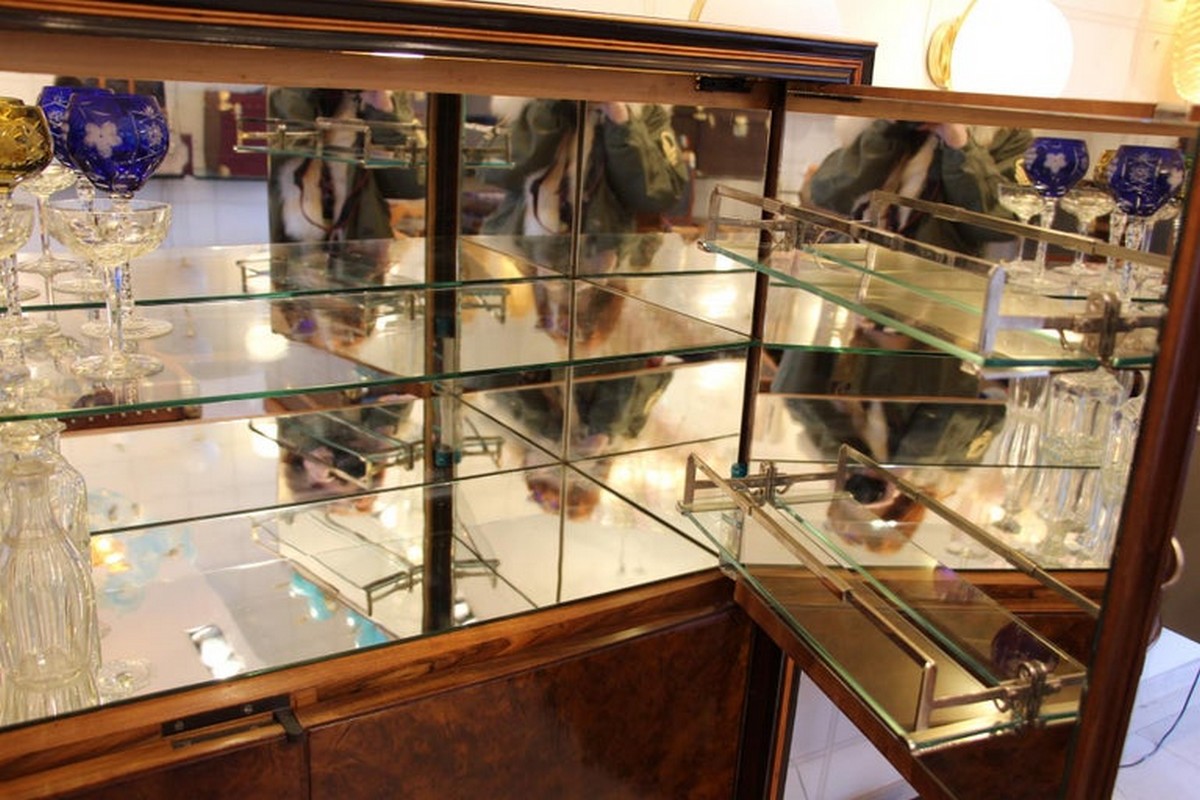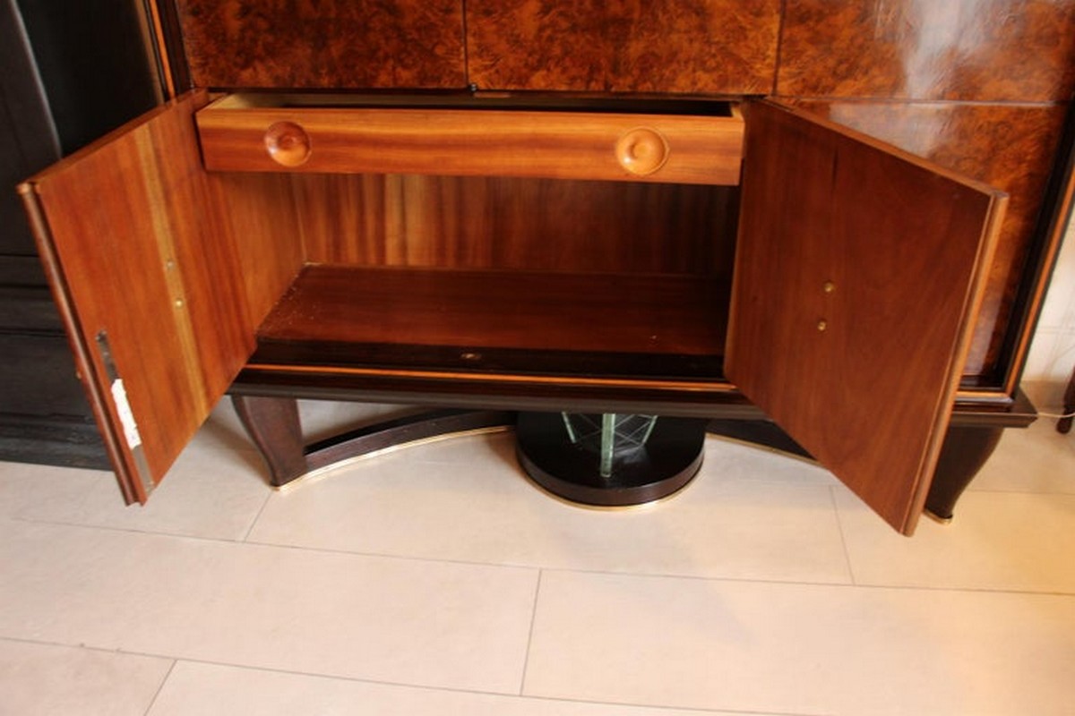 La partie supérieure gauche comporte 2 étagères tandis que la partie supérieure droite s’ouvre pour révéler un bar très élégant .Ce bar est éclairé par le haut et comporte des miroirs sur ses côtés, 1 étagère en verre et 2 petites étagères maintenues par des supports en bronze argenté sur ses portes.