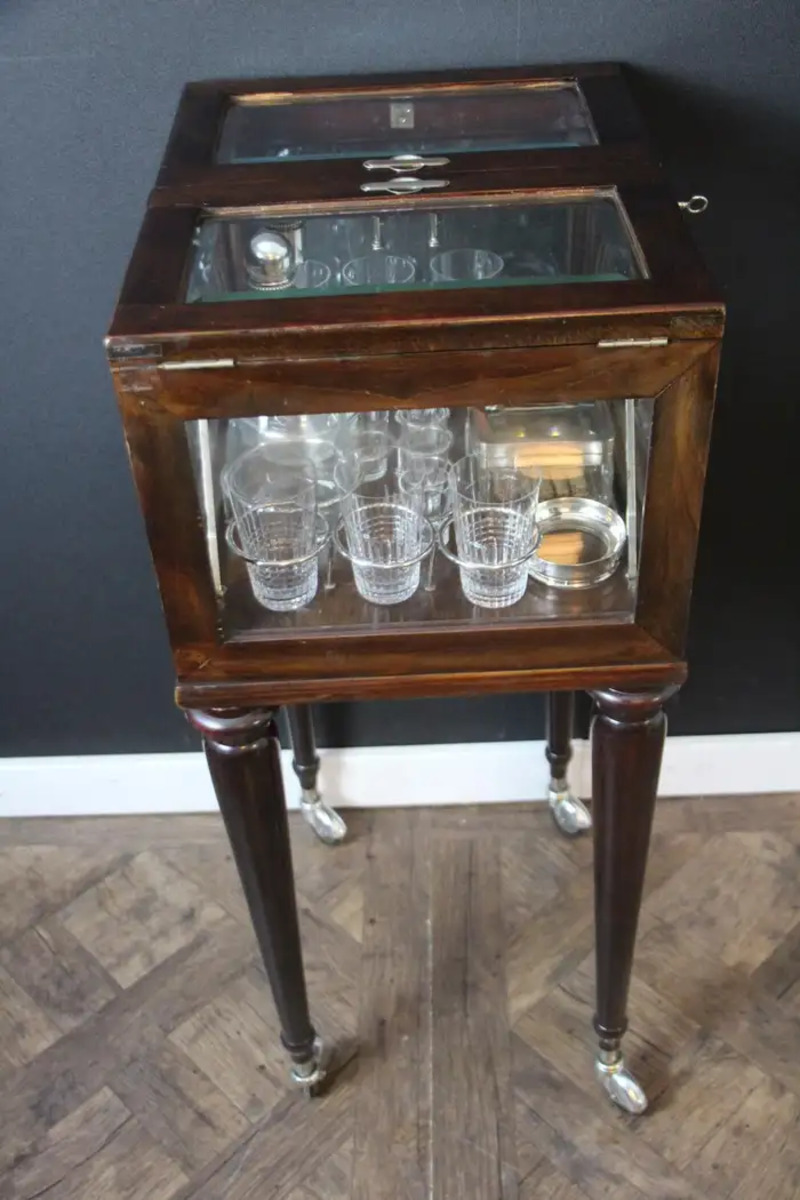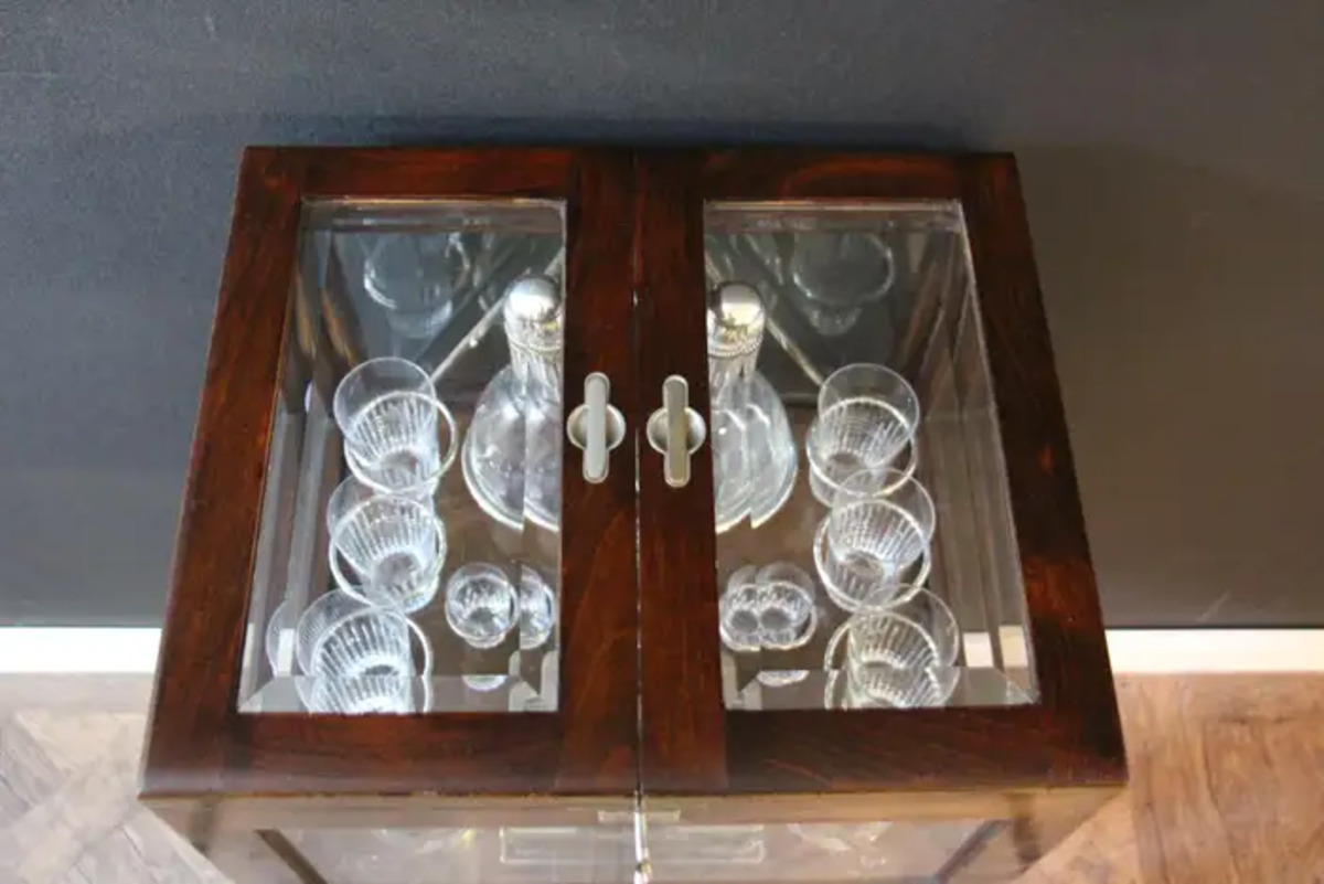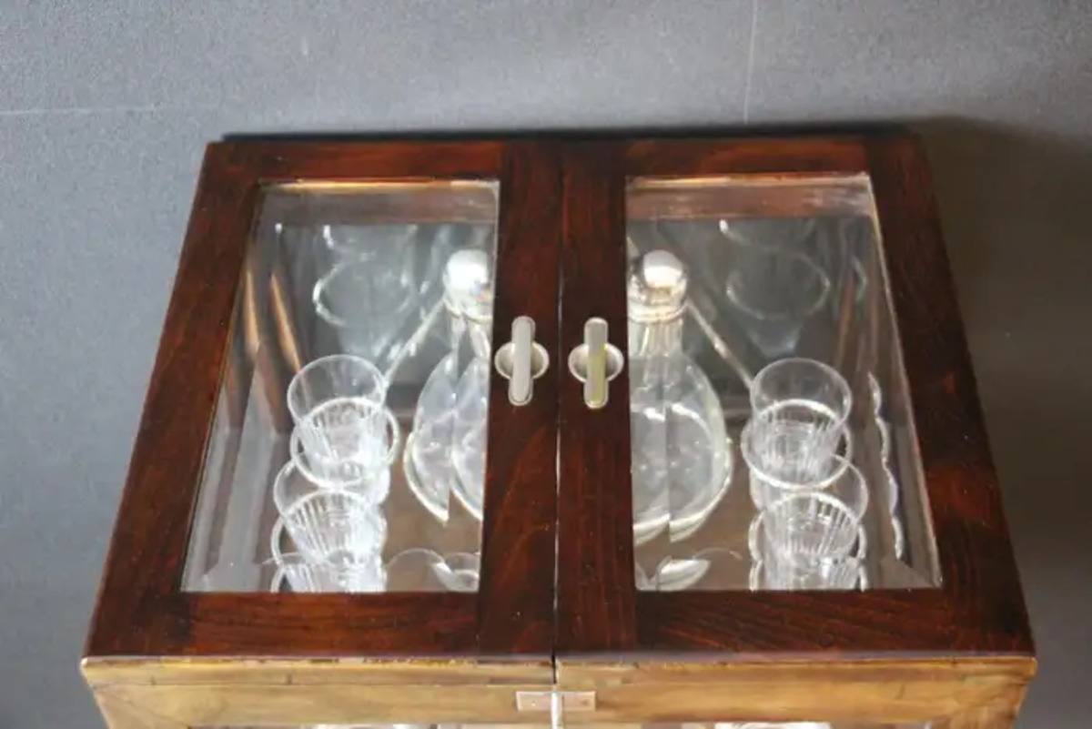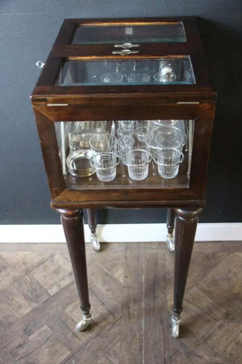 Et lorsqu’il s’ouvre, c’est à couper le souffle avec sa plate-forme qui s’élève garnie de verres en cristal taillé de différentes tailles… Il se verrouille grâce à sa clé de fonctionnement. Il s’agit d’une bar vintage de qualité supérieure avec des finitions solides.