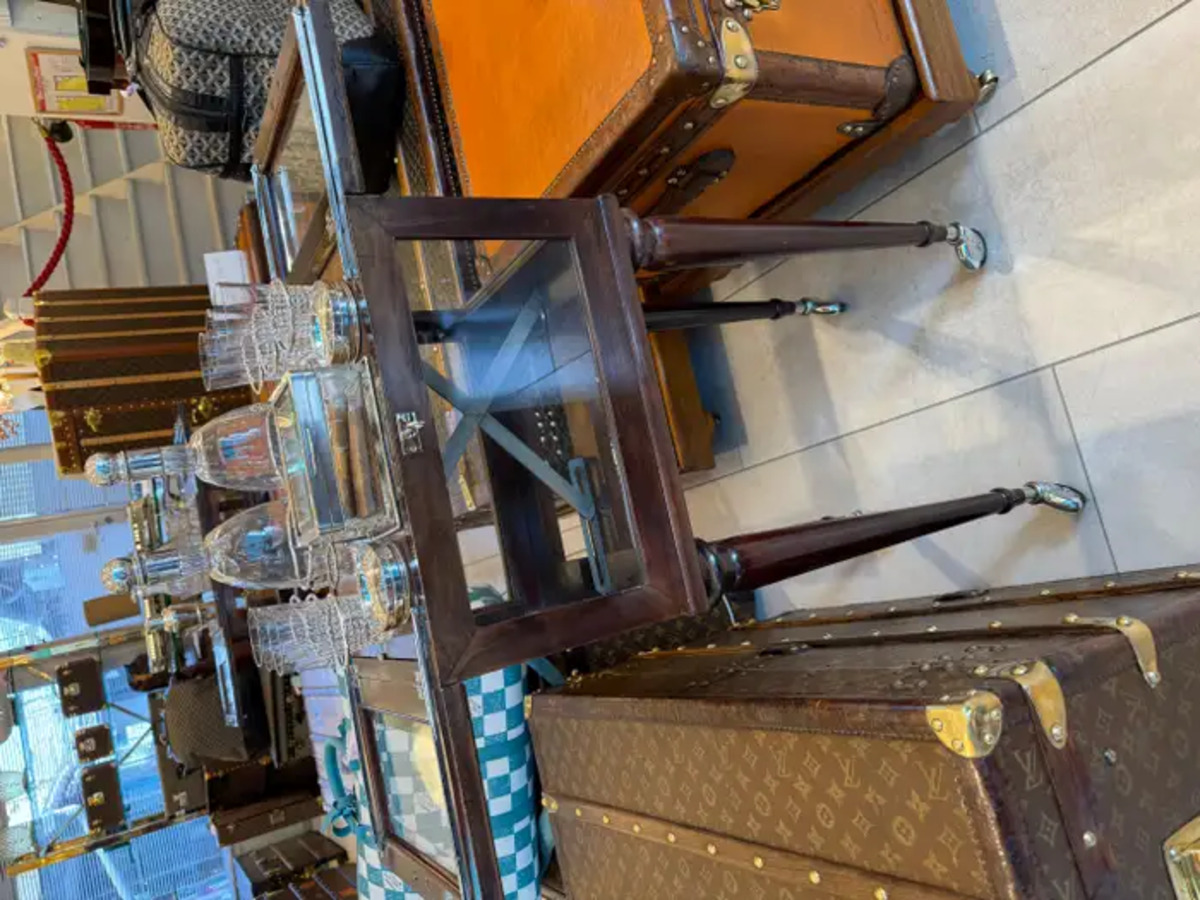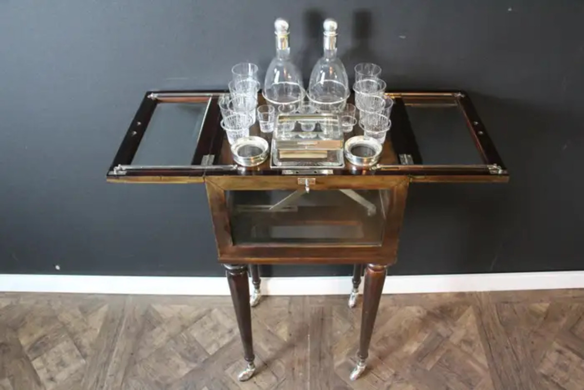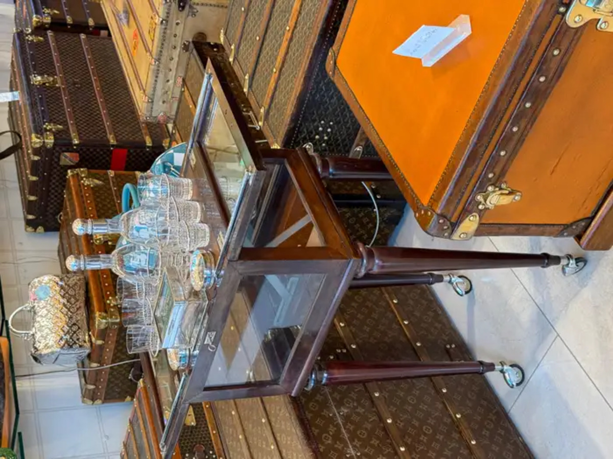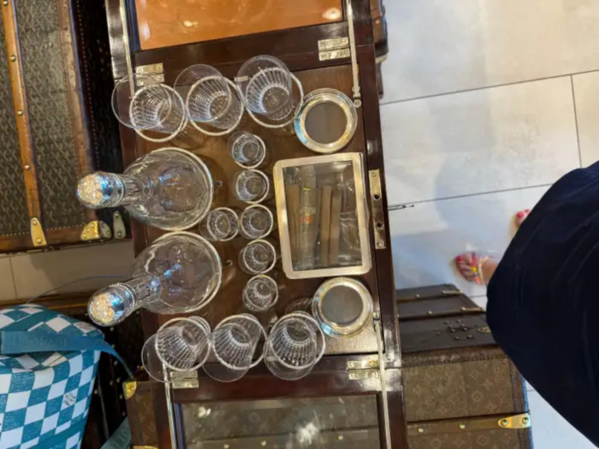 Et lorsqu’il s’ouvre, c’est à couper le souffle avec sa plate-forme qui s’élève garnie de verres en cristal taillé de différentes tailles… Il se verrouille grâce à sa clé de fonctionnement. Il s’agit d’une bar vintage de qualité supérieure avec des finitions solides.