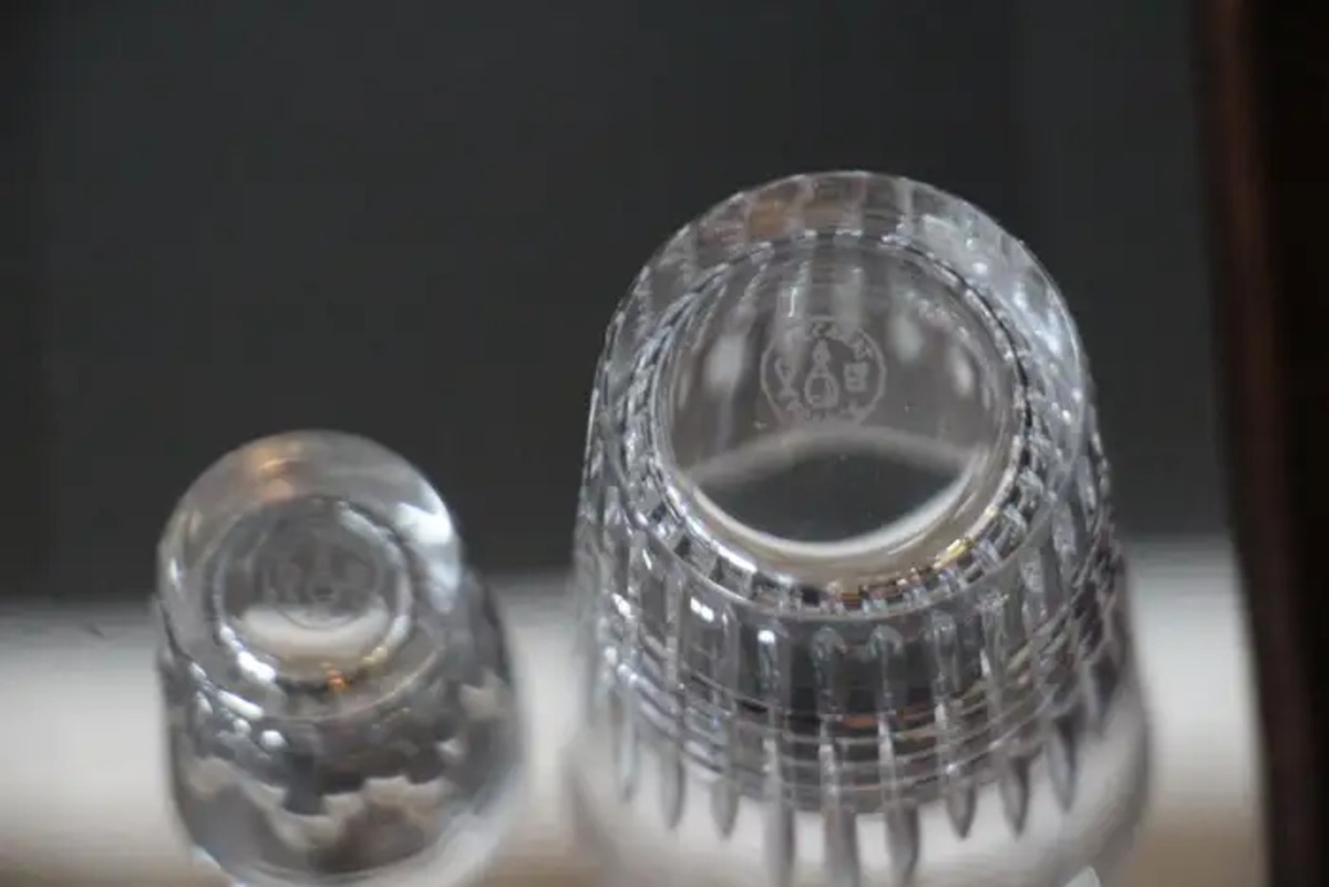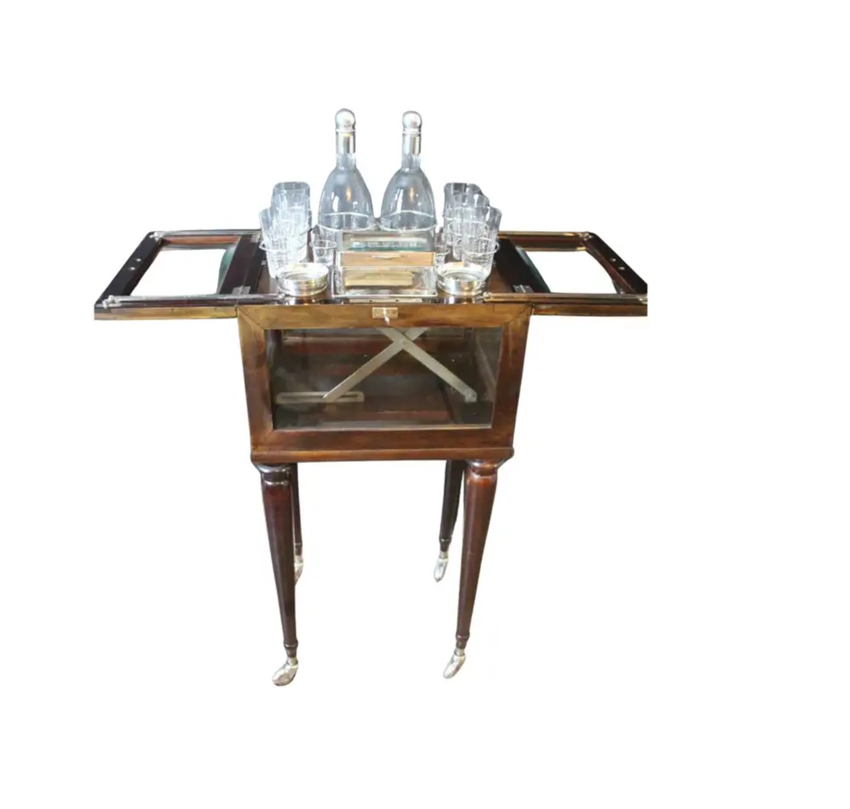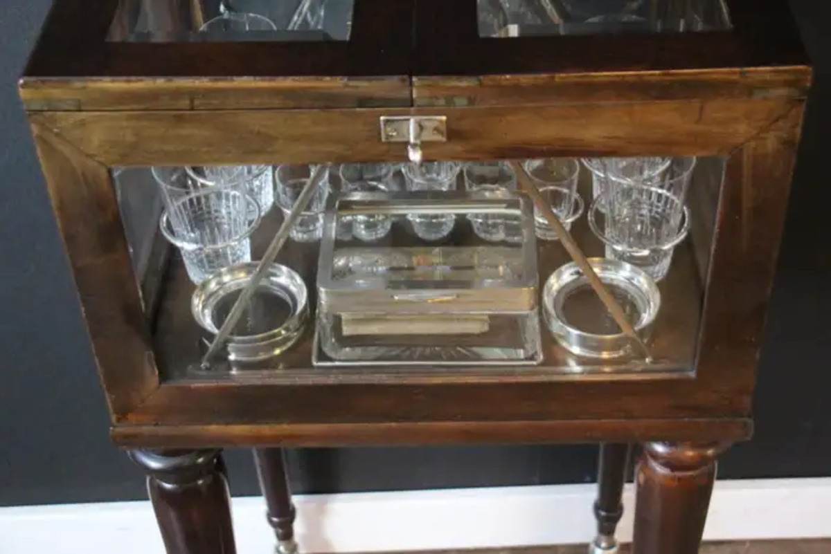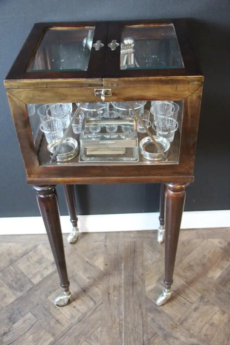 Ce meuble bar anglais est particulièrement insolite et élégant. Il est en noyer brun et date des années 1950, il a des côtés en verre et une partie supérieure en verre. La partie supérieure se soulève pour révéler un ensemble complet de 6 grands verres Baccarat, 6 petits verres Baccarat, 2 carafes en cristal, 1 boîte à cigares en cristal. et 4 sous-verres. Tous ses verres sont estampillés Baccarat.
