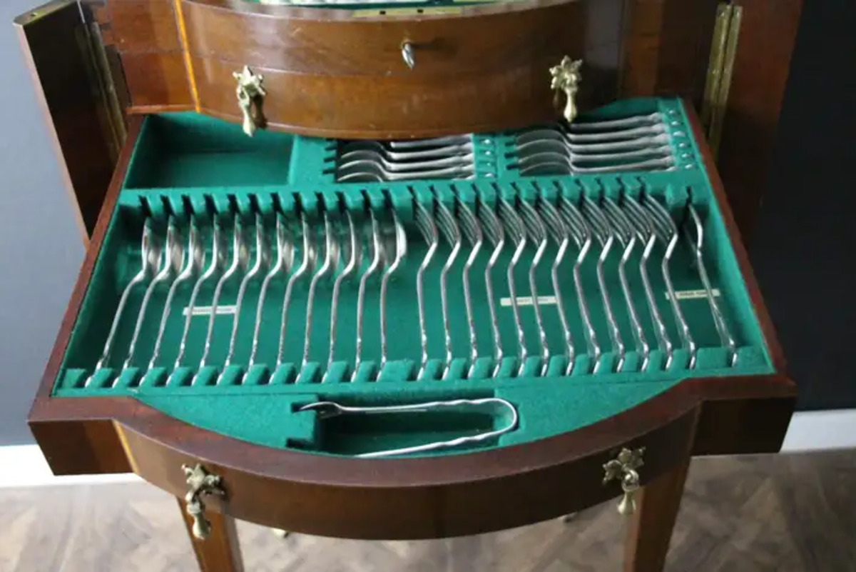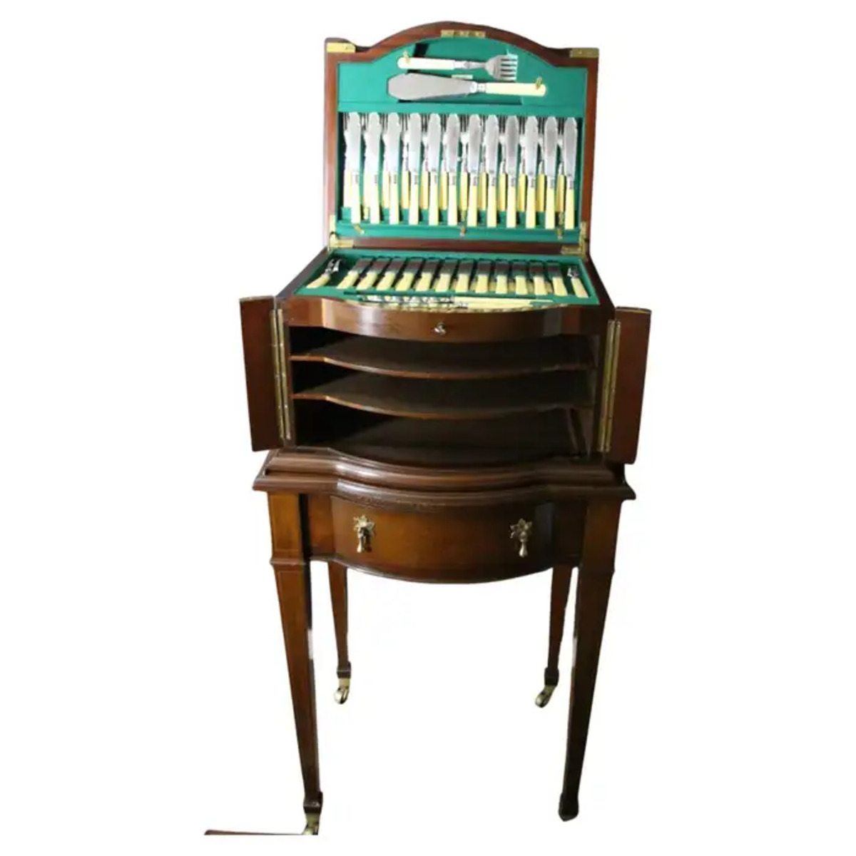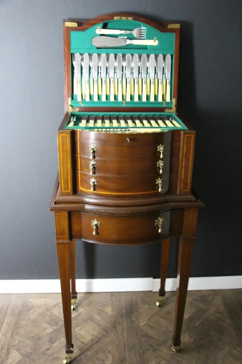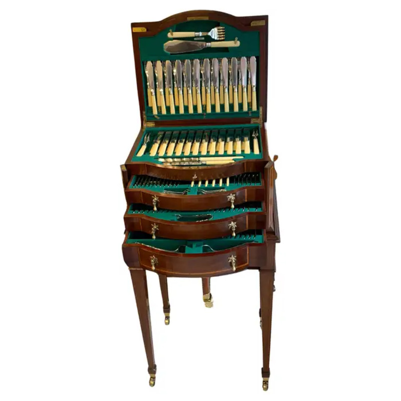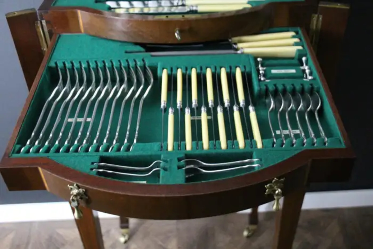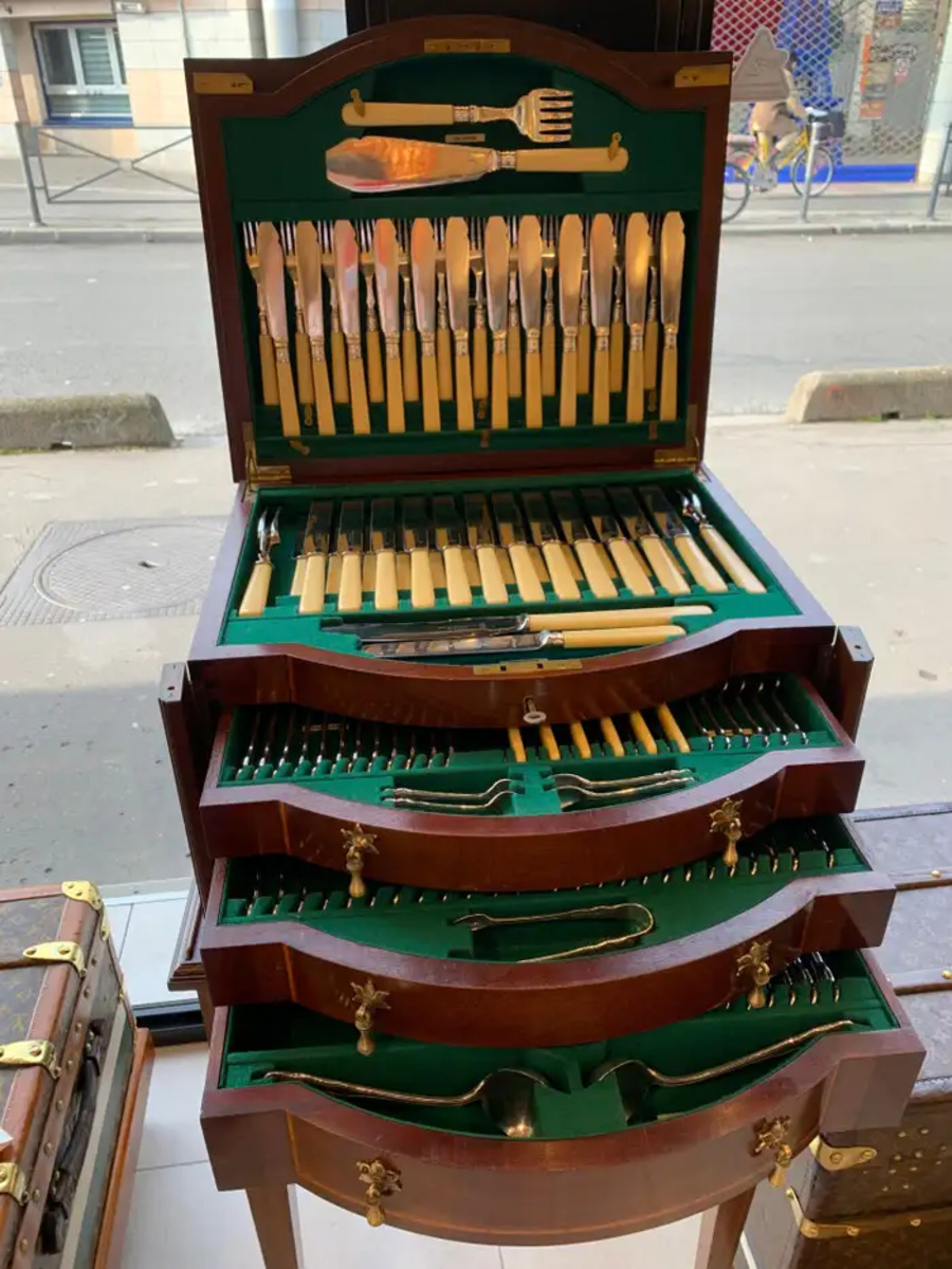 Ils se verrouillent grâce à des pilastres de verrouillage de chaque côté. Le coffret a couverts est amovible du support si nécessaire, avec 2 poignées latérales en laiton massif. En soulevant son couvercle, on découvre 1 plateau aménagé avec son spectaculaire jeu de couverts, présenté horizontalement mais aussi sous son couvercle une série de couteaux et de fourchettes.