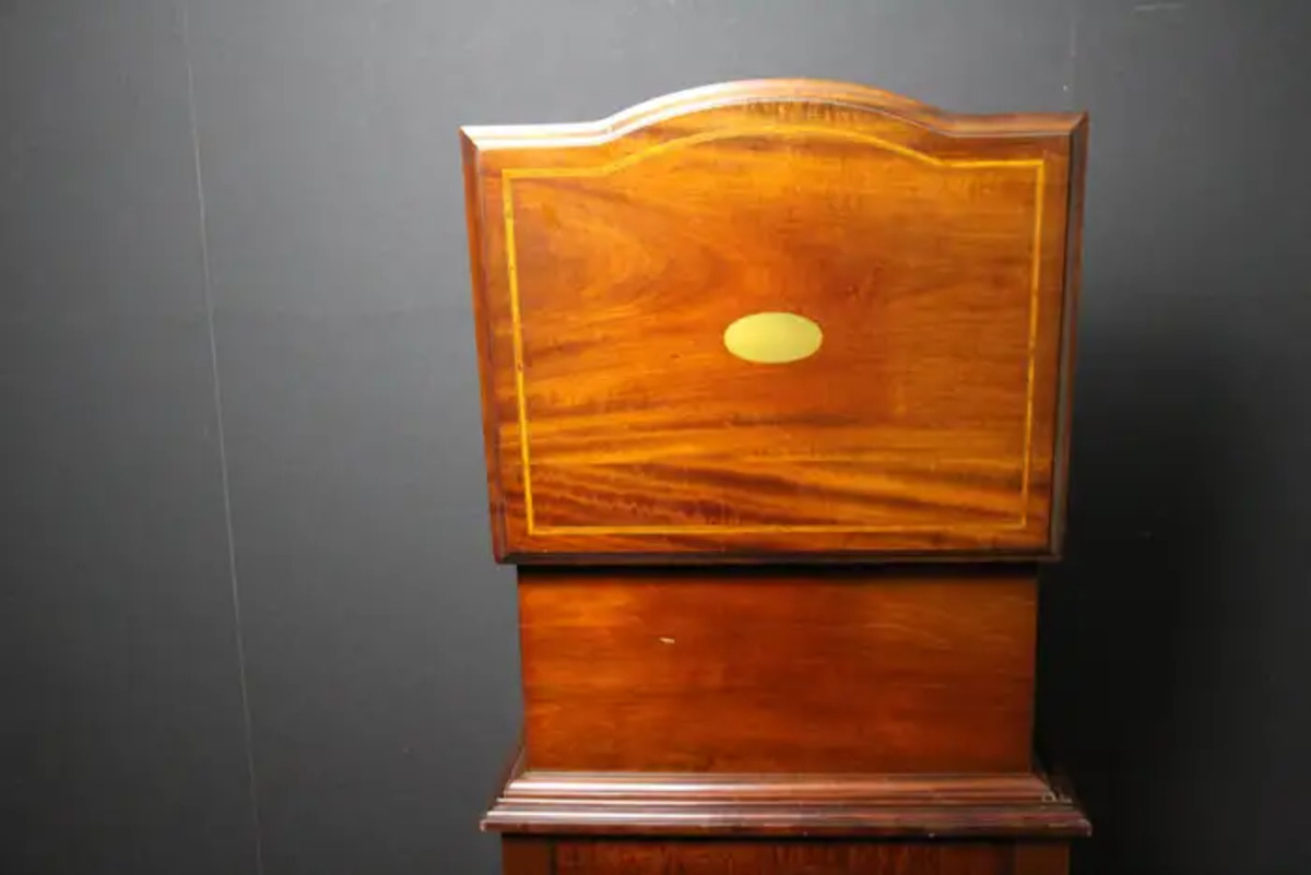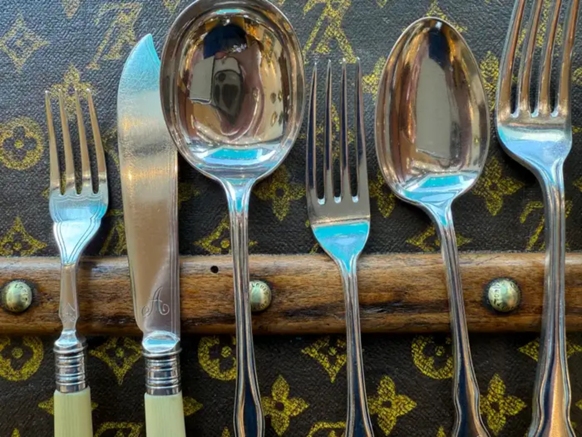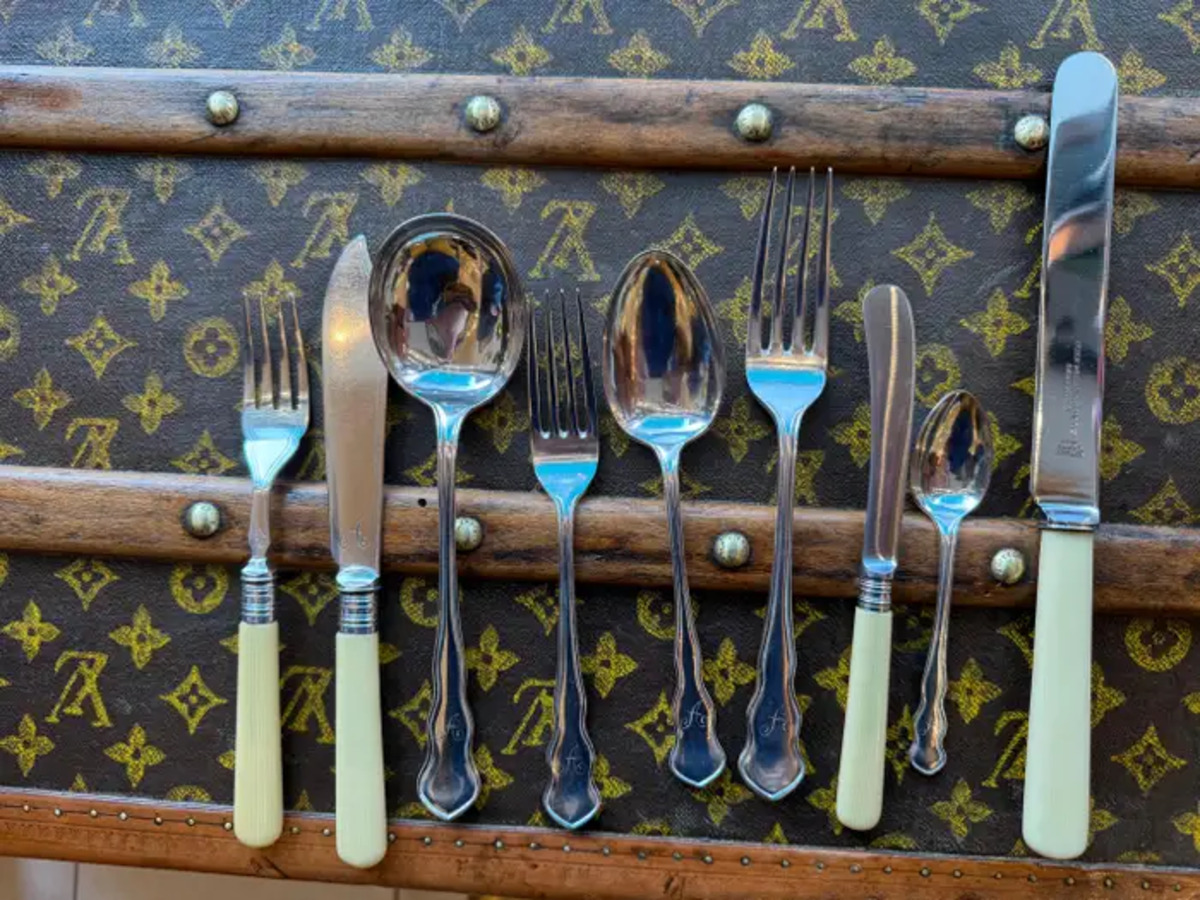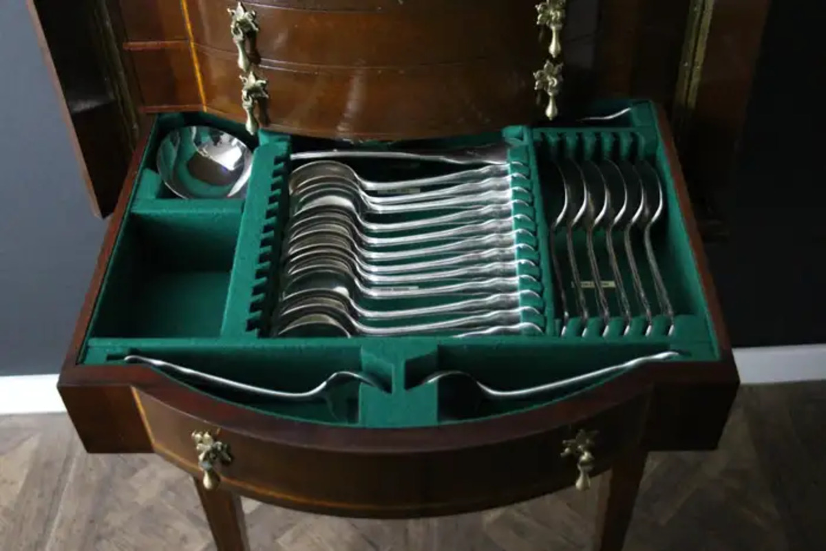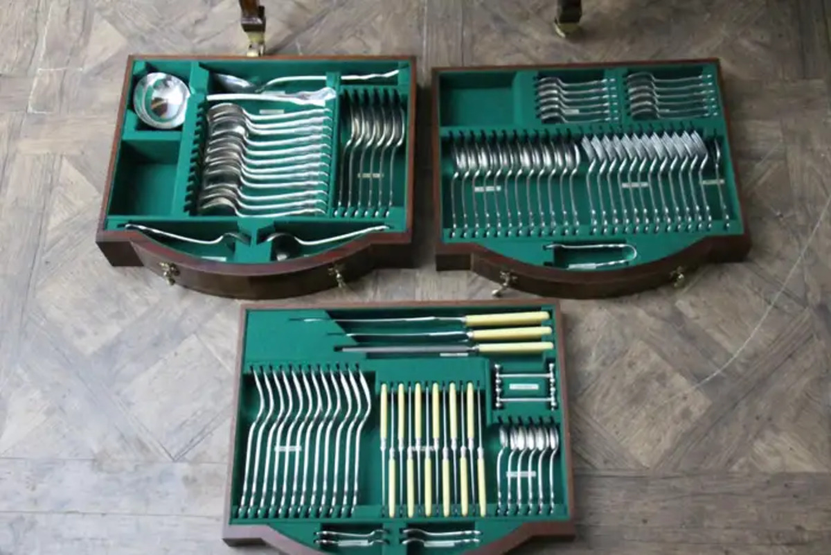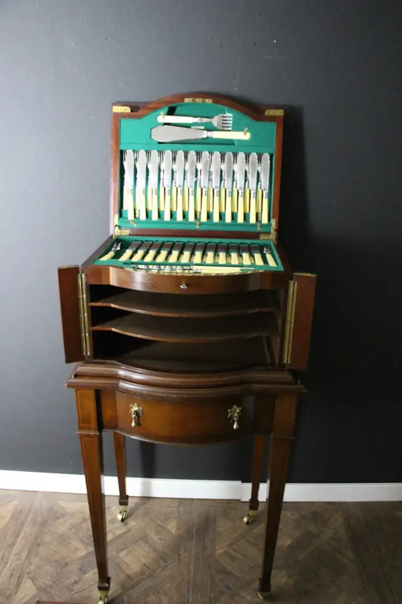 Ils se verrouillent grâce à des pilastres de verrouillage de chaque côté. Le coffret a couverts est amovible du support si nécessaire, avec 2 poignées latérales en laiton massif. En soulevant son couvercle, on découvre 1 plateau aménagé avec son spectaculaire jeu de couverts, présenté horizontalement mais aussi sous son couvercle une série de couteaux et de fourchettes.