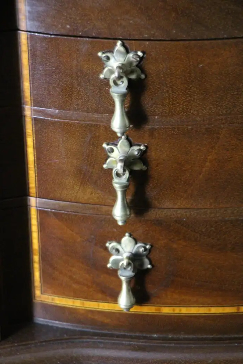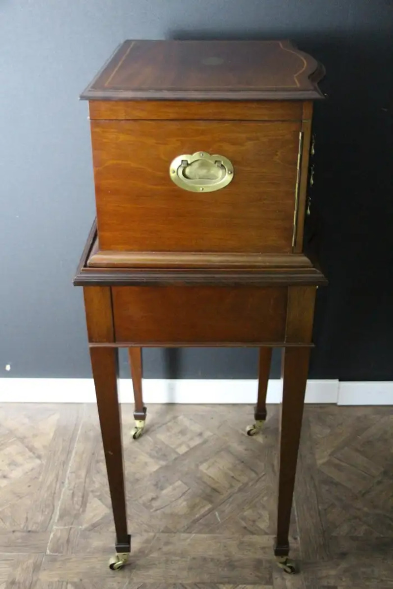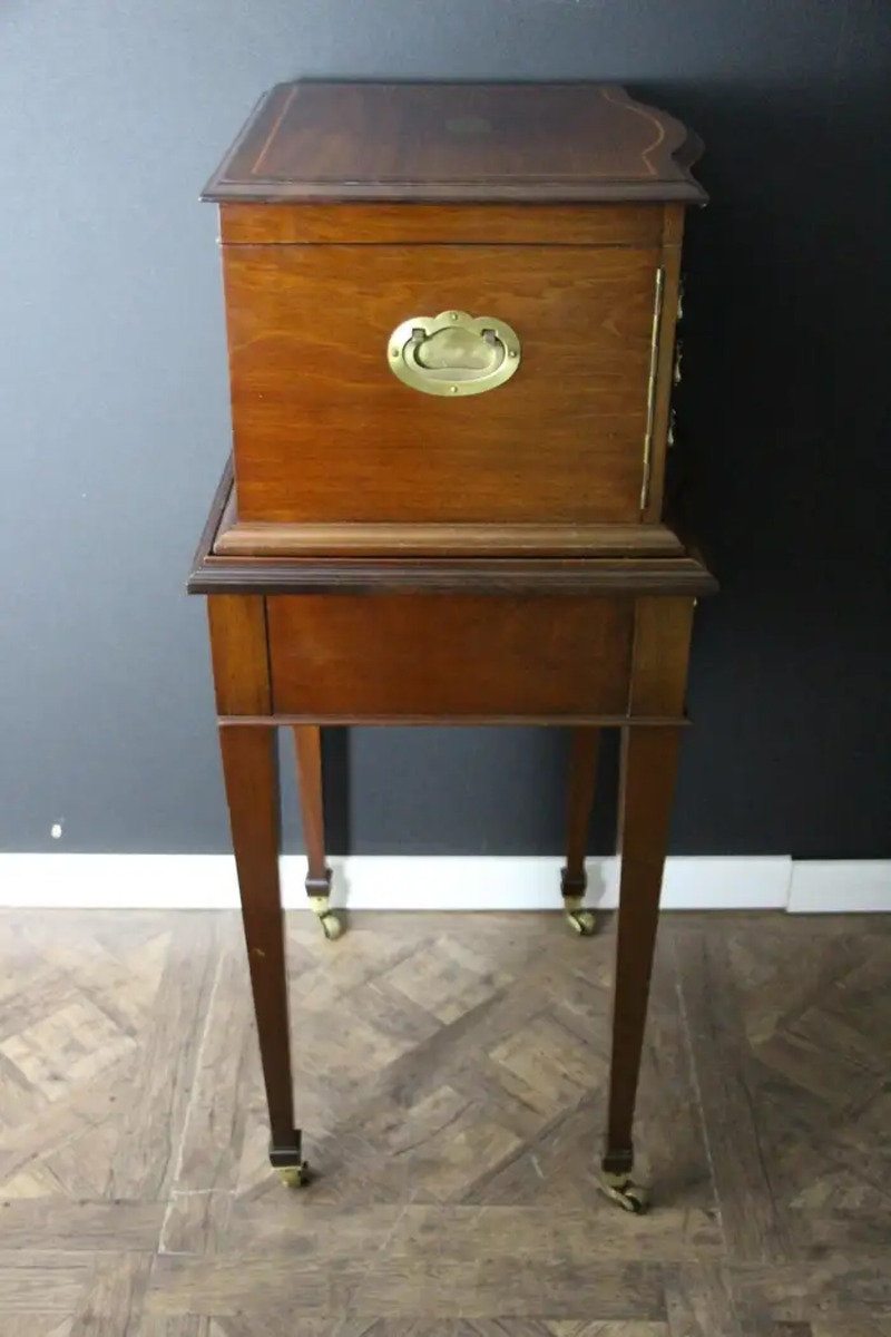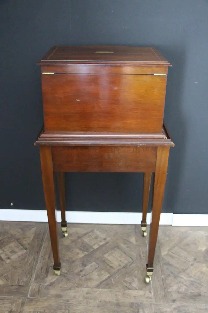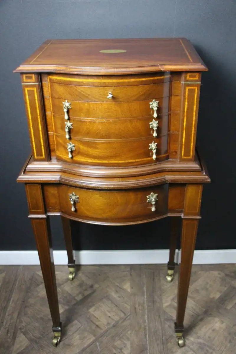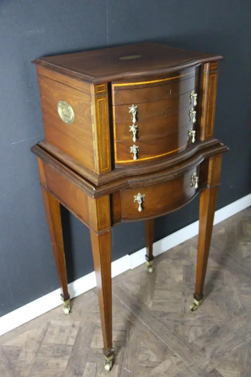 Ce meuble ménagère a couverts exceptionnel est très élégant car il présente une belle forme serpentine. Il s’agit d’un noyer flammé, d’une couleur dorée très chaleureuse. C’est un meuble en 2 parties, avec son piétement (comprenant 1 tiroir) et son coffre de amovible composé de 4 tiroirs aménagés.