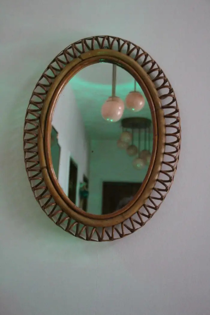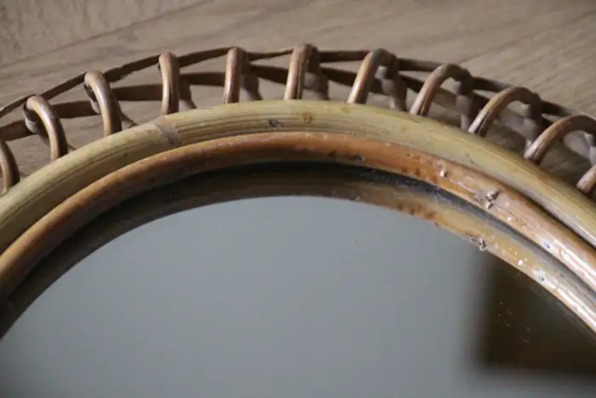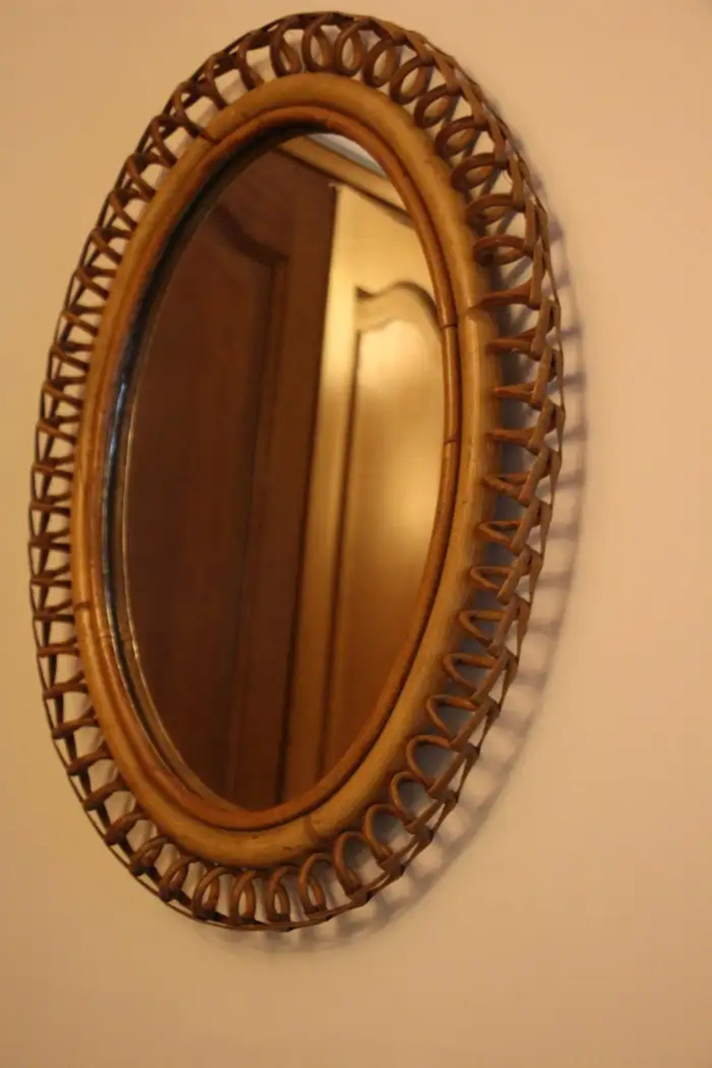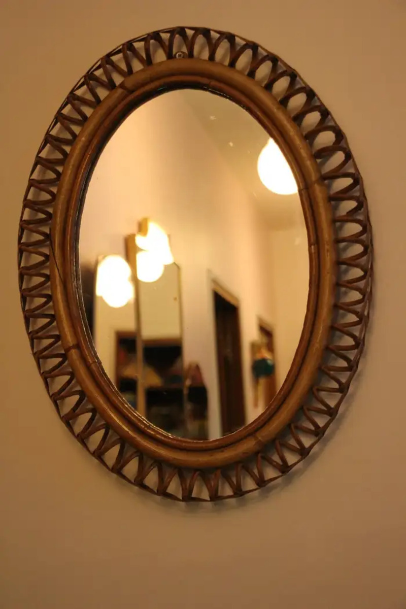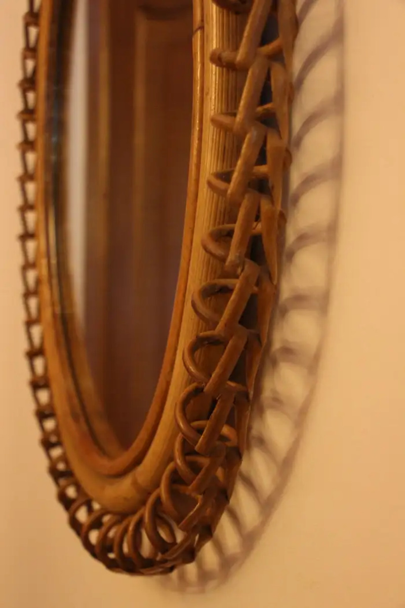 Miroir mural oval Vintage des années 60 en Rotin et Bambou par Franco Albini