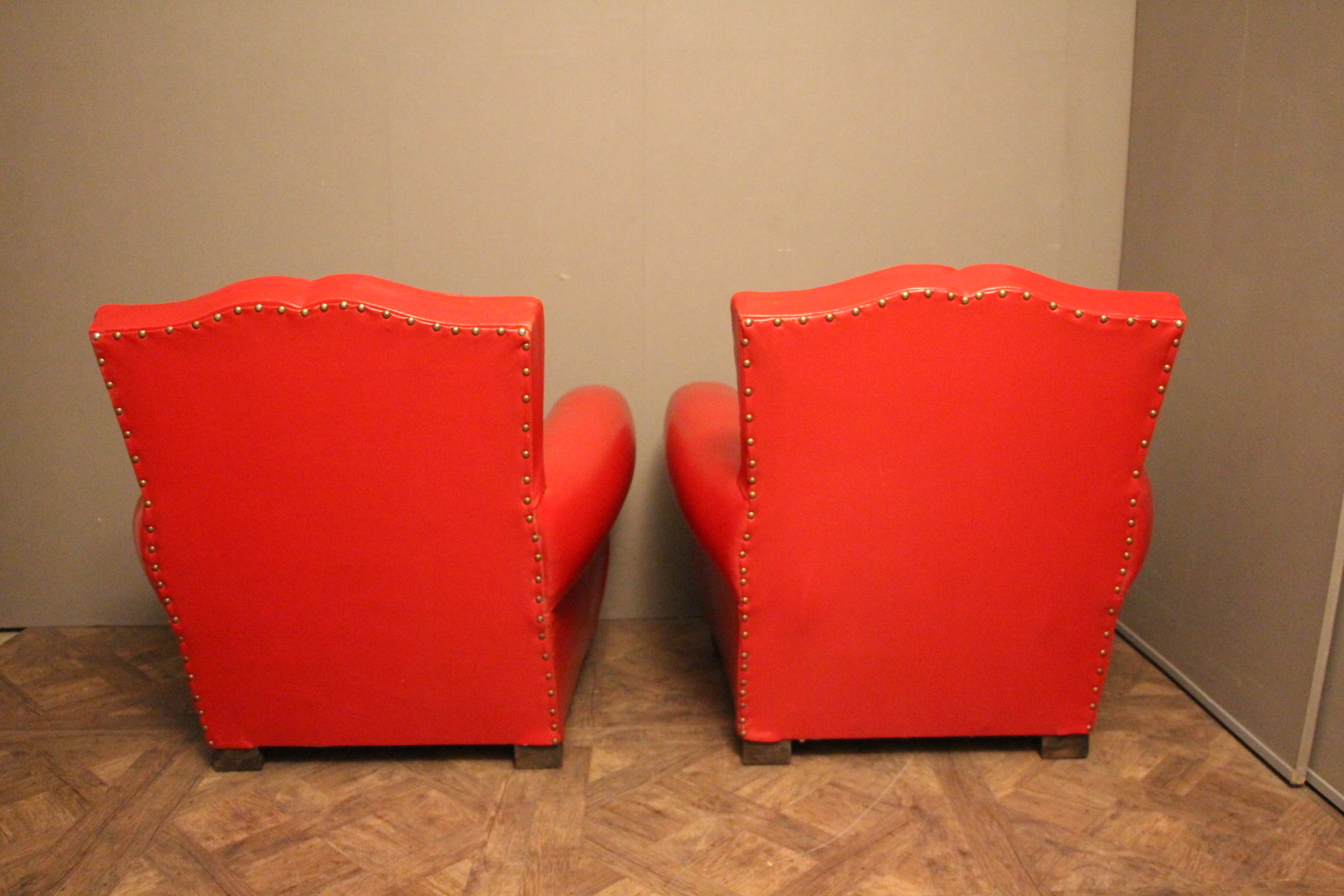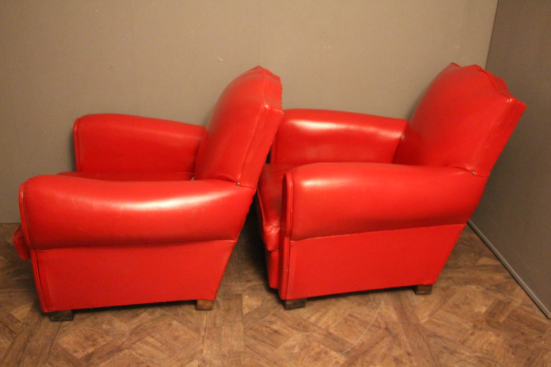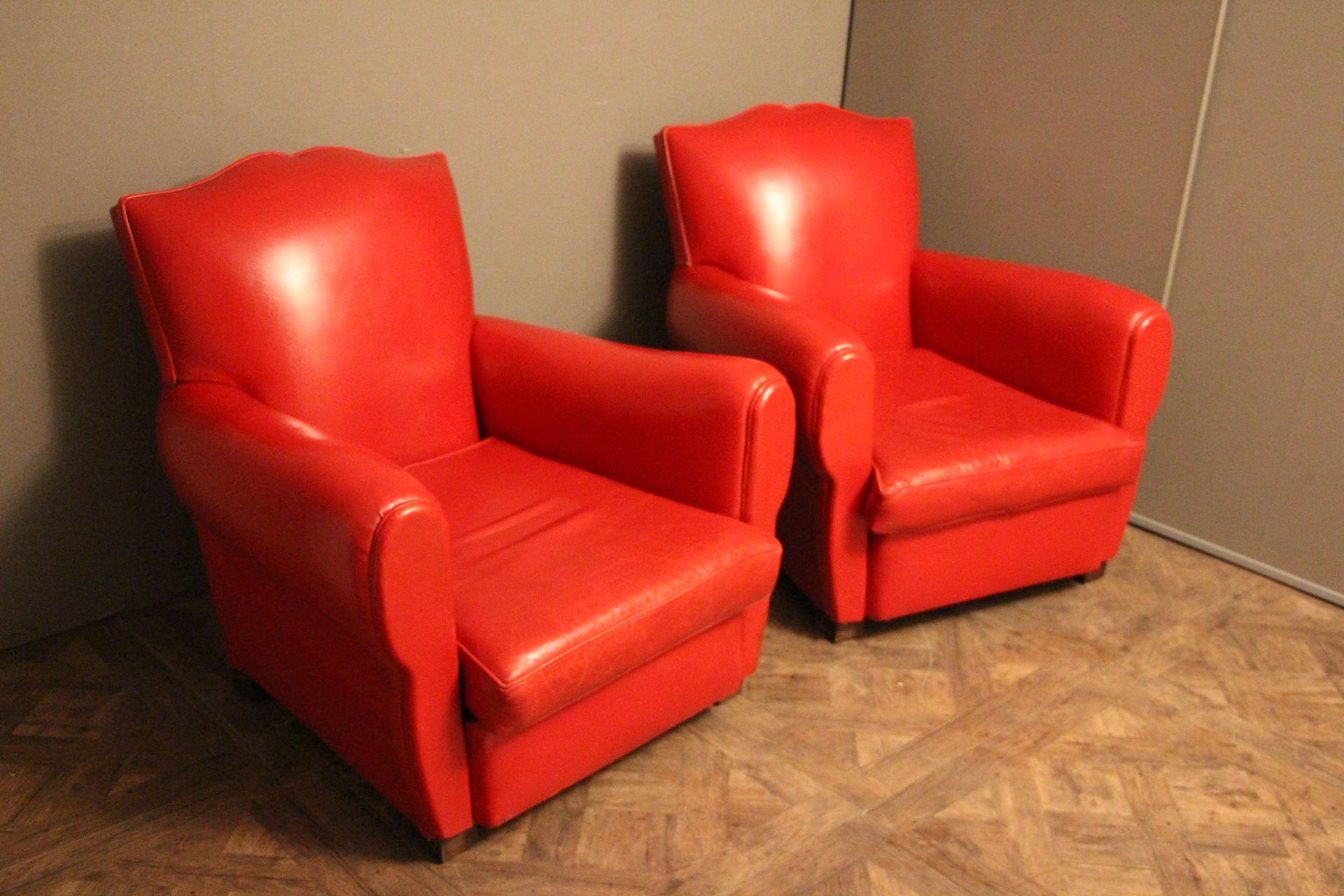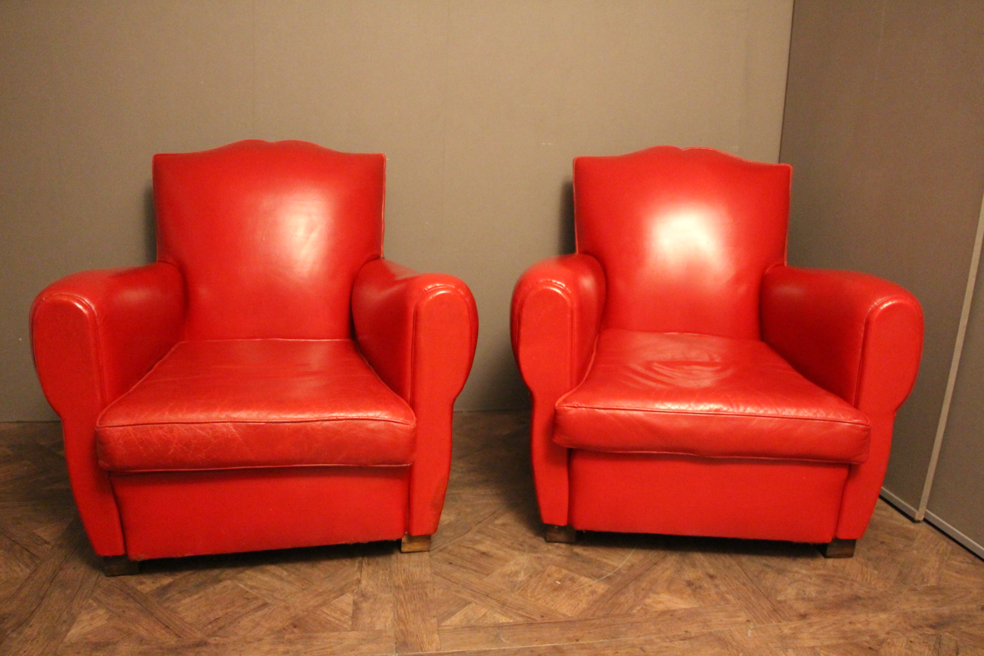 Paire d’anciens fauteuils club en cuir rouge, passe poil cuir blanc, à dossier de forme “moustache”, finition des contours du dos en clous laiton. Superbe patine et couleur inhabituelle. Ils sont très confortables et l’assise est ferme. Ils datent des années 1930 et sont dans leur état d’origine.