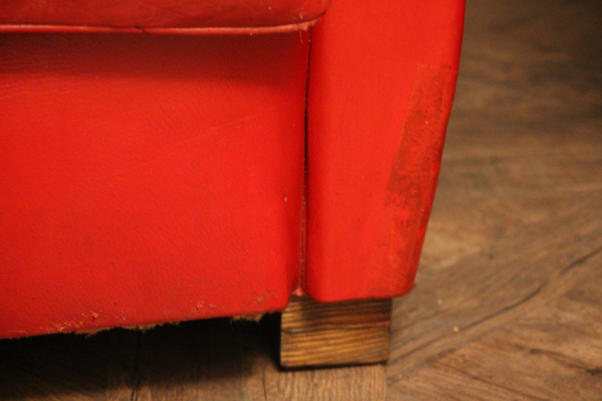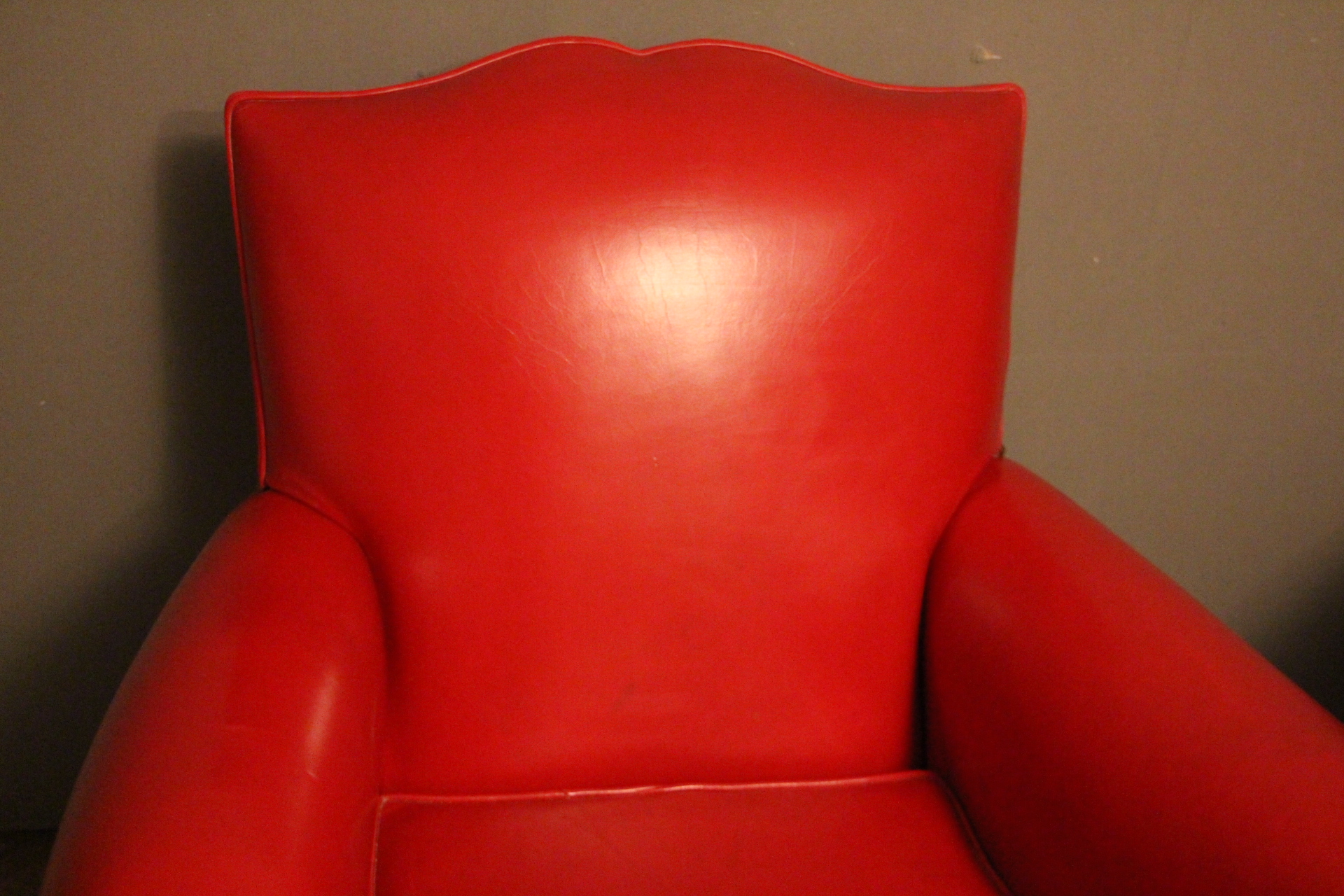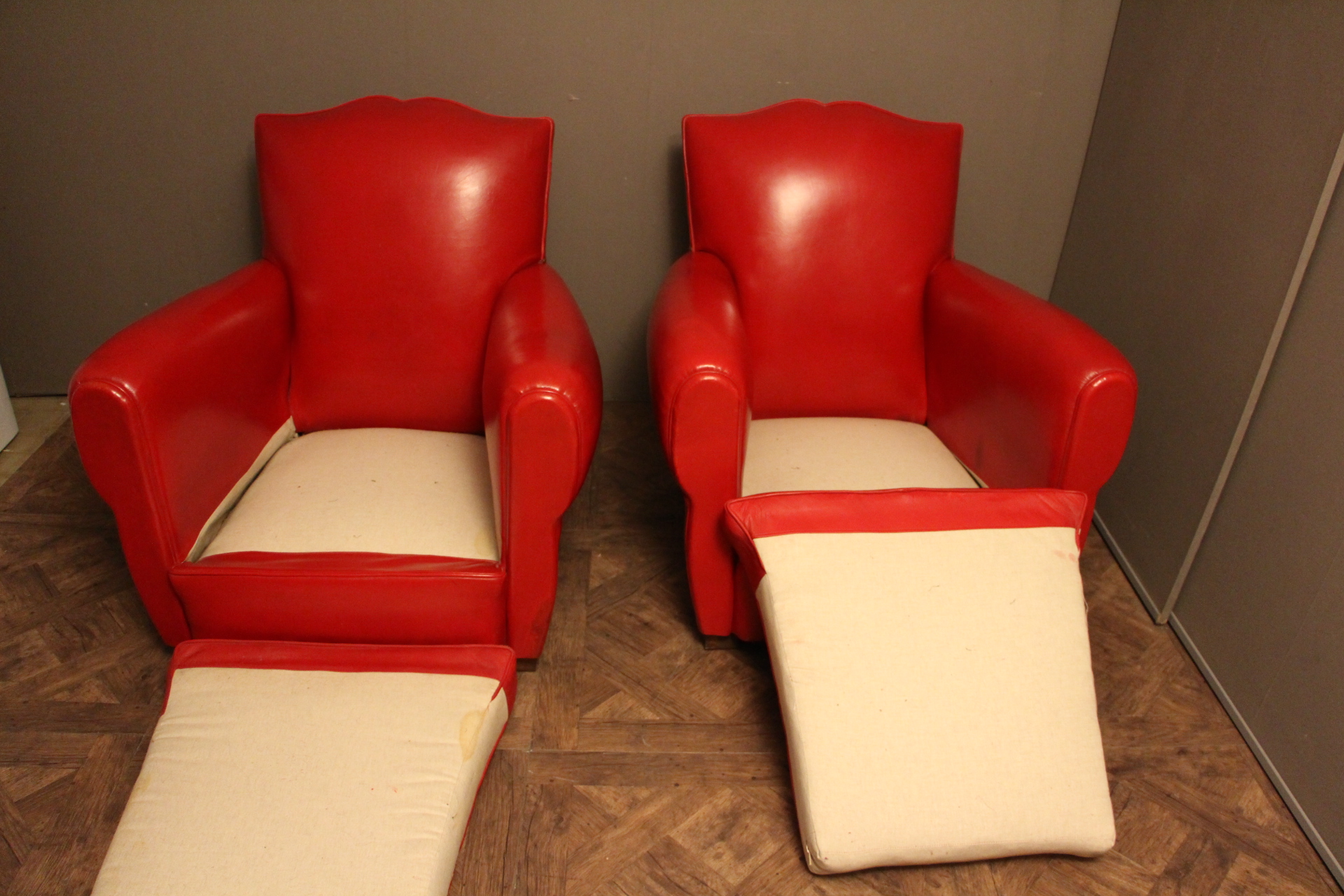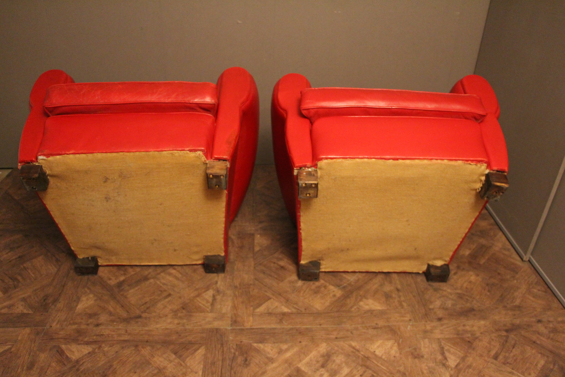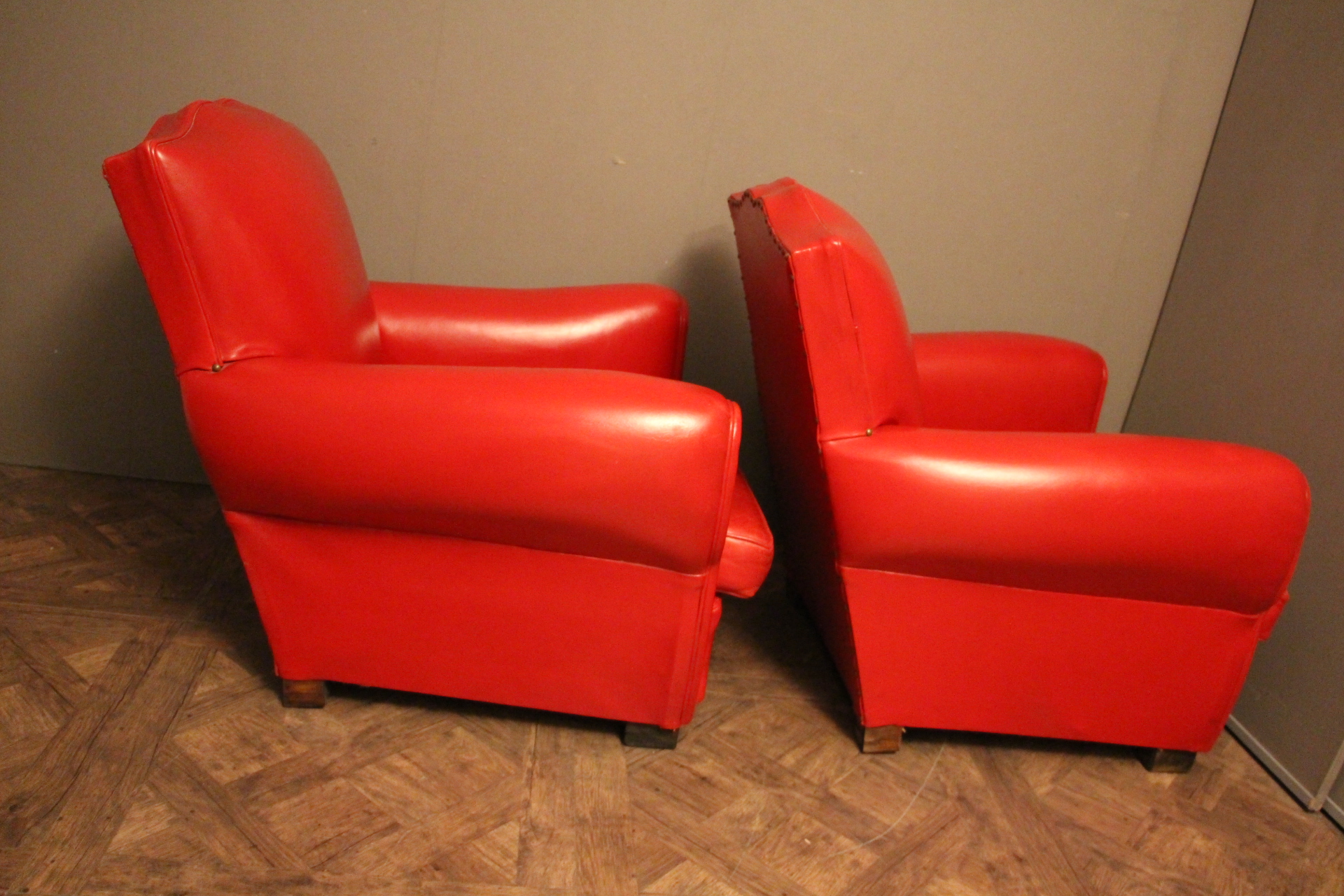 Paire d’anciens fauteuils club en cuir rouge, passe poil cuir blanc, à dossier de forme “moustache”, finition des contours du dos en clous laiton. Superbe patine et couleur inhabituelle. Ils sont très confortables et l’assise est ferme. Ils datent des années 1930 et sont dans leur état d’origine.