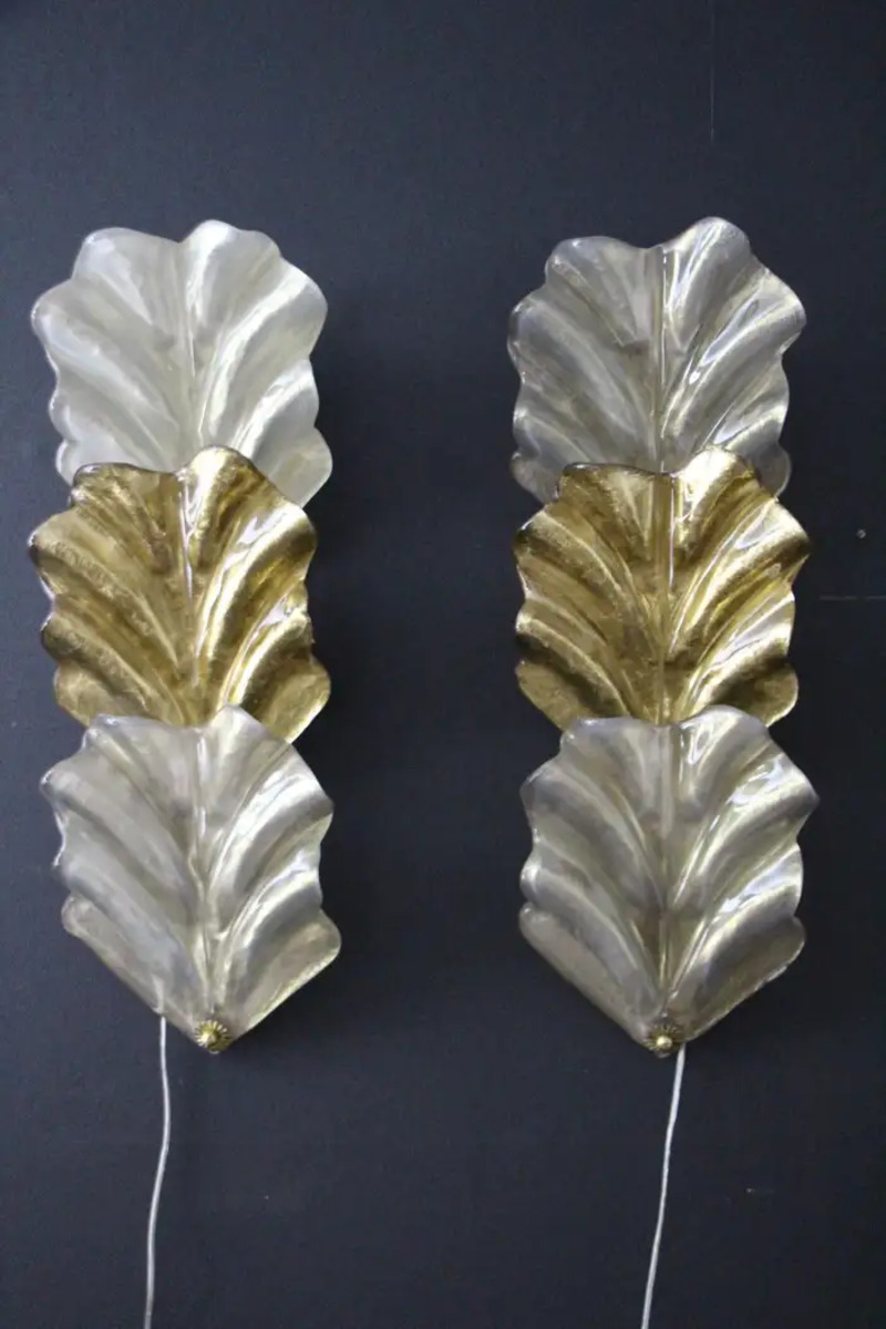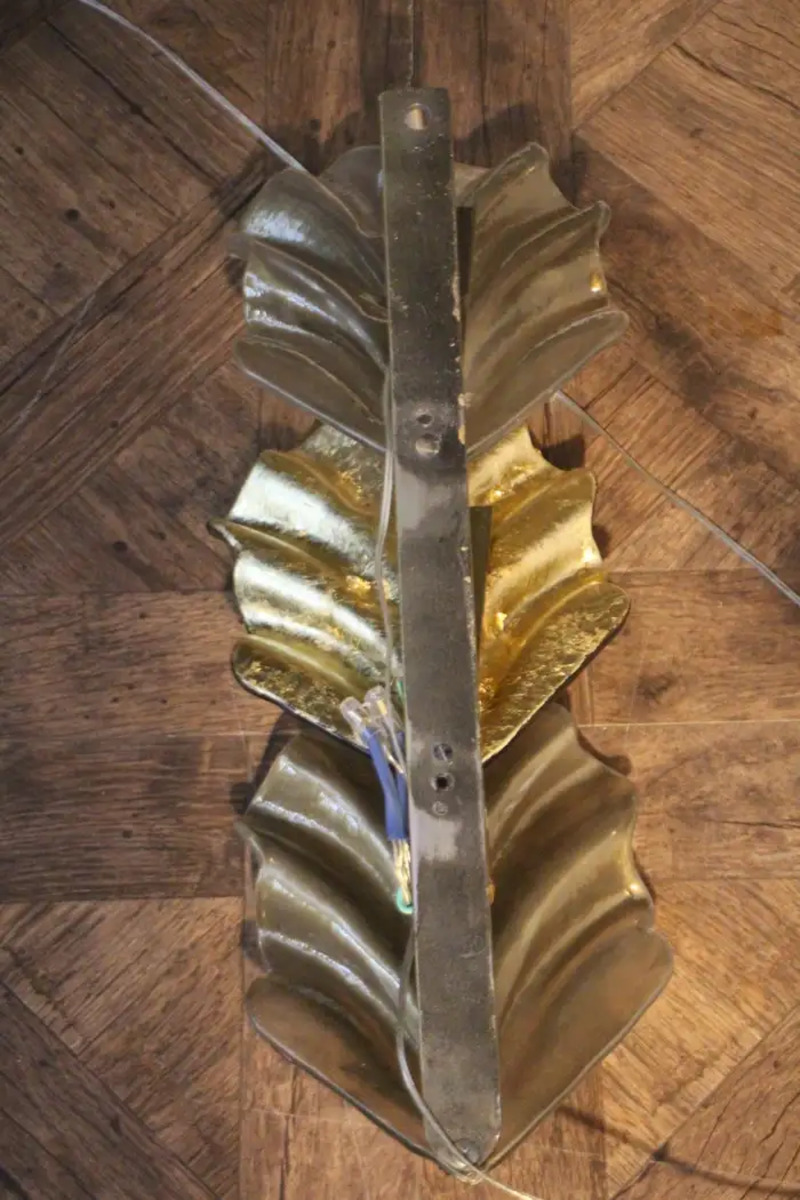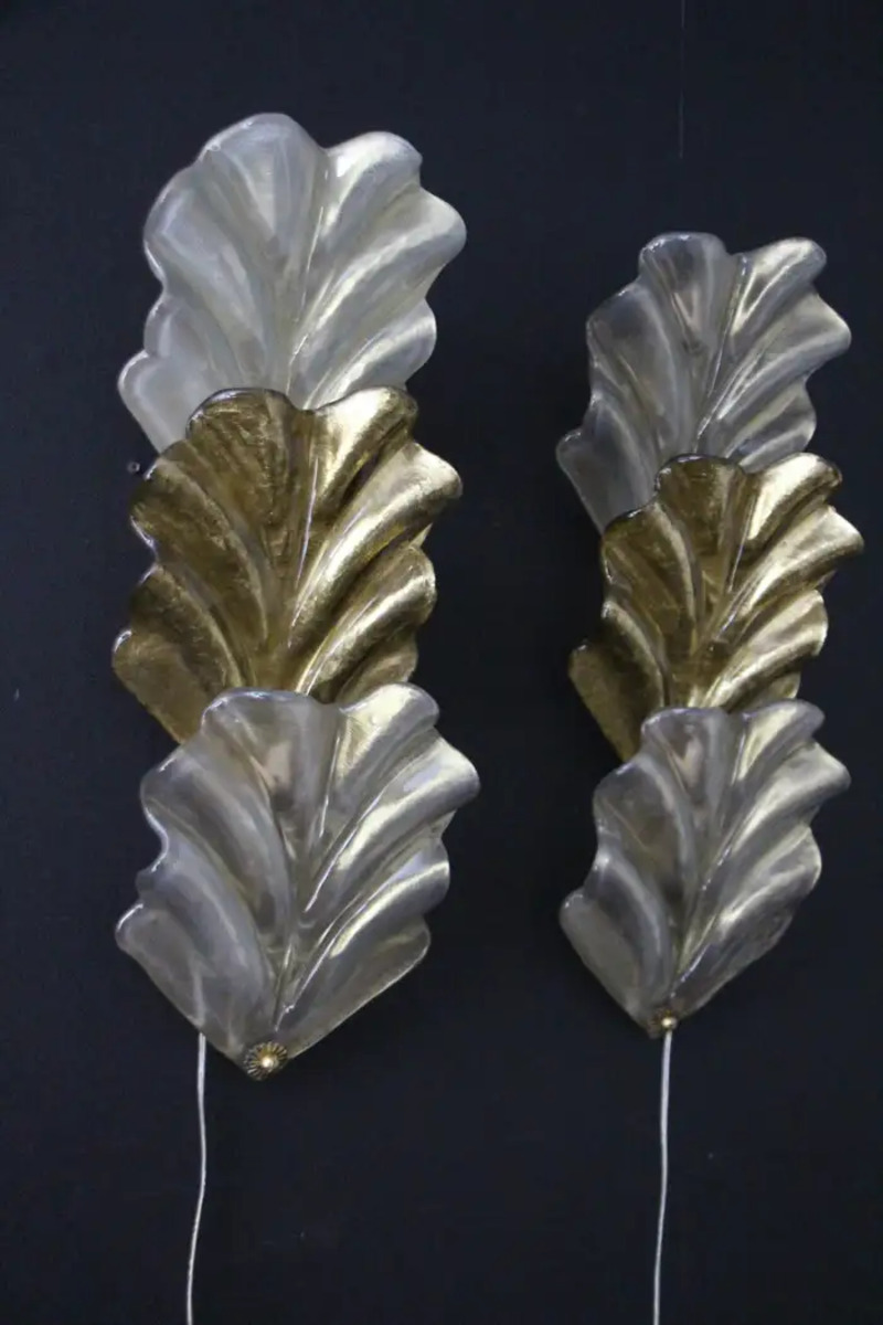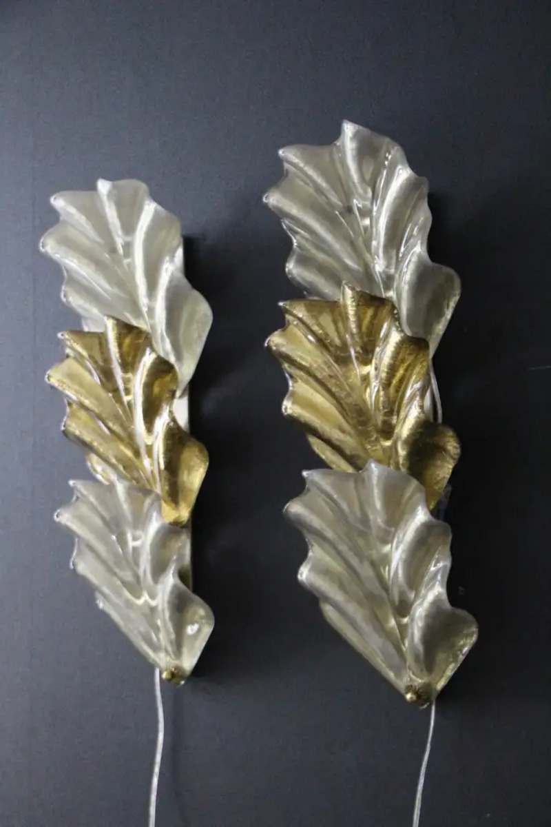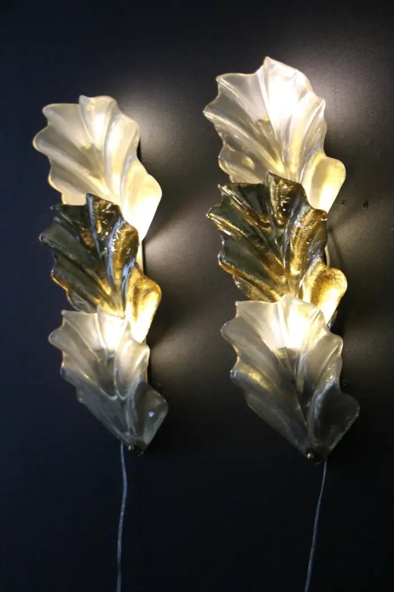 Ces magnifiques appliques en verre de Murano en forme de feuilles ont été entièrement réalisées à la main en Italie. Leur forme est remarquable, comme si elle étaient faites pour bouger, elle sont très vivantes. Le verre est très épais et a une belle forme de feuille large et plate.