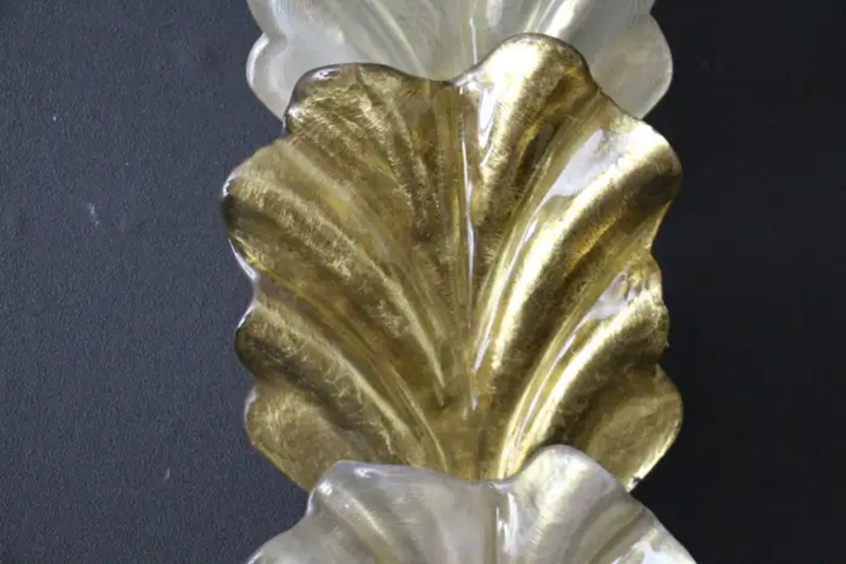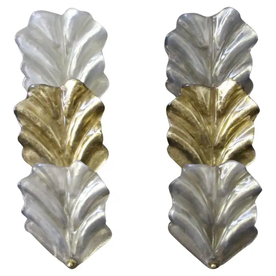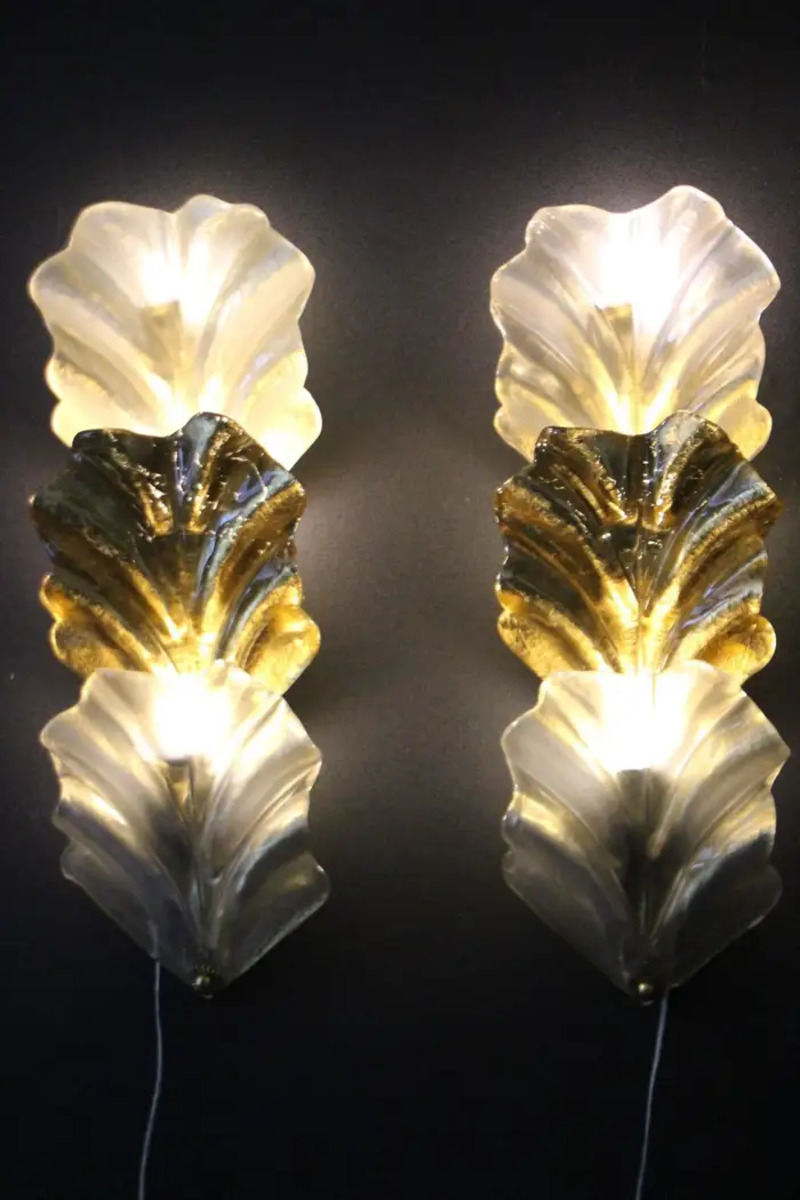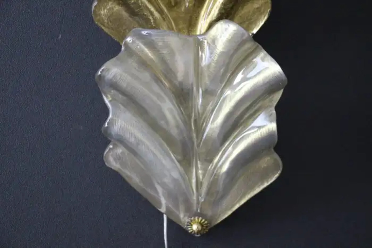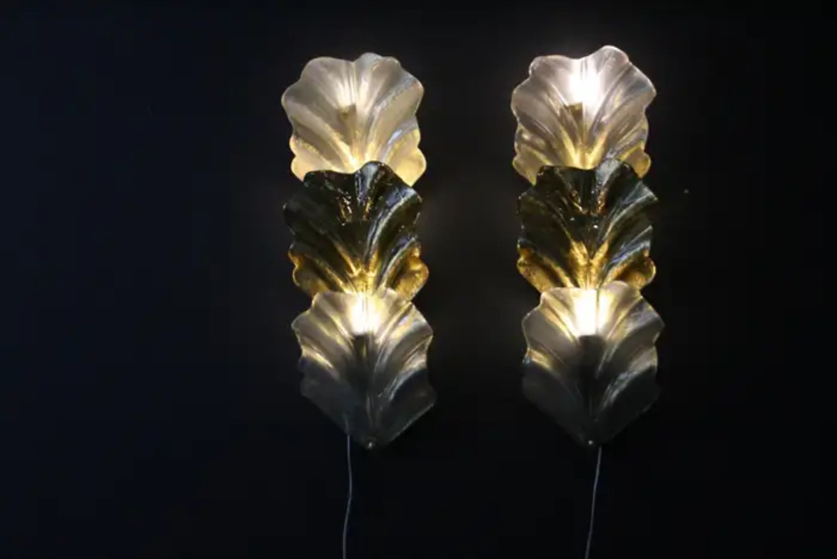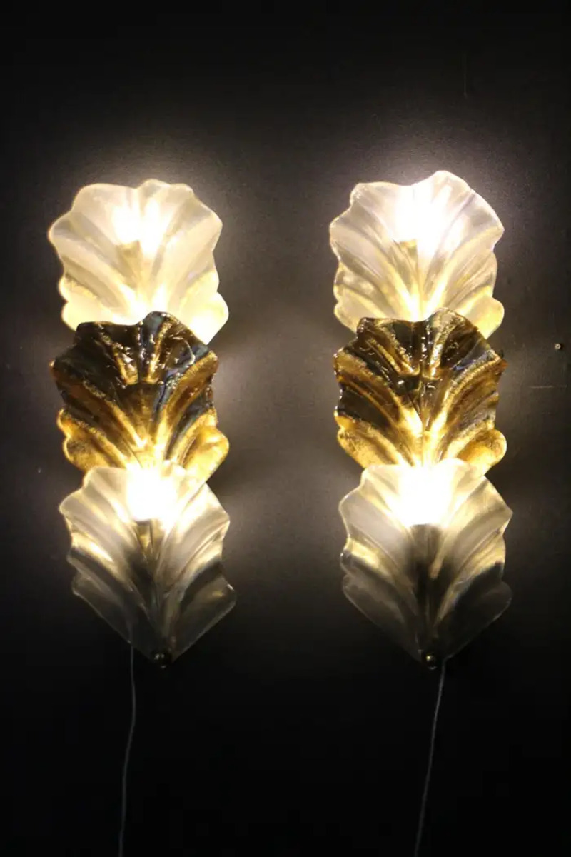 Ces magnifiques appliques en verre de Murano en forme de feuilles ont été entièrement réalisées à la main en Italie. Leur forme est remarquable, comme si elle étaient faites pour bouger, elle sont très vivantes. Le verre est très épais et a une belle forme de feuille large et plate.