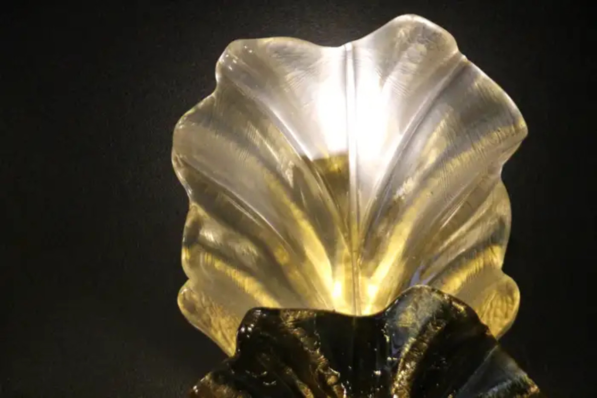 Chaque feuille de verre est très légèrement différente d’une à l’autre car elles ont été fabriquées à la main. De plus, le mariage entre son doré profond et son blanc nacré ajoute une touche végétale à leur élégance.