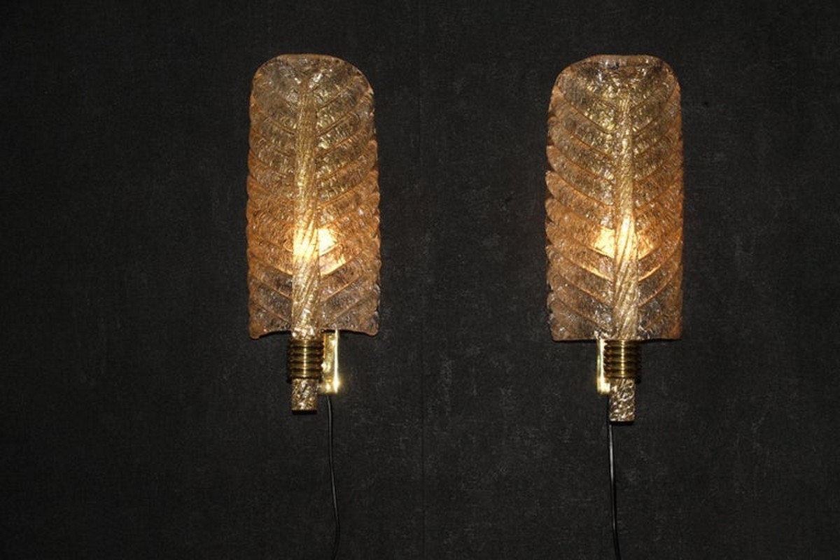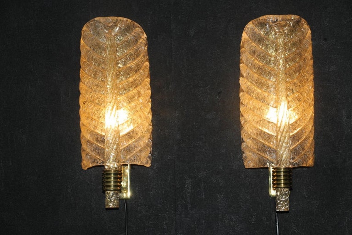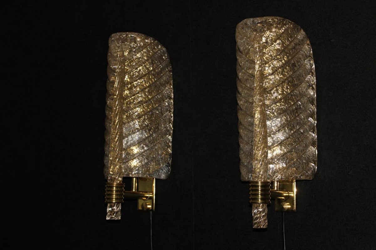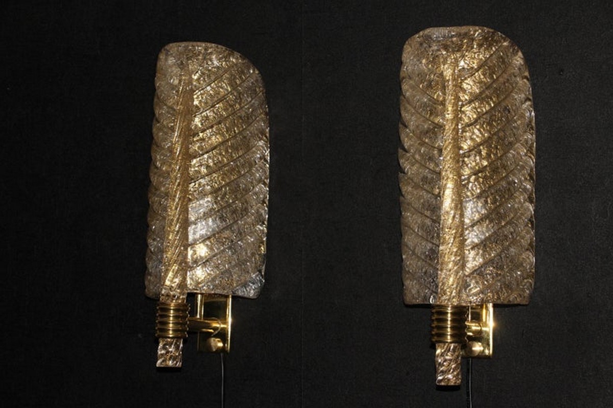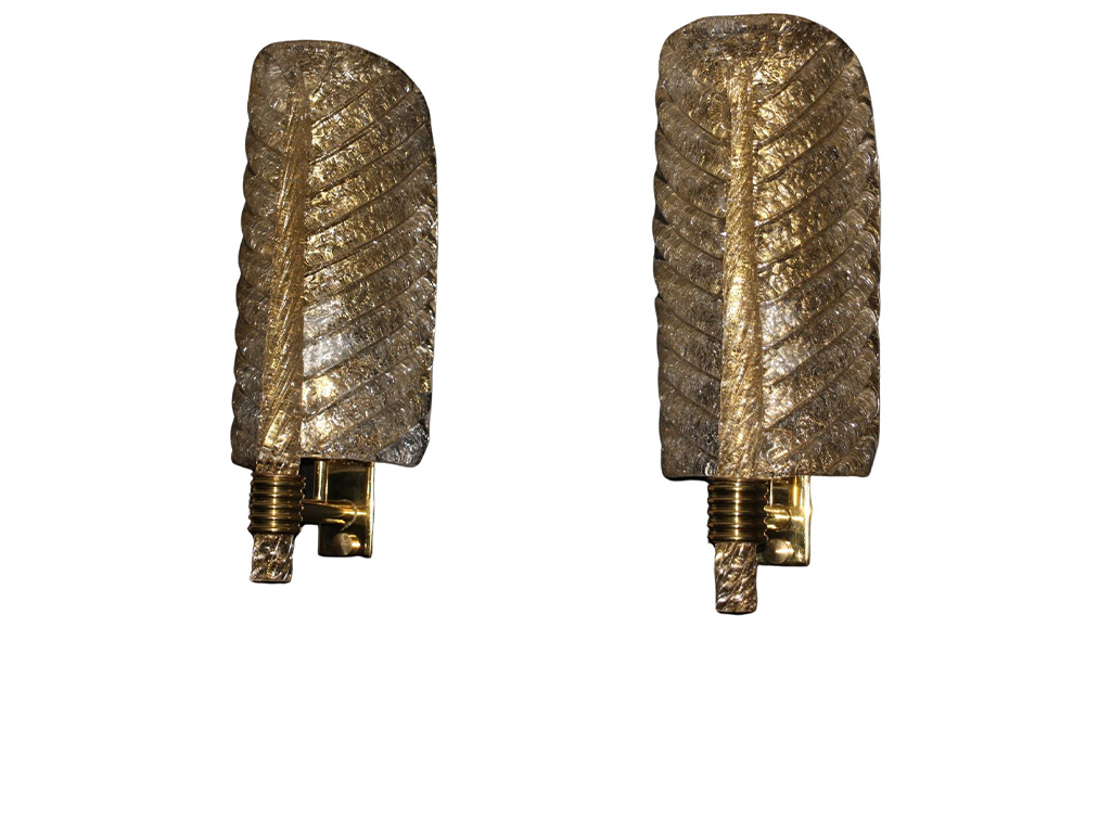 Cette très belle paire d’appliques de style Barovier en verre de Murano a été conçue et réalisée individuellement à Murano, dans un verre de couleur dorée très riche et profonde. Ces appliques présentent de belles formes de feuilles avec de nombreux détails, comme toutes les veines et surtout la verticale qui est toute torsadée du haut jusqu’au bas. Elles reposent sur une structure en laiton poli et texturé. Elles sont typiquement de style Barovier. 1 Ampoule par lumière est nécessaire. Cette paire d’appliques donne une lumière chaude et agréable et apporte une touche luxueuse dans tous les styles d’intérieurs. Elles sont câblés pour les États-Unis.
