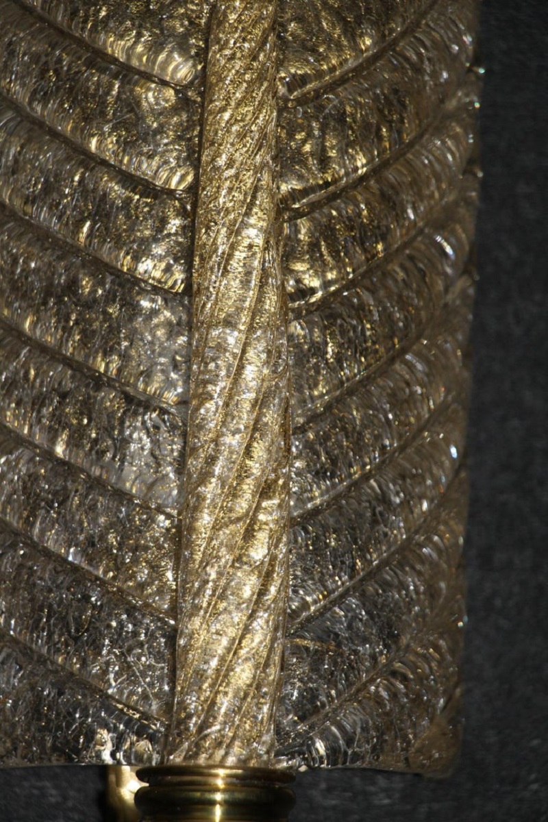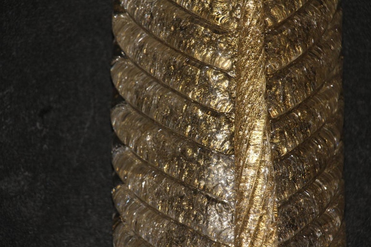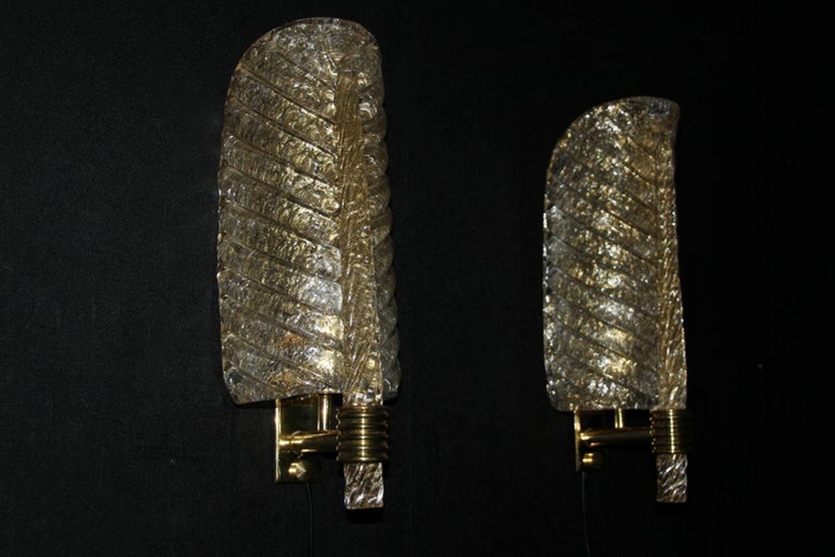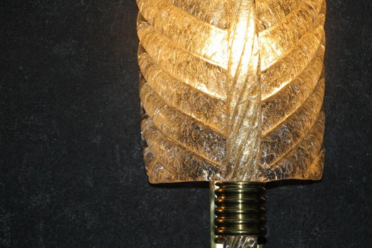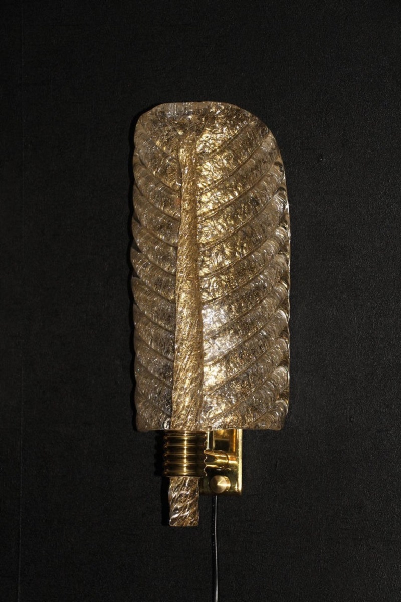 Cette très belle paire d’appliques de style Barovier en verre de Murano a été conçue et réalisée individuellement à Murano, dans un verre de couleur dorée très riche et profonde. Ces appliques présentent de belles formes de feuilles avec de nombreux détails, comme toutes les veines et surtout la verticale qui est toute torsadée du haut jusqu’au bas. Elles reposent sur une structure en laiton poli et texturé. Elles sont typiquement de style Barovier. 1 Ampoule par lumière est nécessaire. Cette paire d’appliques donne une lumière chaude et agréable et apporte une touche luxueuse dans tous les styles d’intérieurs. Elles sont câblés pour les États-Unis.