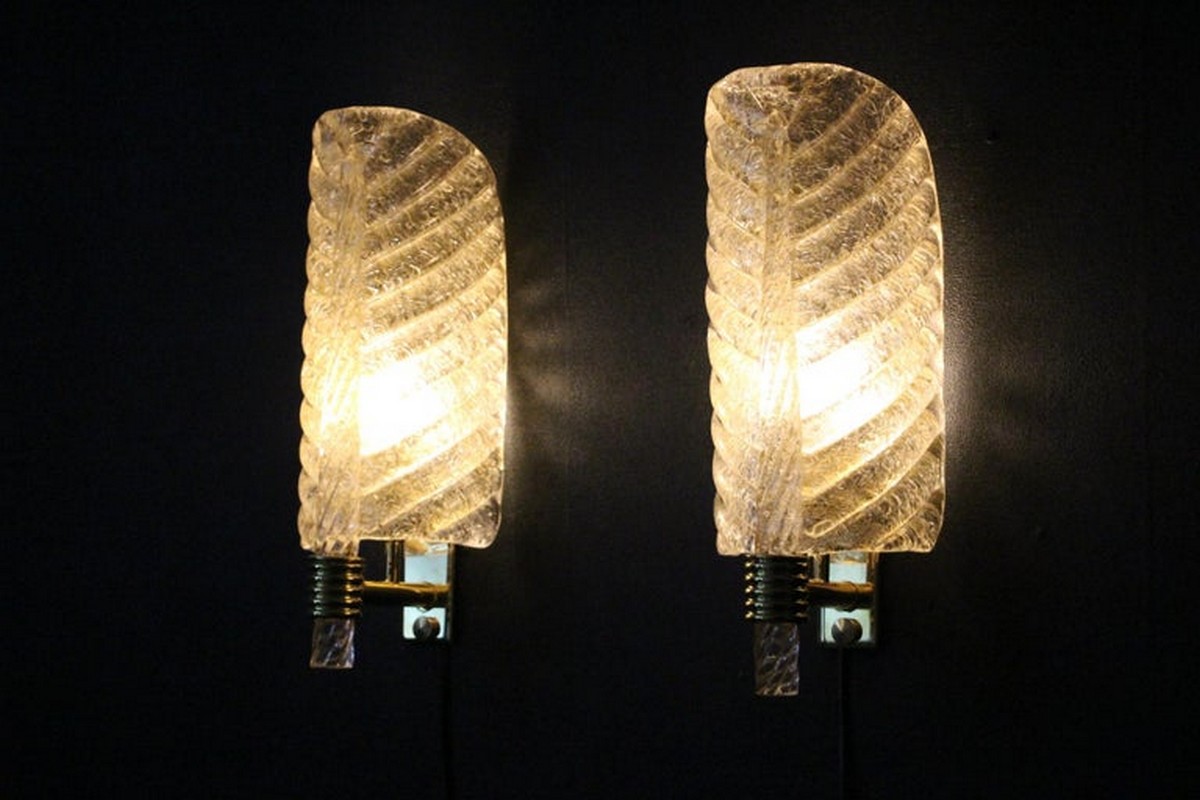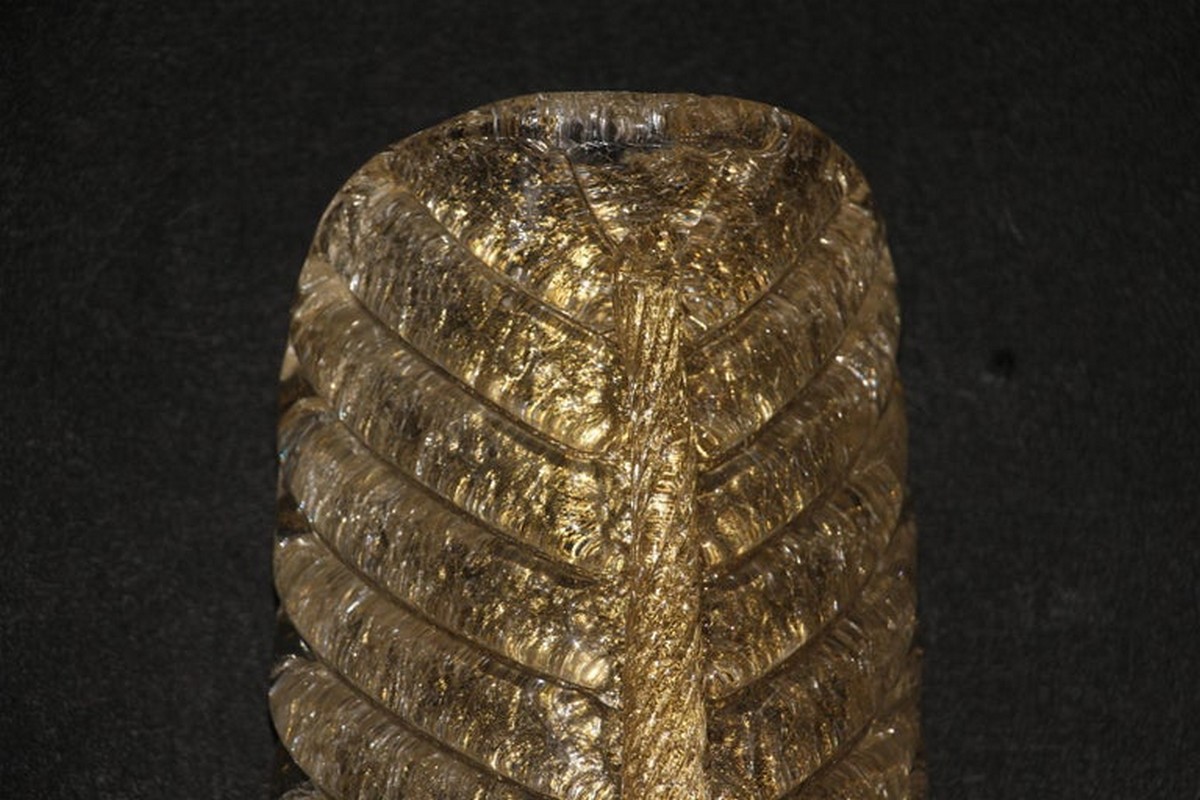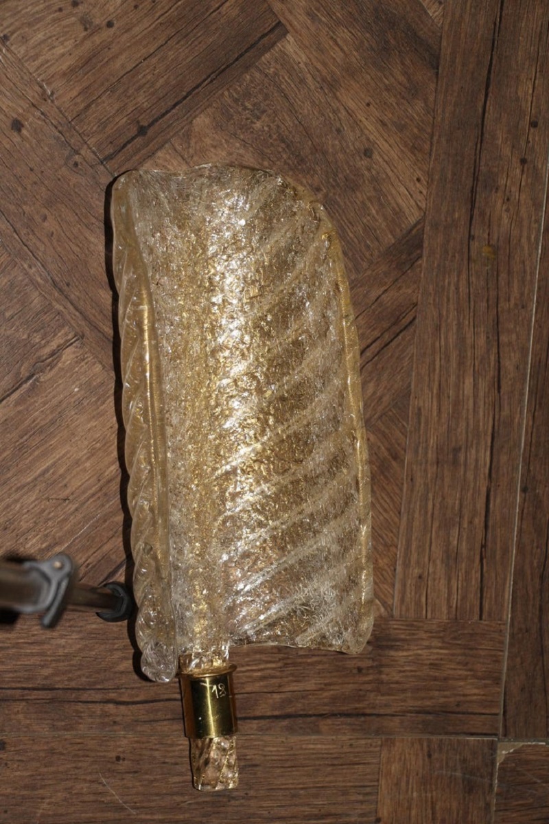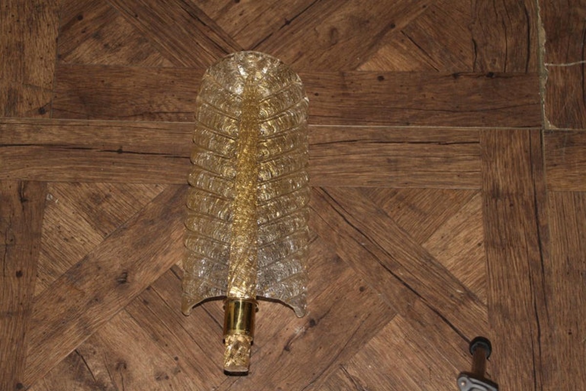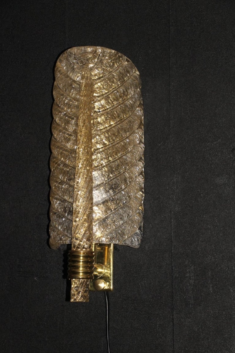 Cette très belle paire d’appliques de style Barovier en verre de Murano a été conçue et réalisée individuellement à Murano, dans un verre de couleur dorée très riche et profonde. Ces appliques présentent de belles formes de feuilles avec de nombreux détails, comme toutes les veines et surtout la verticale qui est toute torsadée du haut jusqu’au bas. Elles reposent sur une structure en laiton poli et texturé. Elles sont typiquement de style Barovier. 1 Ampoule par lumière est nécessaire. Cette paire d’appliques donne une lumière chaude et agréable et apporte une touche luxueuse dans tous les styles d’intérieurs. Elles sont câblés pour les États-Unis.