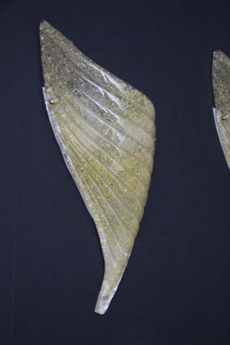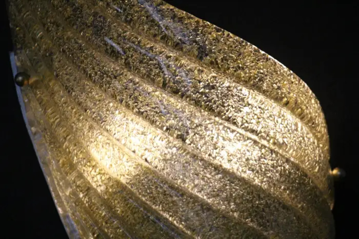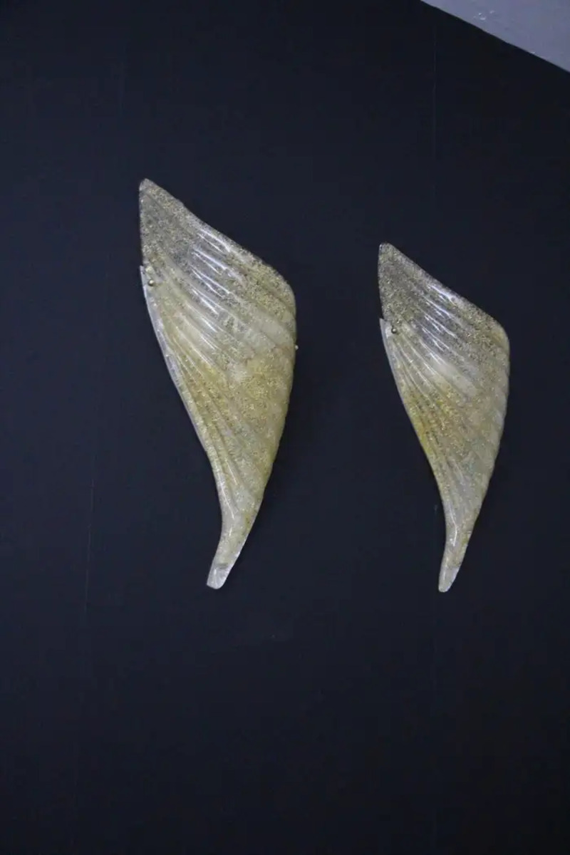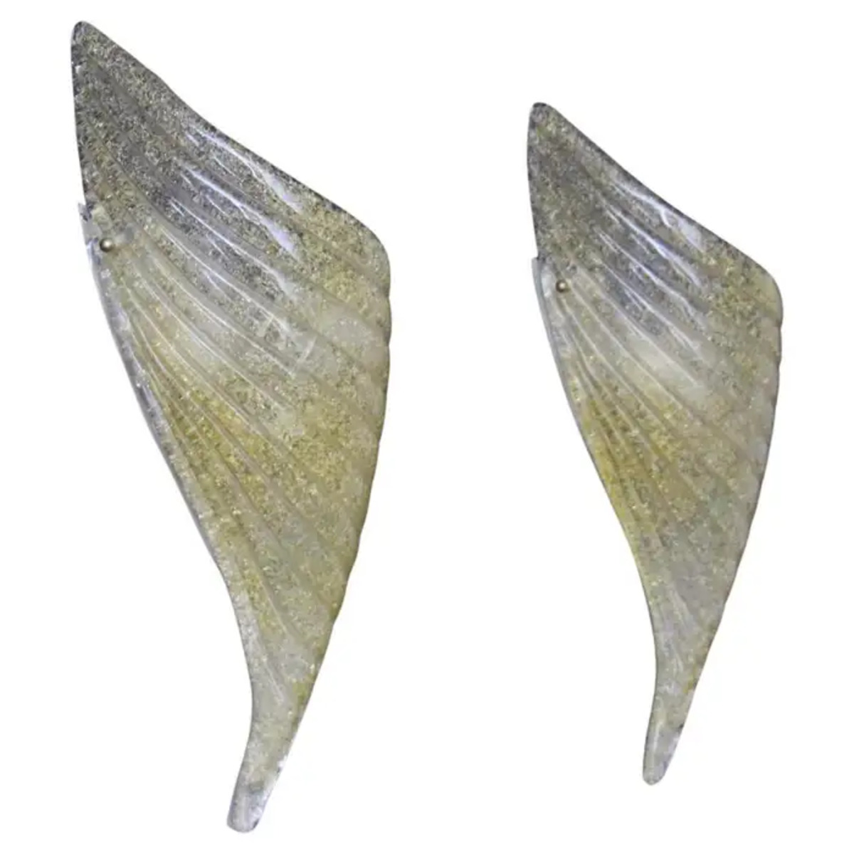 Cette paire d’appliques en verre de Murano est très poétique car leur design pourrait suggérer des formes d’ailes. Son verre soufflé à la main avec des motifs horizontaux texturés et nervurés et un effet granuleux utilisant la technique Graniglia et des inclusions de paillettes d’or fournit une lumière très agréable.