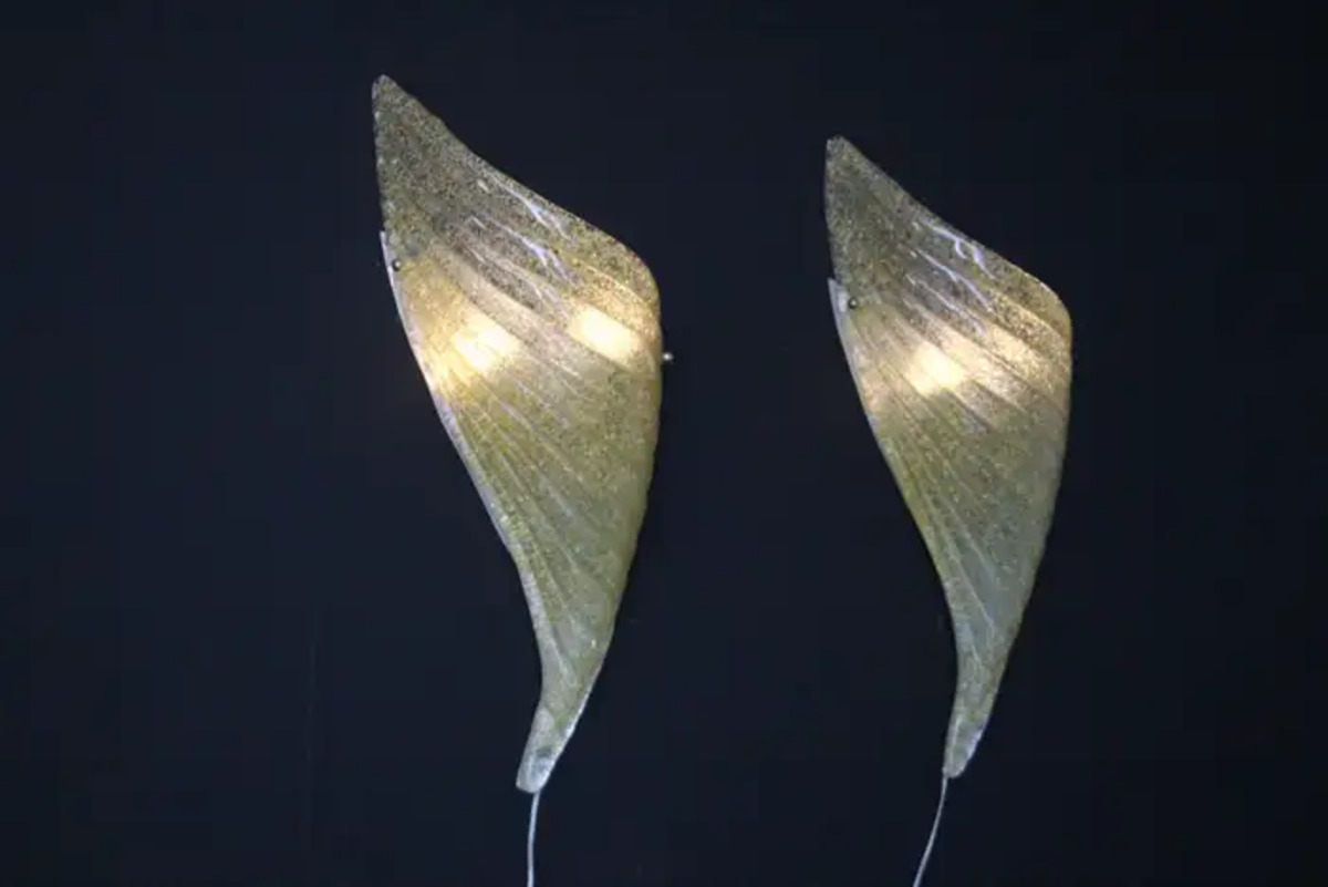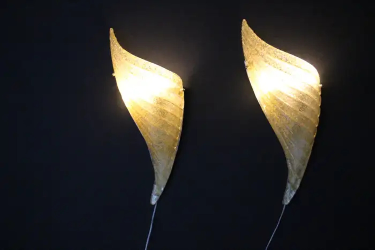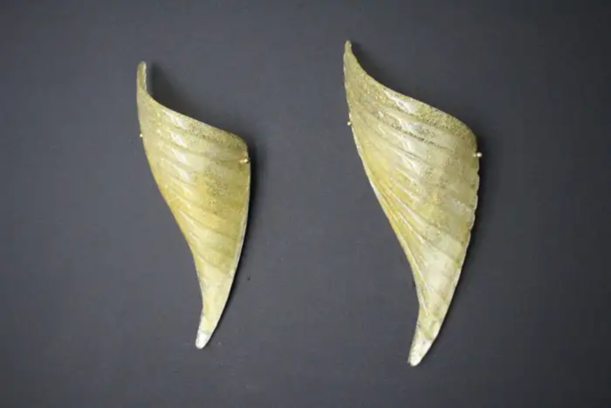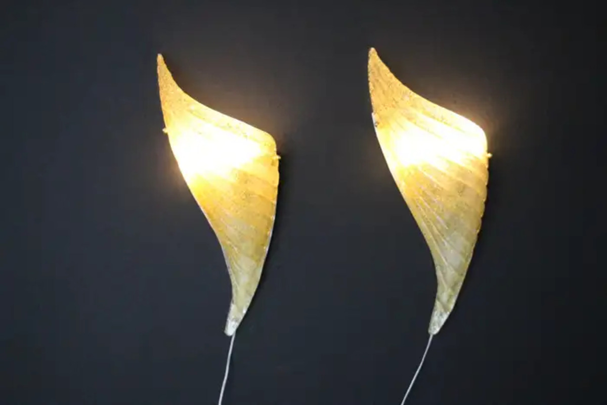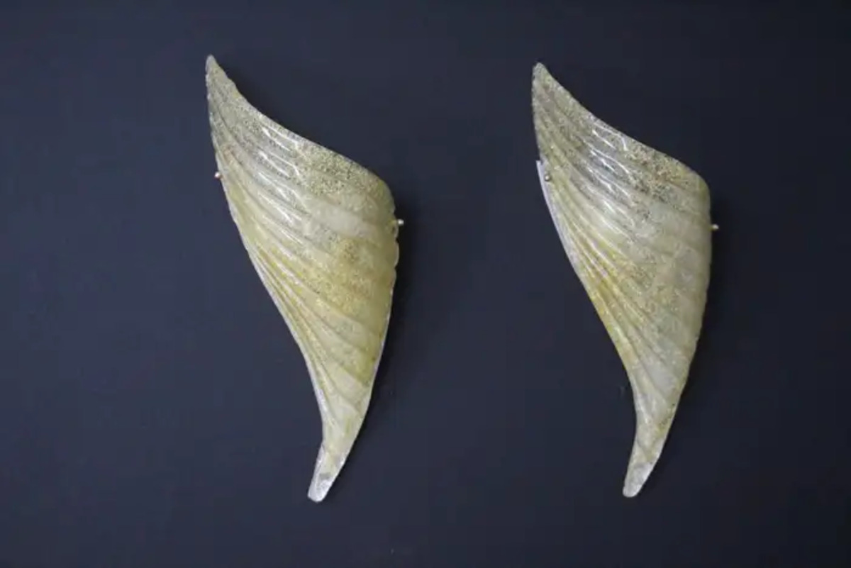 Cette paire d’appliques en verre de Murano est très poétique car leur design pourrait suggérer des formes d’ailes. Son verre soufflé à la main avec des motifs horizontaux texturés et nervurés et un effet granuleux utilisant la technique Graniglia et des inclusions de paillettes d’or fournit une lumière très agréable.