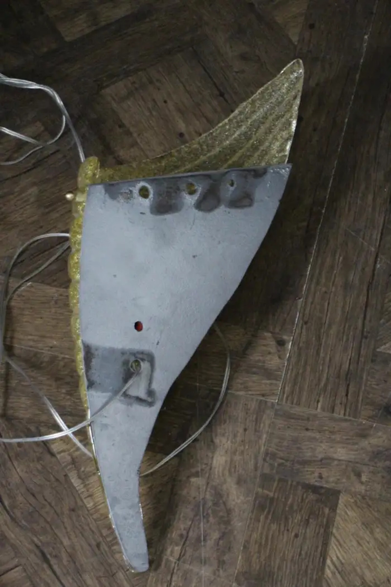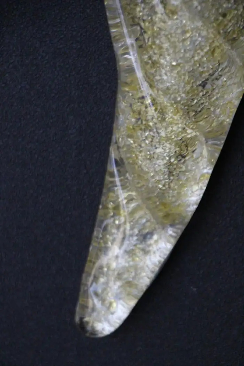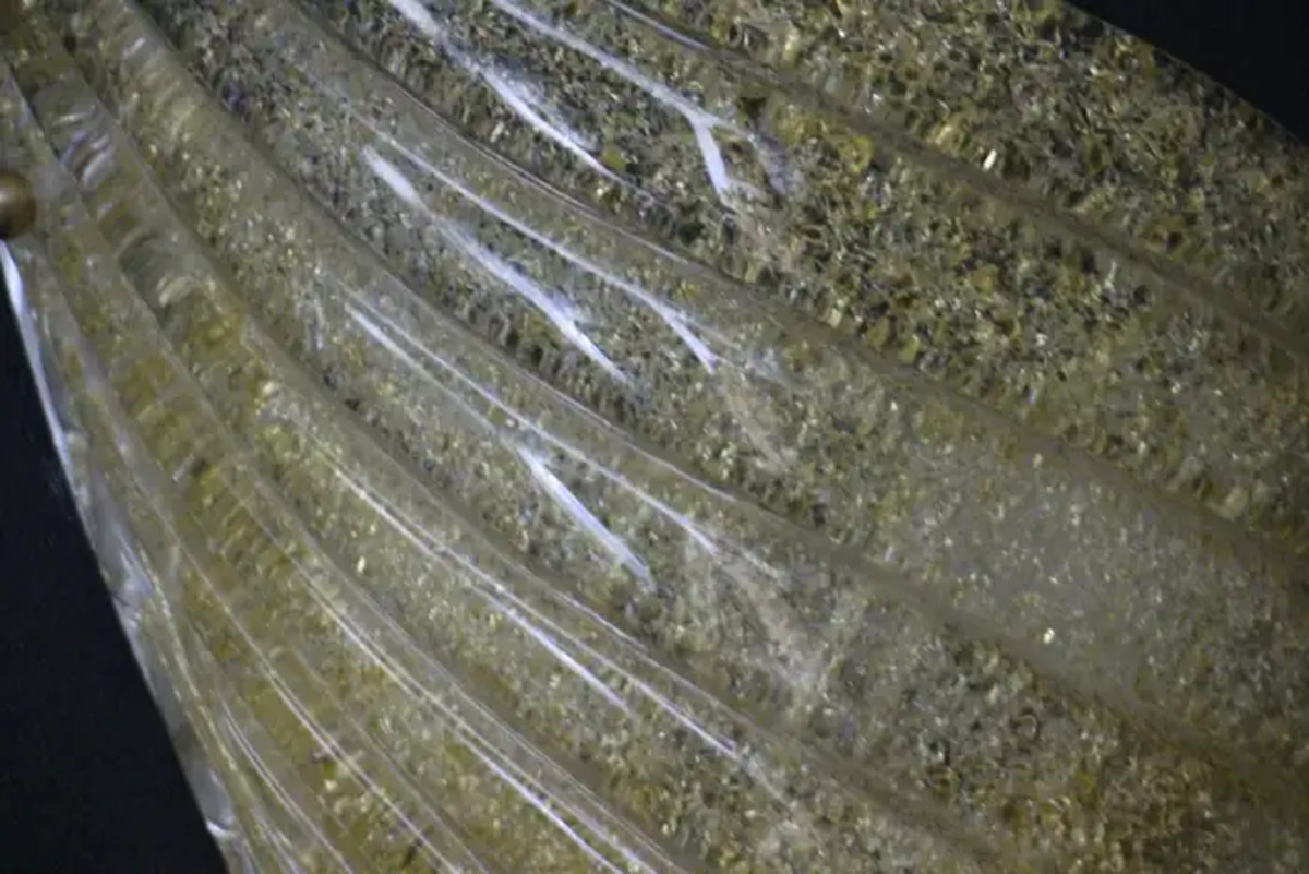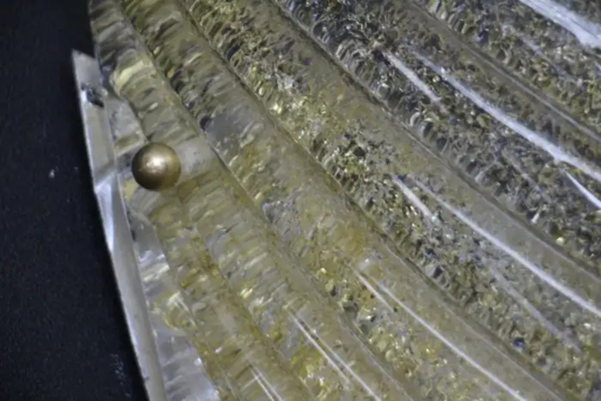 Cette paire d’appliques en verre de Murano est très poétique car leur design pourrait suggérer des formes d’ailes. Son verre soufflé à la main avec des motifs horizontaux texturés et nervurés et un effet granuleux utilisant la technique Graniglia et des inclusions de paillettes d’or fournit une lumière très agréable.