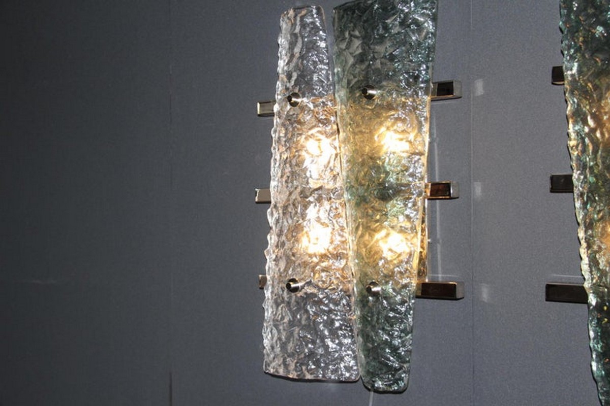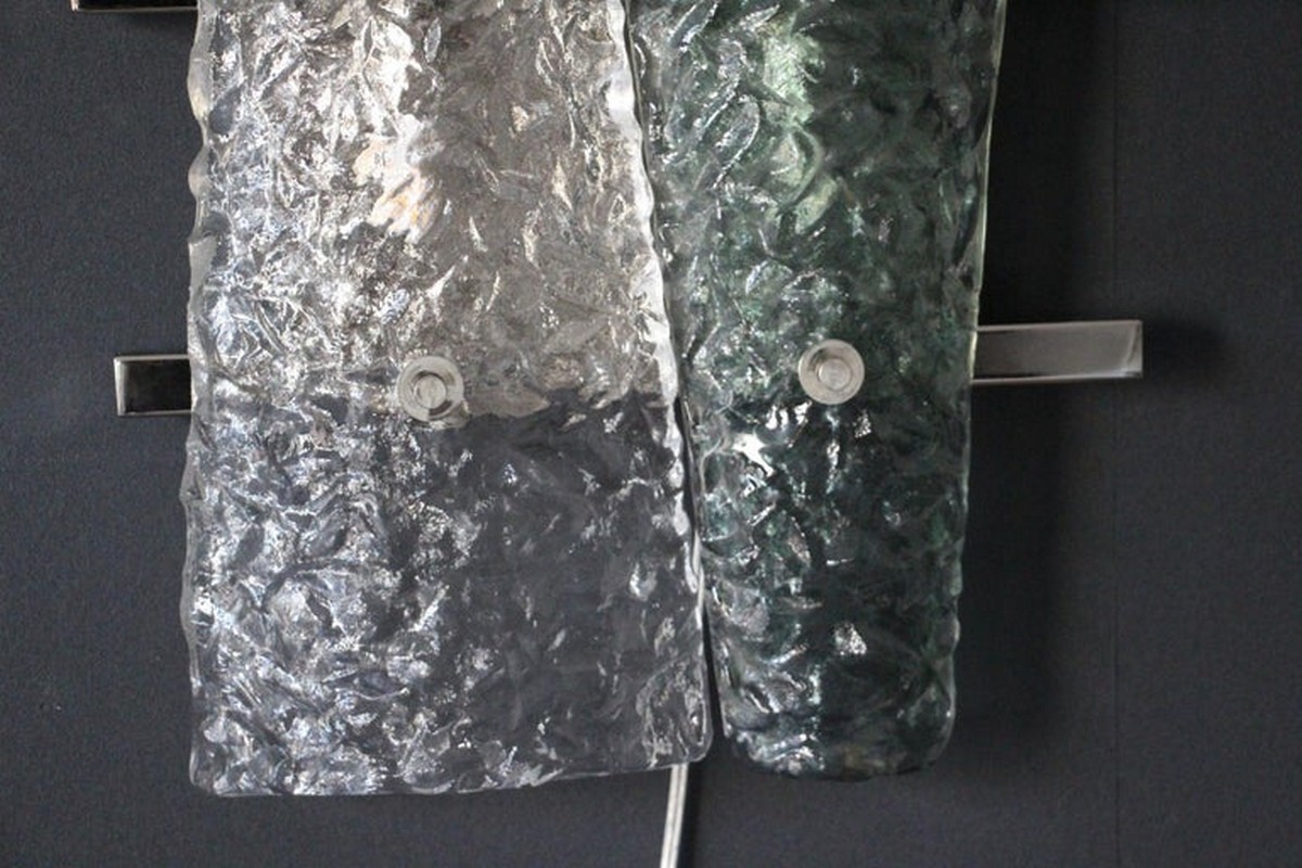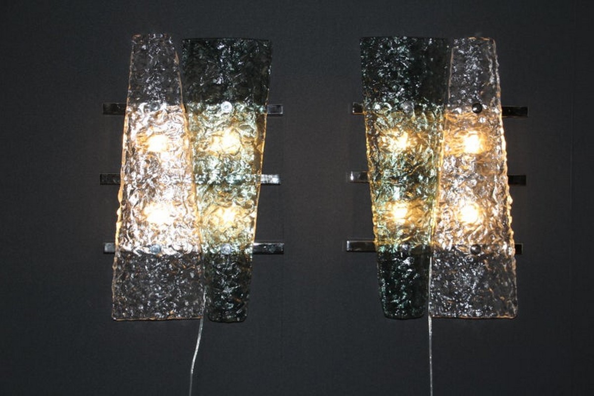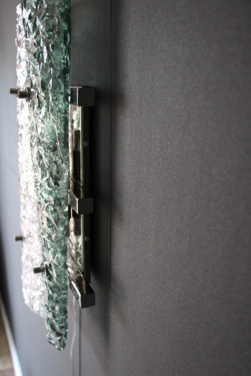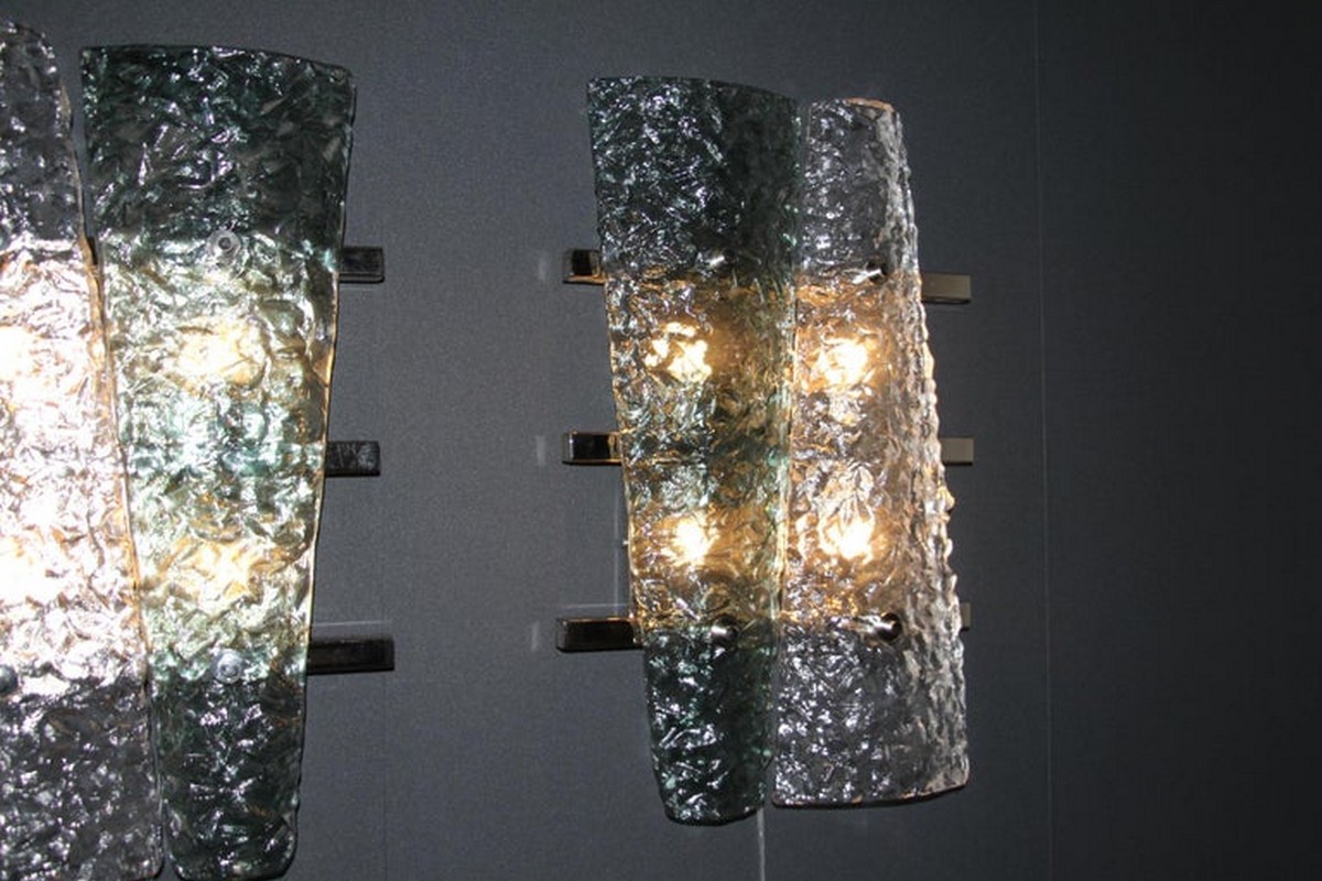 Cette spectaculaire paire d’appliques en verre de Murano vert a été réalisée individuellement par un artisan de Murano. Les pièces de verre sont texturées et ressemblent à du papier froissé, la couleur verte est vraiment profonde et agréable. Elles sont fixées sur une plaque carrée en nickel et une série de 3 supports horizontaux en nickel. Chaque applique a besoin de 4 ampoules . Ces appliques peuvent s’adapter aux intérieurs modernes, mid-century, art déco ou tout autre intérieur élégant. Lorsque la lumière est allumée, elle produit des faisceaux de lumière chaleureuse sur le mur et fournit également une lumière très agréable. Veuillez noter qu’elles sont câblées. Le fil électrique que vous pouvez voir sur les photos est pour la démonstration seulement pour montrer qu’elles sont en état de fonctionnement.