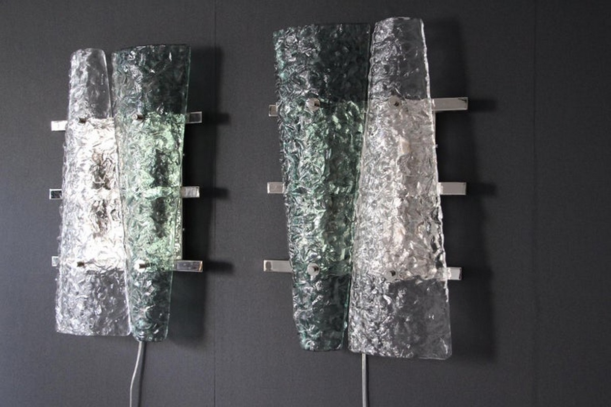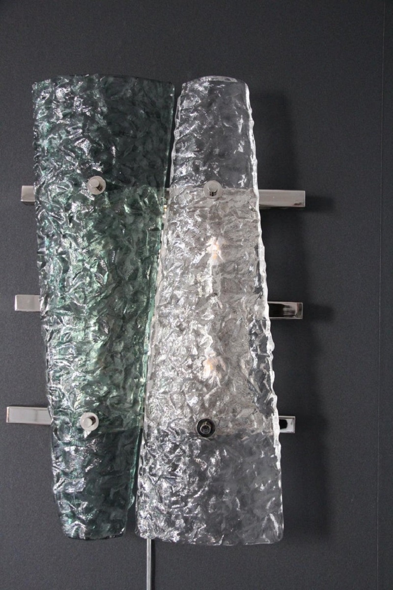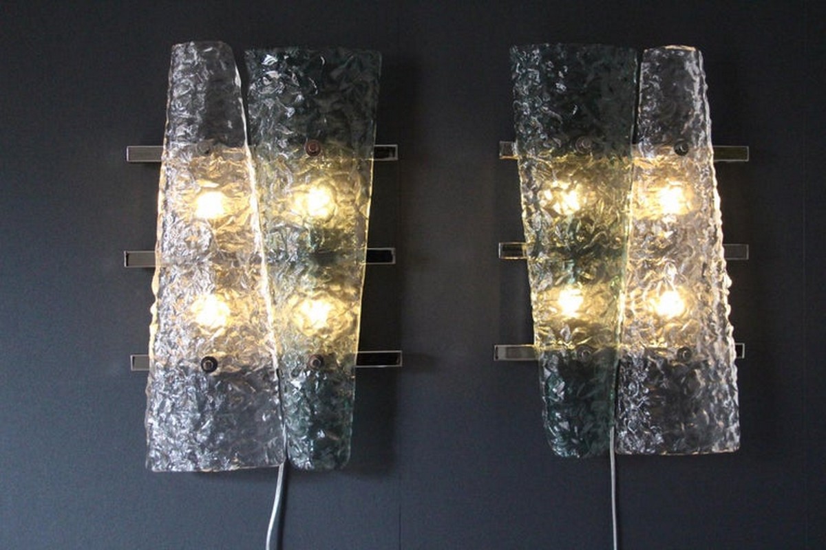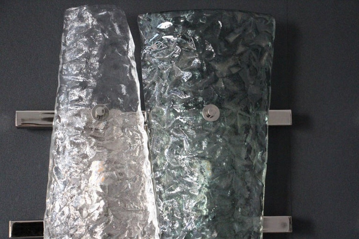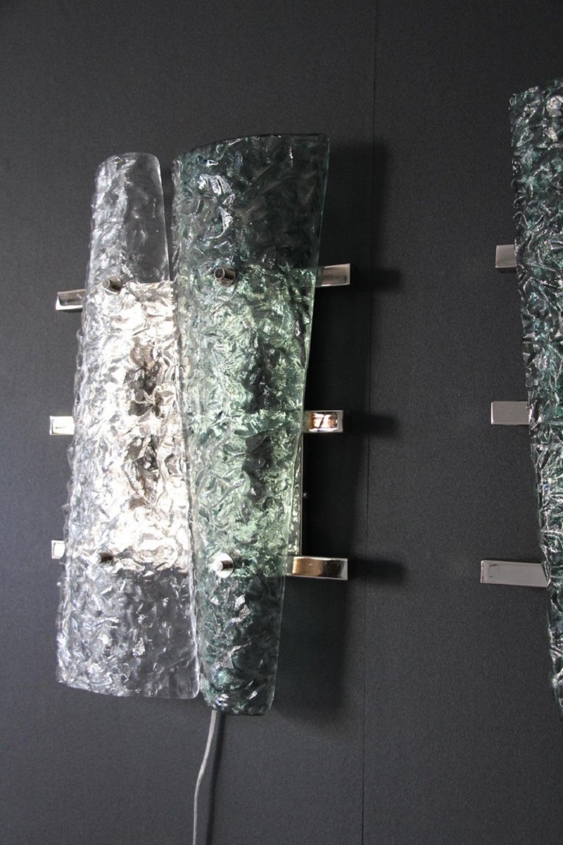 Cette spectaculaire paire d’appliques en verre de Murano vert a été réalisée individuellement par un artisan de Murano. Les pièces de verre sont texturées et ressemblent à du papier froissé, la couleur verte est vraiment profonde et agréable. Elles sont fixées sur une plaque carrée en nickel et une série de 3 supports horizontaux en nickel. Chaque applique a besoin de 4 ampoules . Ces appliques peuvent s’adapter aux intérieurs modernes, mid-century, art déco ou tout autre intérieur élégant. Lorsque la lumière est allumée, elle produit des faisceaux de lumière chaleureuse sur le mur et fournit également une lumière très agréable. Veuillez noter qu’elles sont câblées. Le fil électrique que vous pouvez voir sur les photos est pour la démonstration seulement pour montrer qu’elles sont en état de fonctionnement.