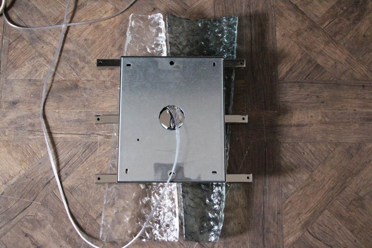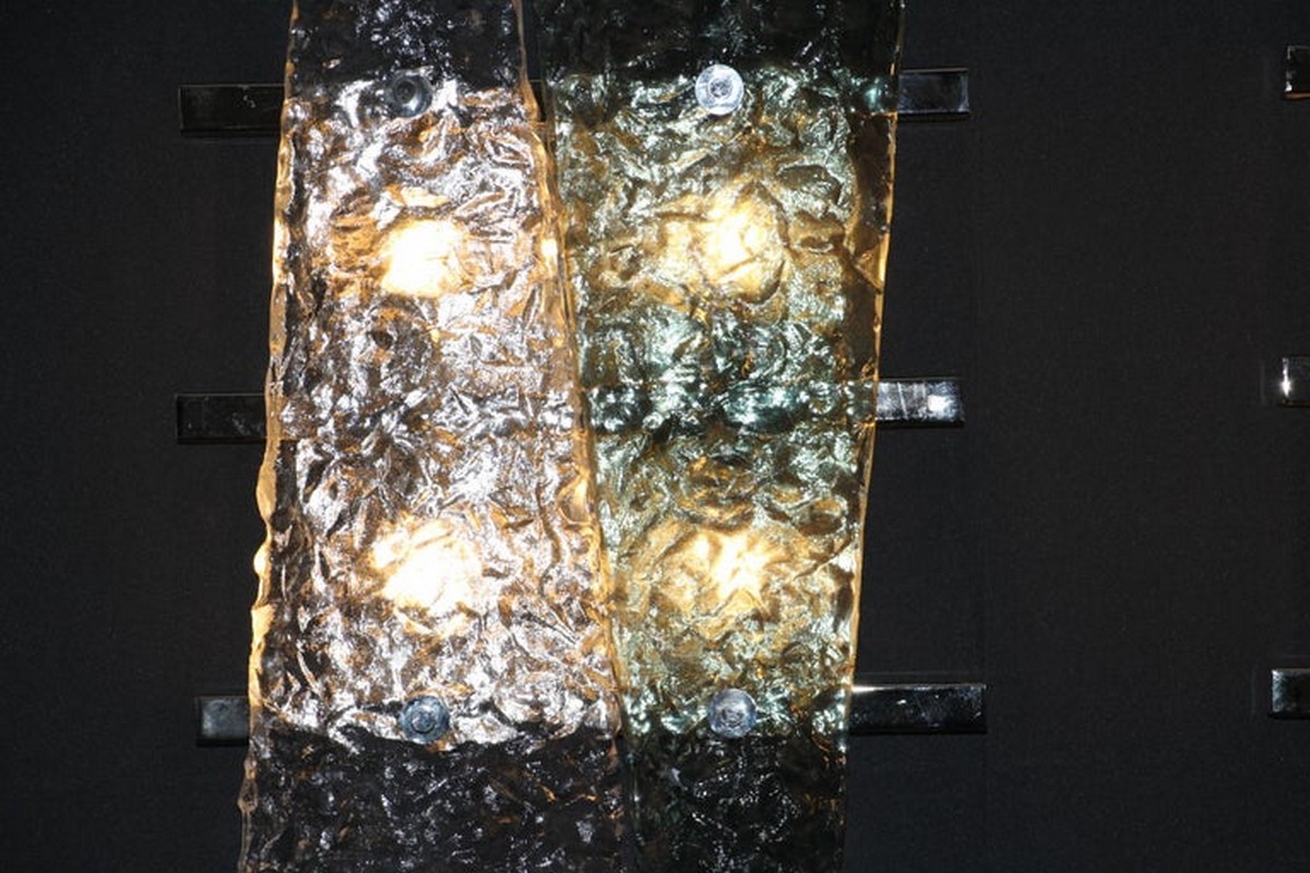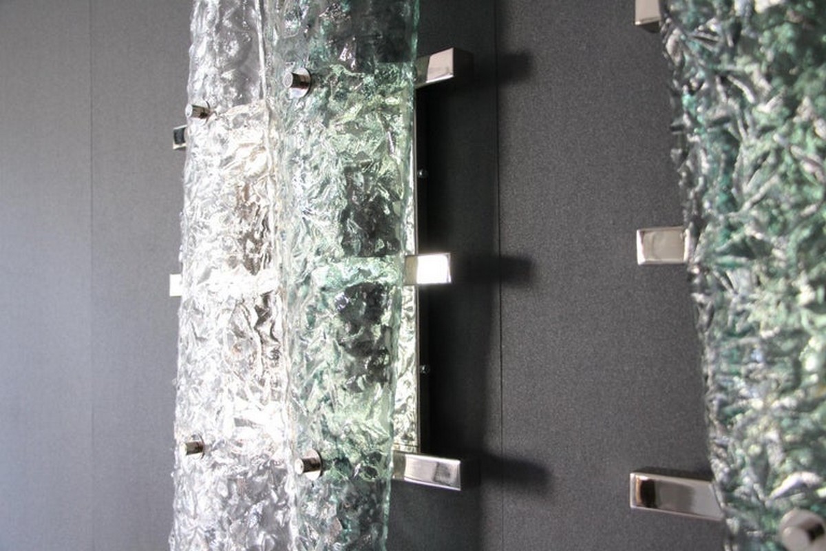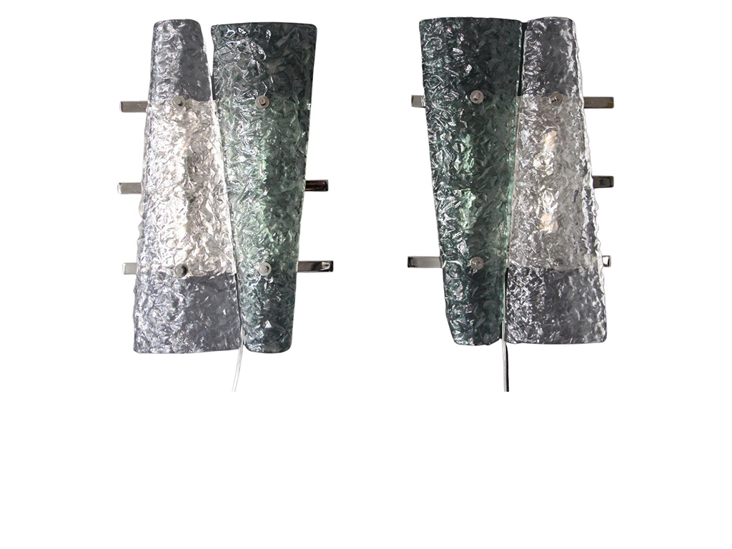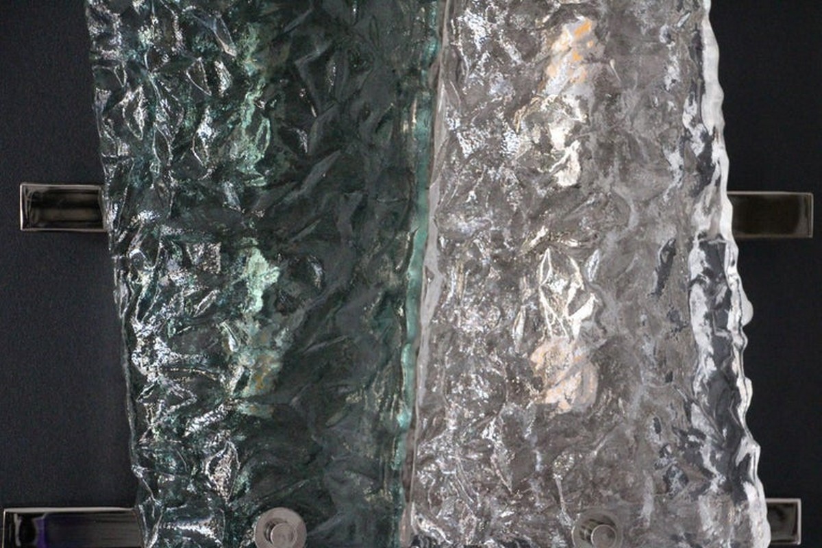 Cette spectaculaire paire d’appliques en verre de Murano vert a été réalisée individuellement par un artisan de Murano. Les pièces de verre sont texturées et ressemblent à du papier froissé, la couleur verte est vraiment profonde et agréable. Elles sont fixées sur une plaque carrée en nickel et une série de 3 supports horizontaux en nickel. Chaque applique a besoin de 4 ampoules . Ces appliques peuvent s’adapter aux intérieurs modernes, mid-century, art déco ou tout autre intérieur élégant. Lorsque la lumière est allumée, elle produit des faisceaux de lumière chaleureuse sur le mur et fournit également une lumière très agréable. Veuillez noter qu’elles sont câblées. Le fil électrique que vous pouvez voir sur les photos est pour la démonstration seulement pour montrer qu’elles sont en état de fonctionnement.