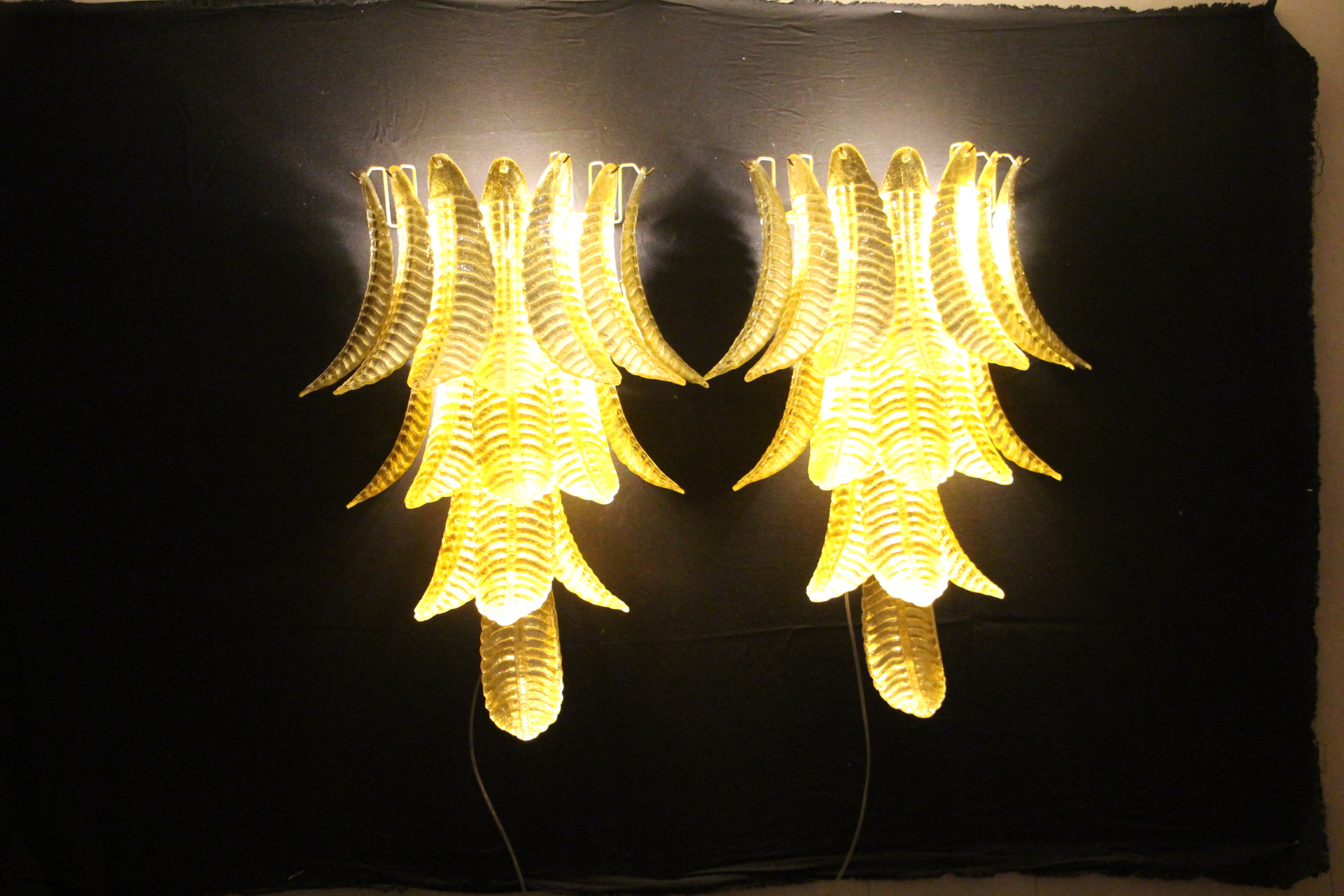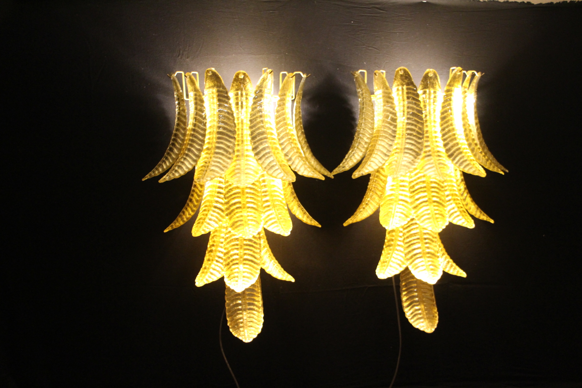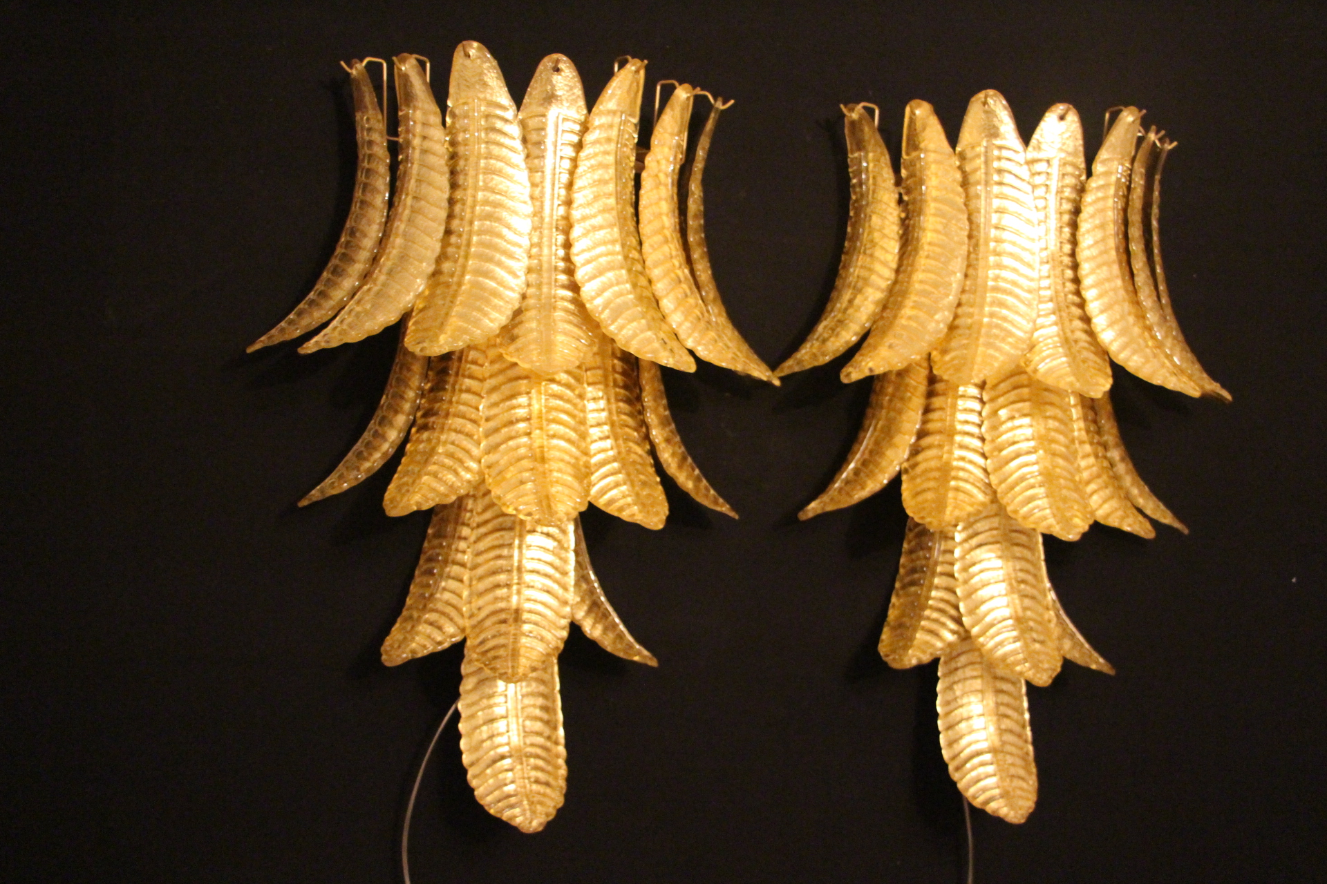 Cette spectaculaire paire d’appliques longues a été entièrement fabriquée à la main à Murano. Chaque feuille a été individuellement fabriquée en verre soufflé de haute qualité, c’est pourquoi nous pouvons remarquer une très légère différence d’une pièce à l’autre. Sa couleur or a été réalisée grâce à la technique de la feuille d’or 24 carats. C’est un verre d’art de qualité supérieure et un éclairage très décoratif. En effet, cette paire d’appliques longues murales constituent des pièce de décoration, rayonnantes de beauté éteintes ou éclairées . De plus, elles peuvent être utilisées dans toutes les pièces. Leur lumière est chaleureuse et très agréable. 4 ampoules par applique sont nécessaires.