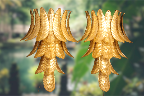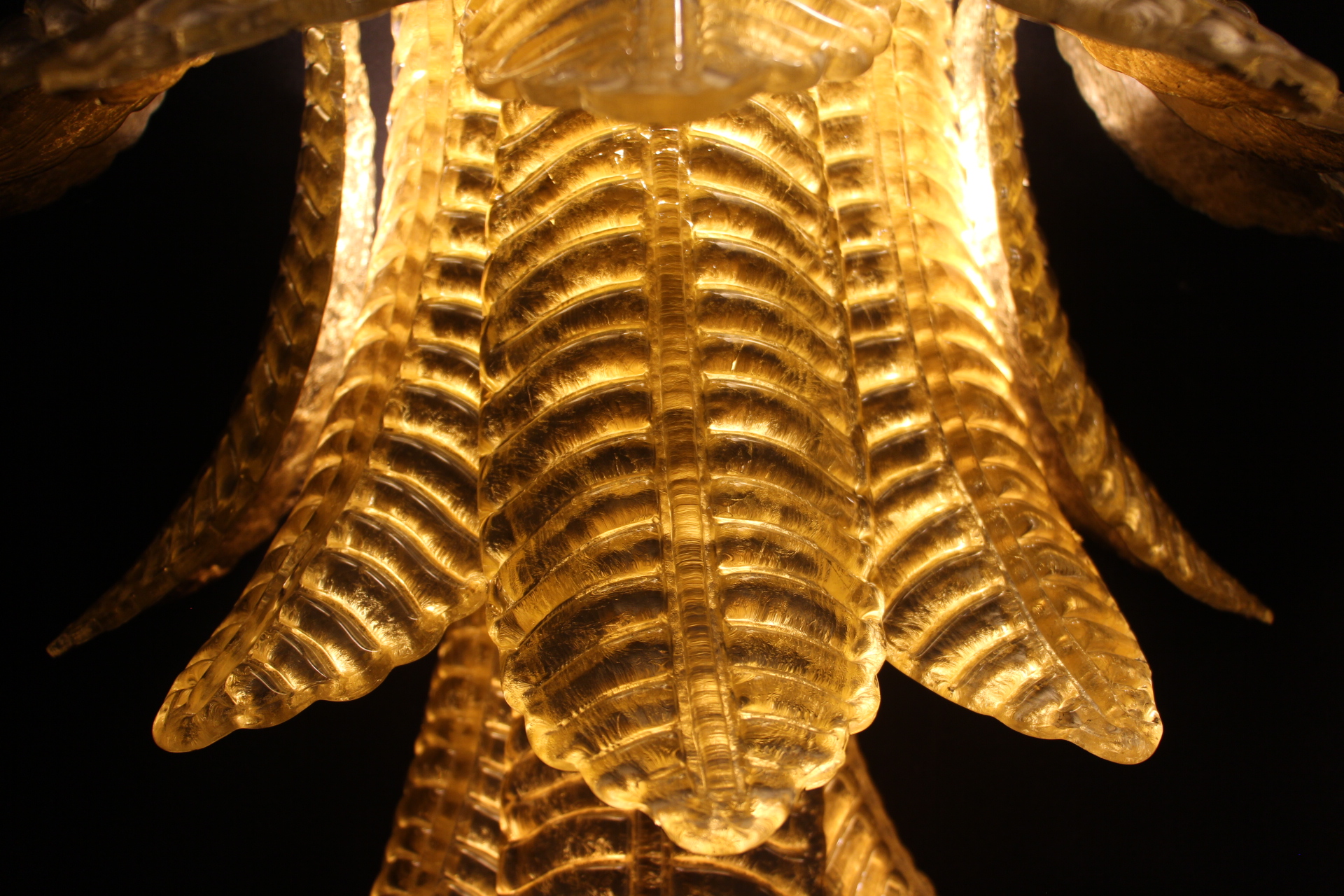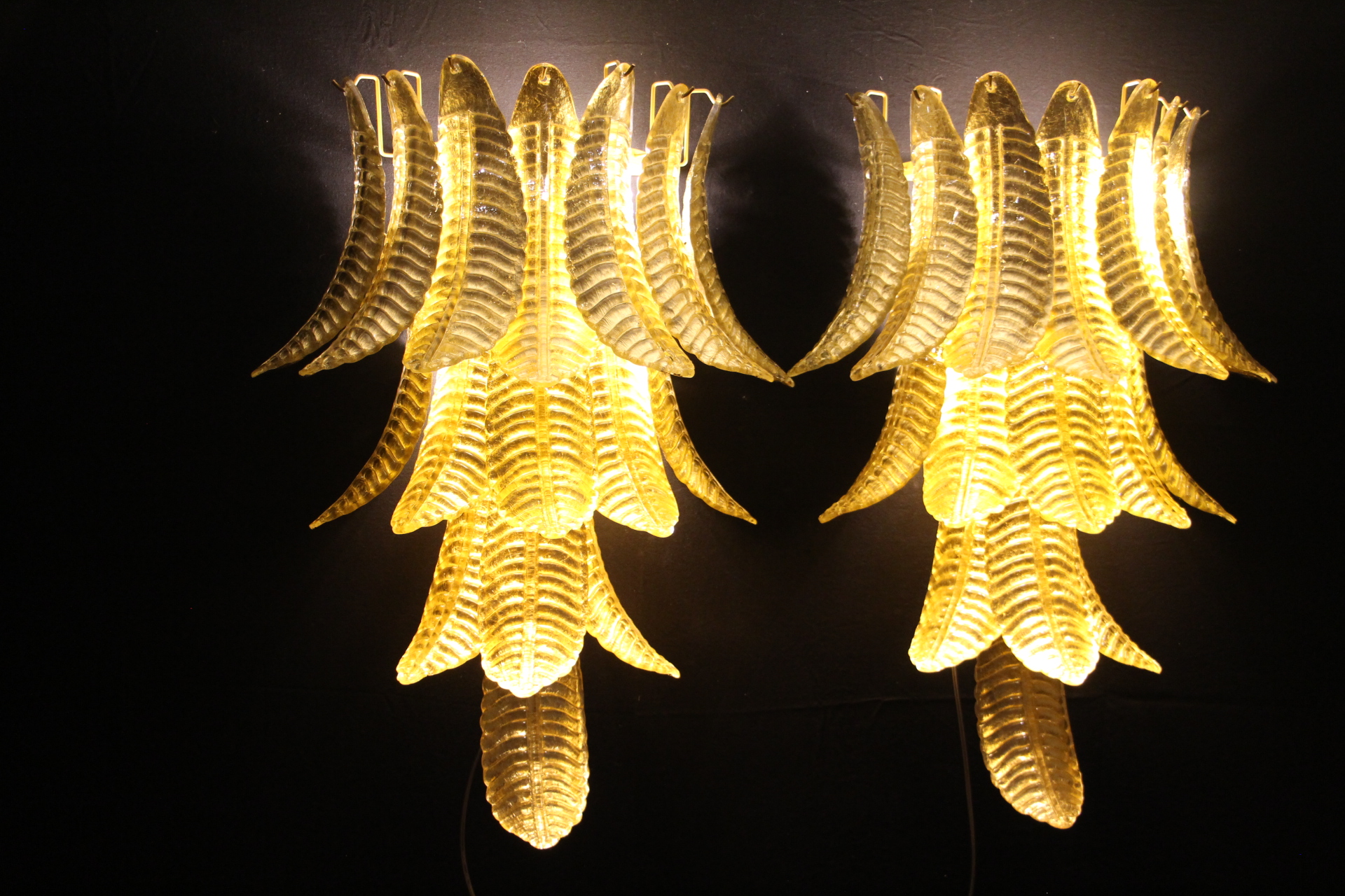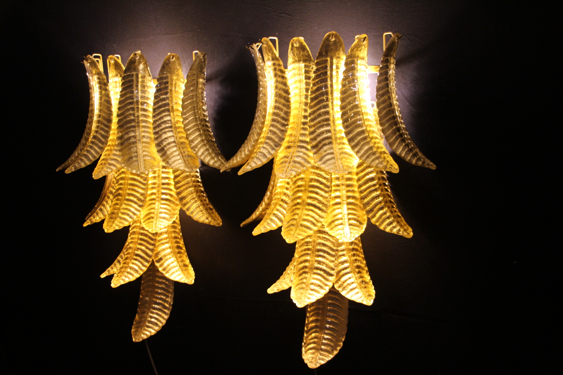 Cette spectaculaire paire d’appliques longues a été entièrement fabriquée à la main à Murano. Chaque feuille a été individuellement fabriquée en verre soufflé de haute qualité, c’est pourquoi nous pouvons remarquer une très légère différence d’une pièce à l’autre. Sa couleur or a été réalisée grâce à la technique de la feuille d’or 24 carats. C’est un verre d’art de qualité supérieure et un éclairage très décoratif. En effet, cette paire d’appliques longues murales constituent des pièce de décoration, rayonnantes de beauté éteintes ou éclairées . De plus, elles peuvent être utilisées dans toutes les pièces. Leur lumière est chaleureuse et très agréable. 4 ampoules par applique sont nécessaires.