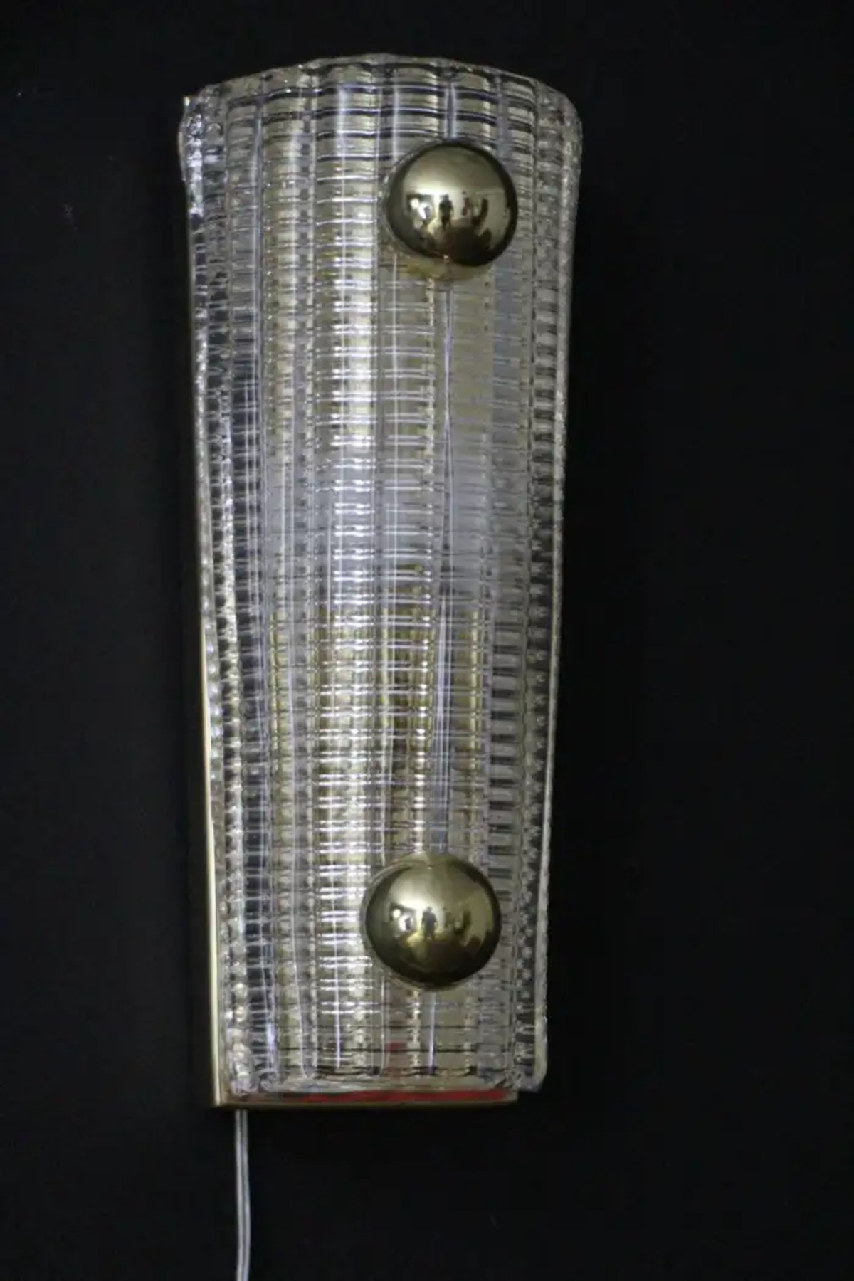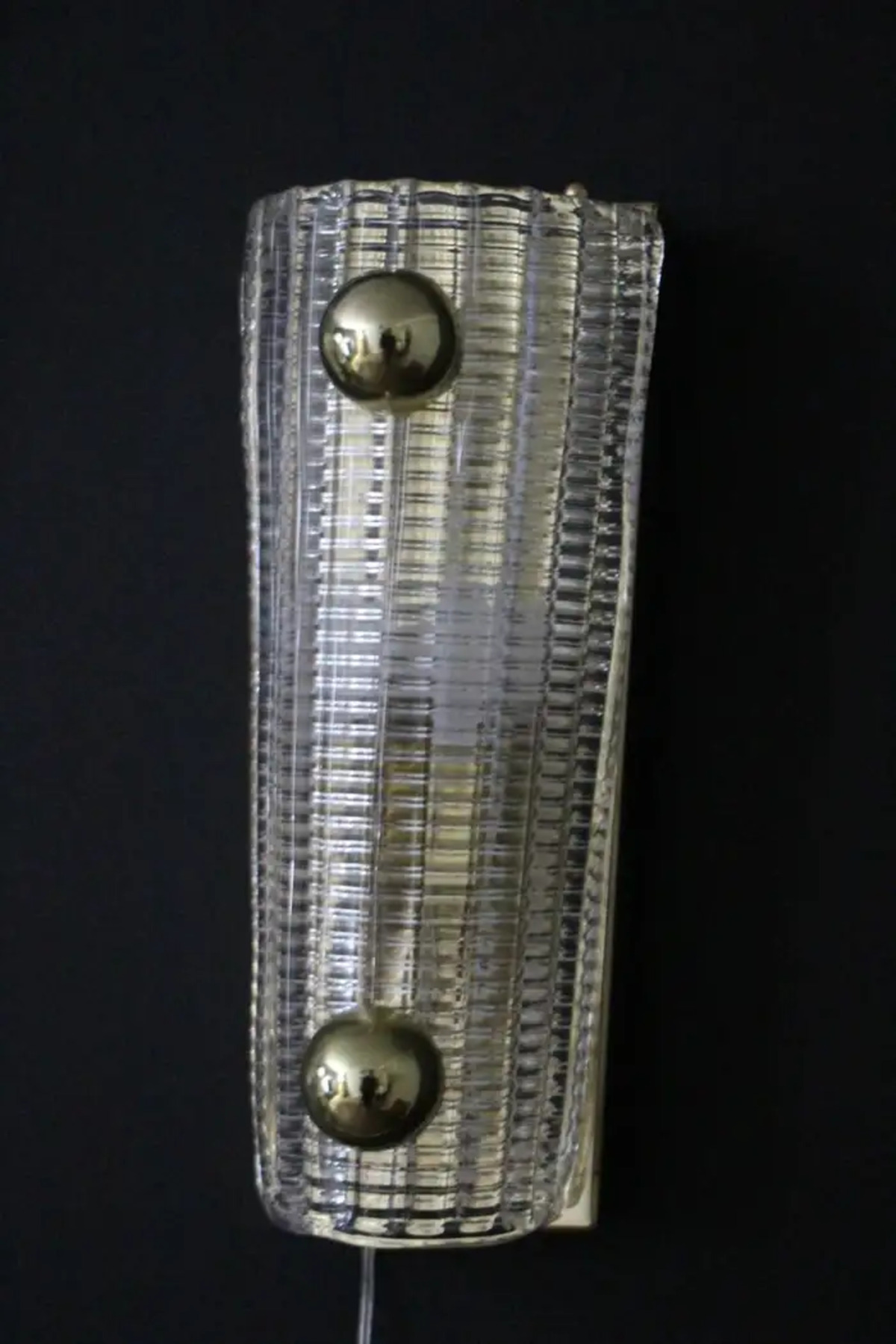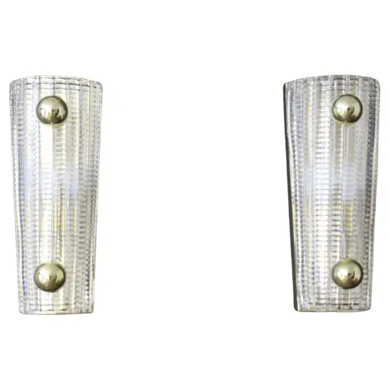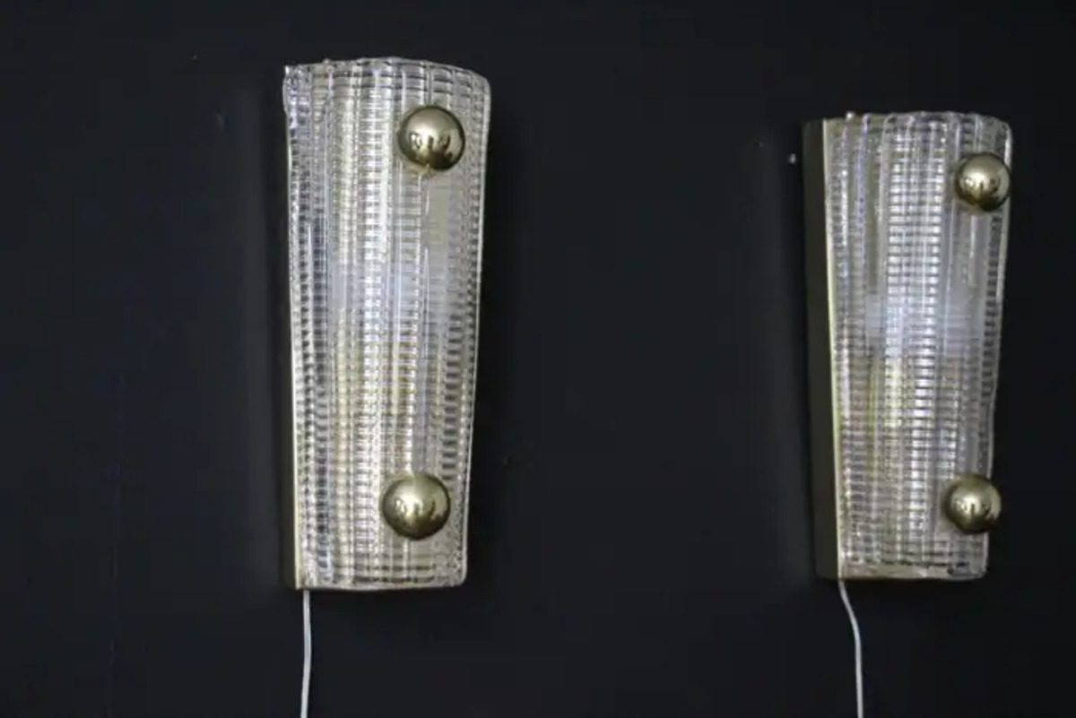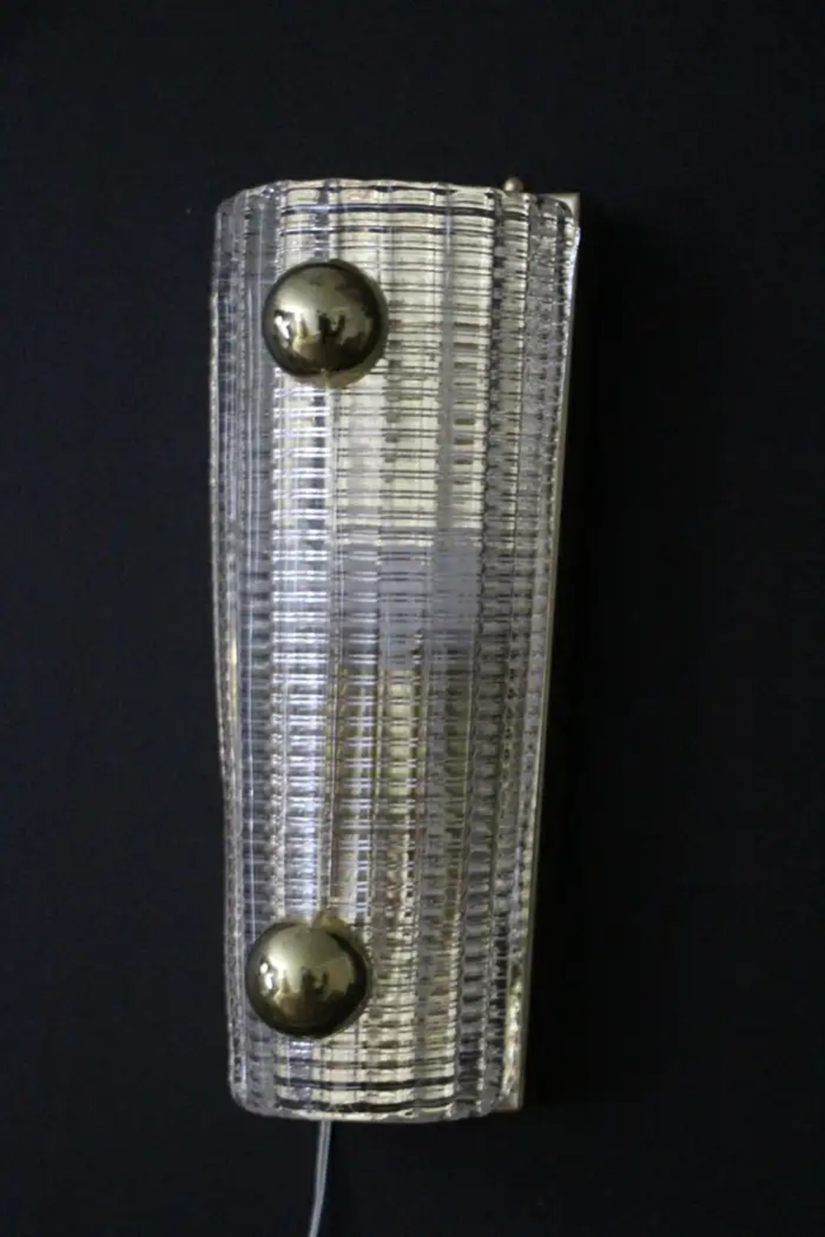 Cette magnifique paire d’appliques a été fabriquée à Murano . Elles présentent un aspect classique et très moderne à la fois grâce à leur beau verre de cristal texturé. Leur forme est très stricte et s’adoucit grâce à ses boules en laiton doré.